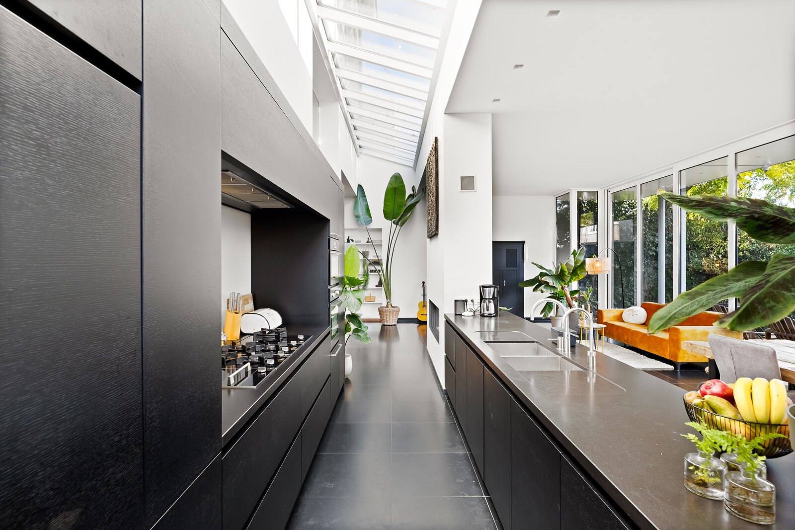 Het keukenblok, compleet met natuurstenen blad, Quooker, combi-oven/magnetron, wokbrander en ingebouwde frituur, is een droom voor culinaire liefhebbers. De ruimte tussen keuken en tuin is perfect voor een royale eettafel, terwijl een op maat gemaakte boekenkast functioneel en stijlvol oogt. De aangrenzende bijkeuken biedt extra kastruimte en aansluitingen voor wasmachine en droger, plus een douche-ruimte ideaal voor een sauna of als toevoeging bij de naastgelegen slaap-/werkkamer.