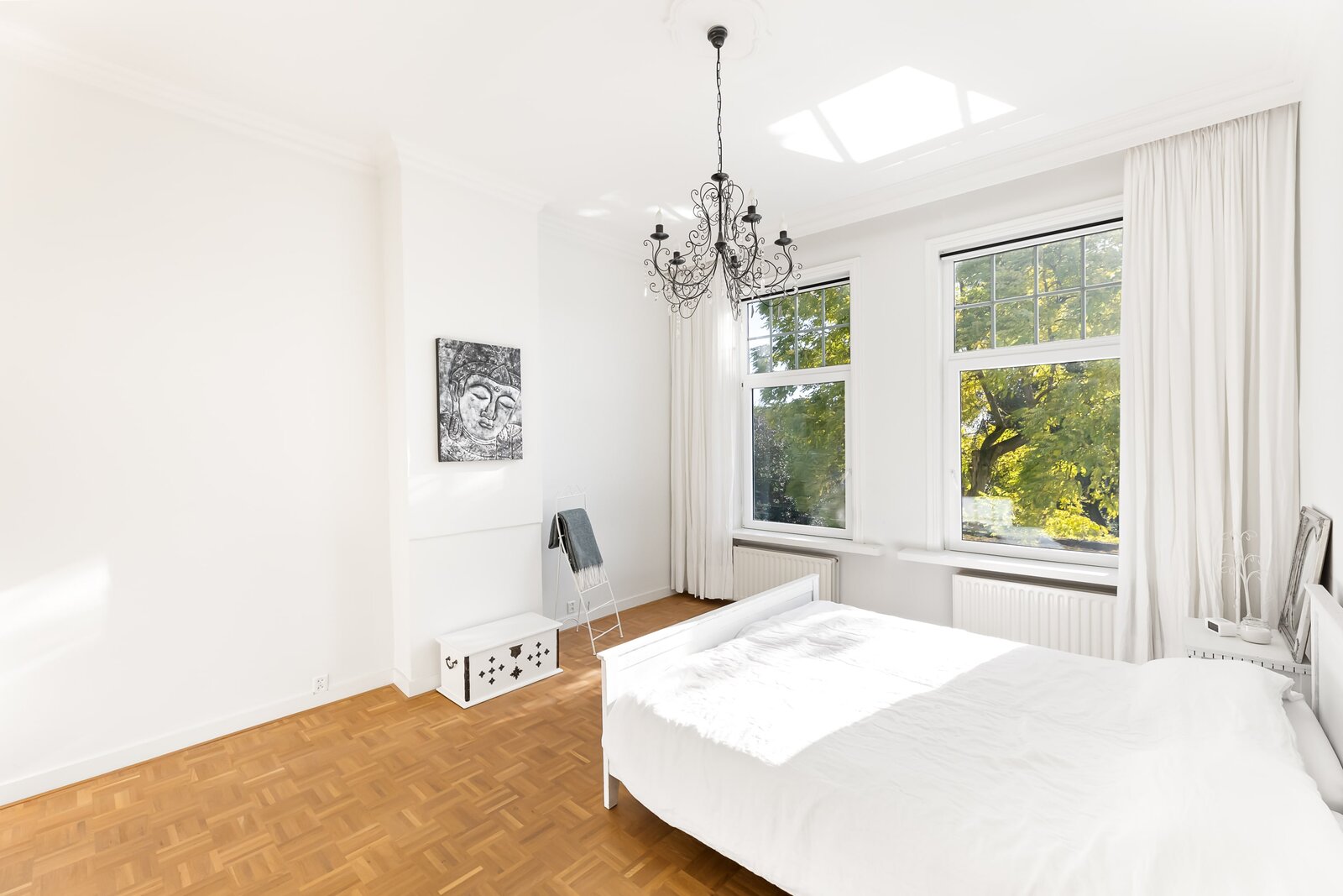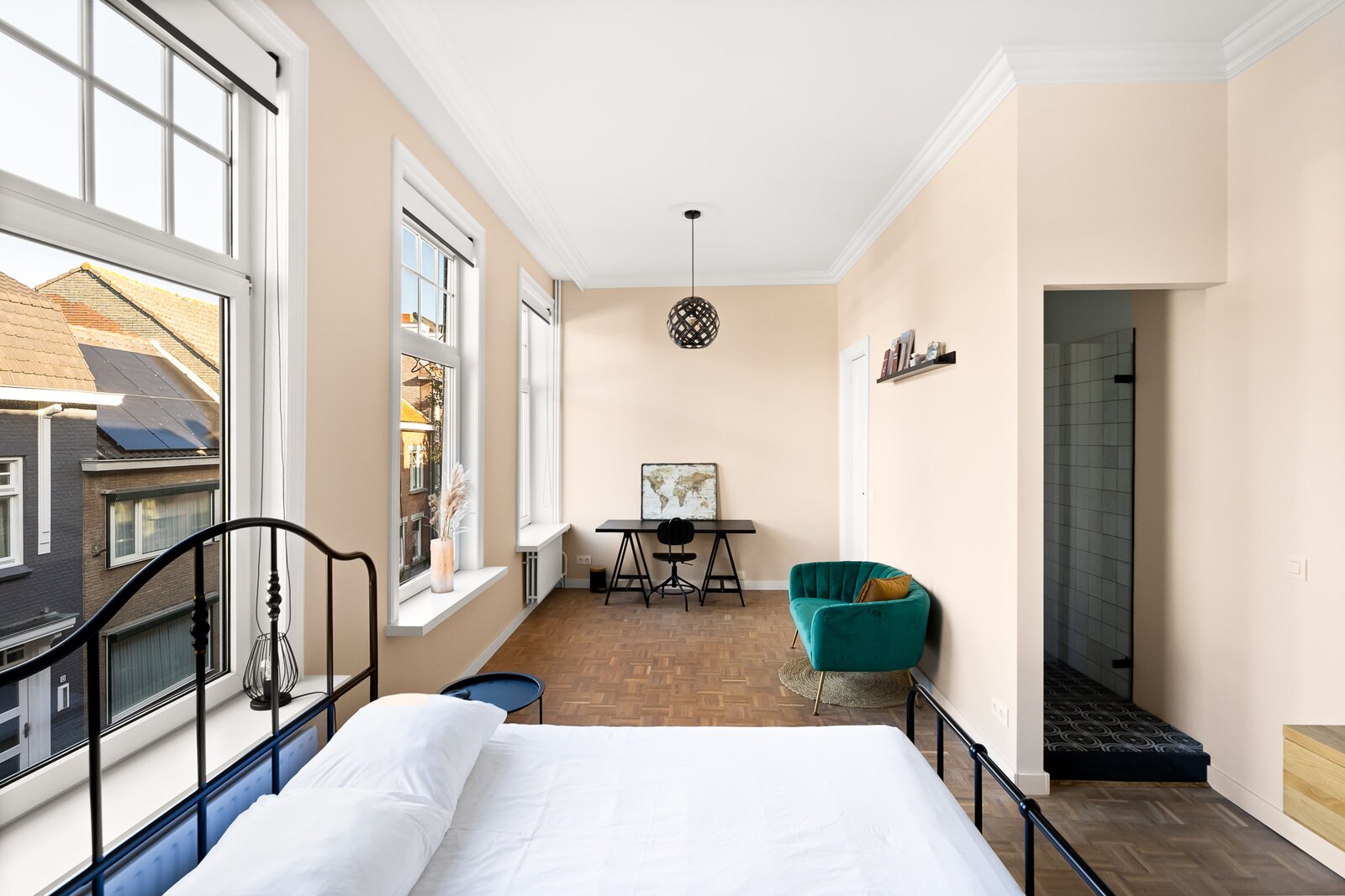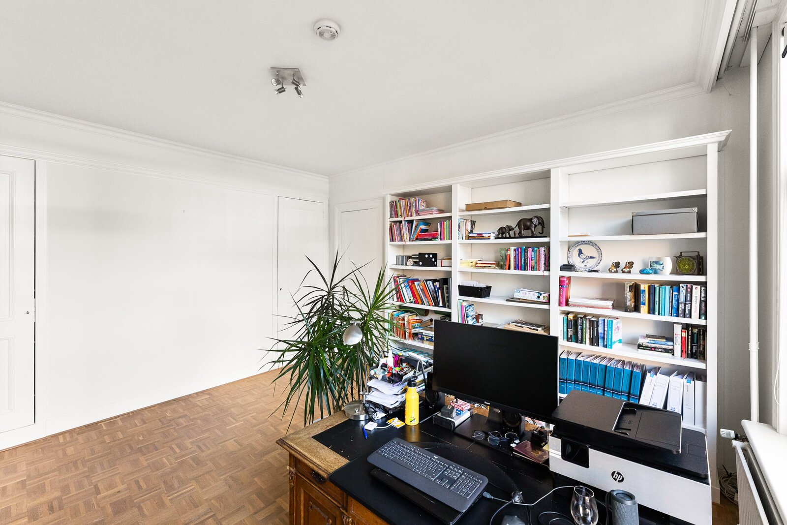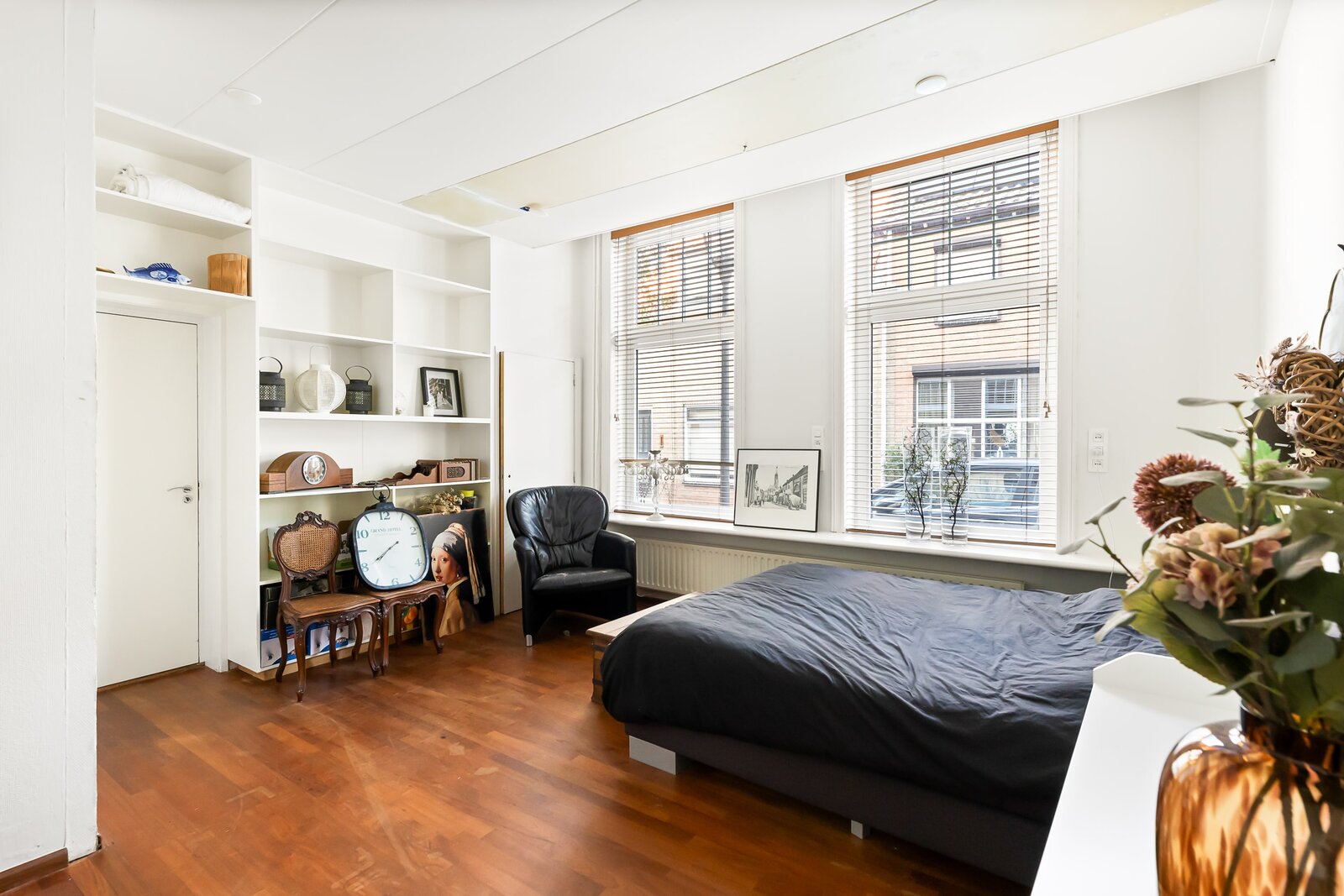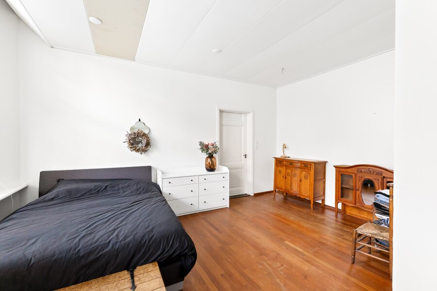 Direct rechts in de hal bevindt zich een royale slaapkamer of kantoorruimte, ideaal voor werken aan huis of gasten. Deze ruimte is ook bereikbaar via een tweede hal, waardoor het flexibel in gebruik is en volledig los te koppelen van de rest van de woning. De vloer is afgewerkt met warm teak parket, wat bijdraagt aan een luxe en huiselijke sfeer.