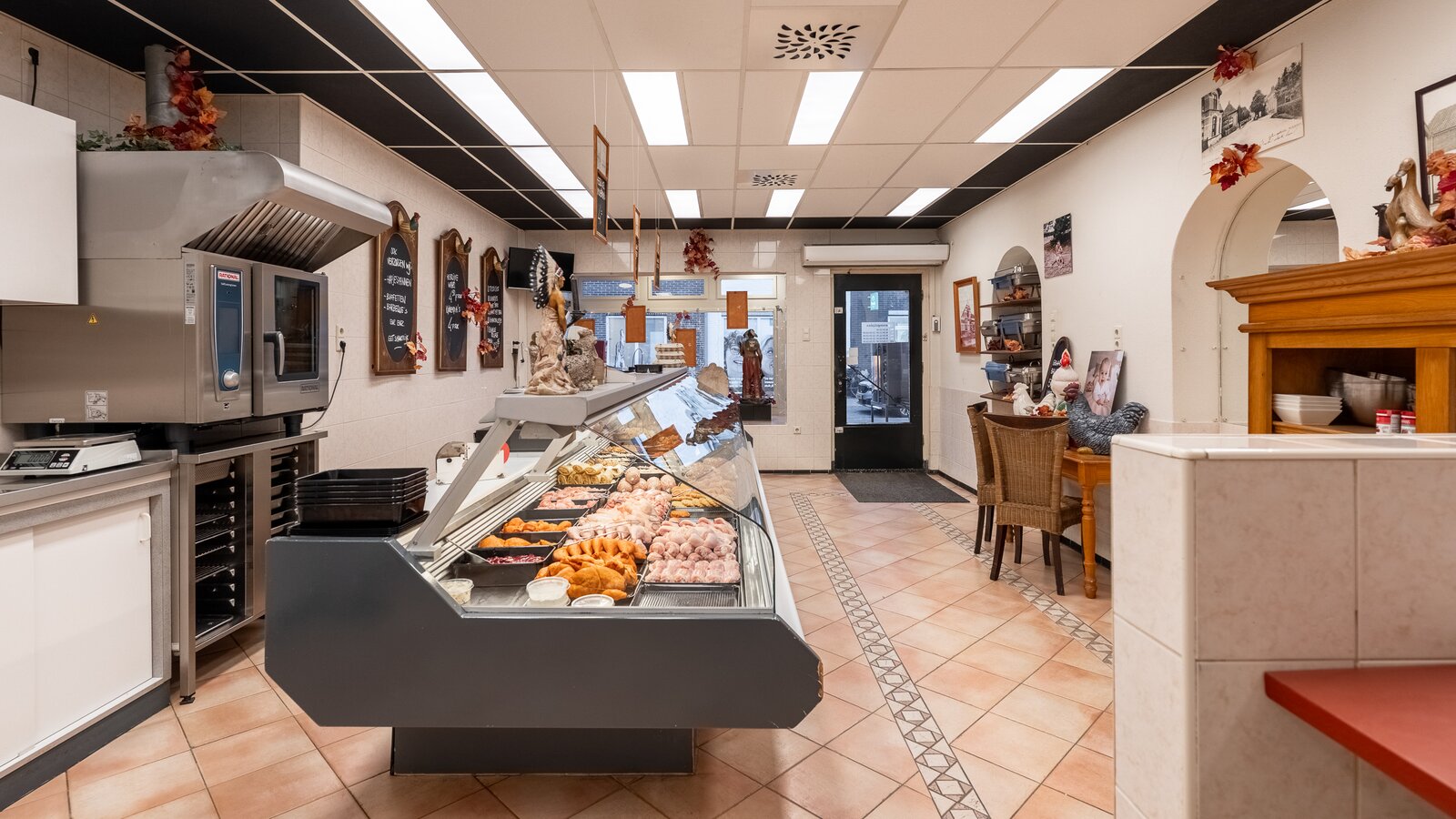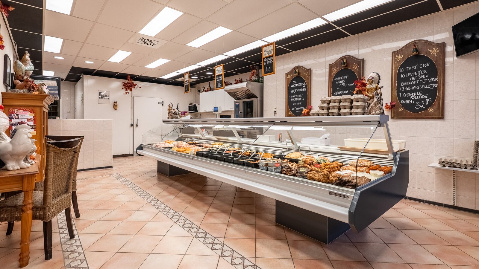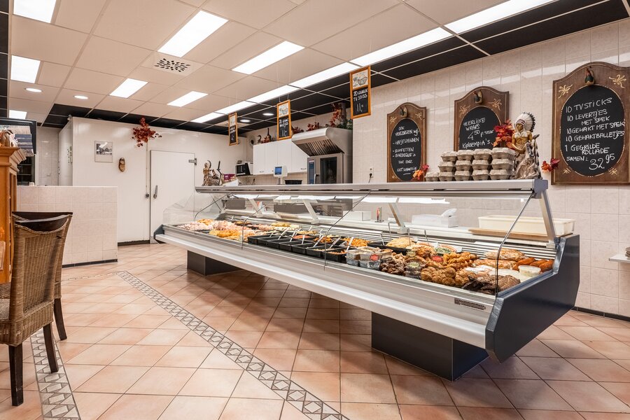 Aan de achterzijde bevindt zich een magazijn met een tweede koelcel, toiletruimte, diverse opslagmogelijkheden en toegang tot de kelder van maar liefst 27 m². Via de tussenhal en extra kamer bereikt u de achter-entree met de trap naar de bovenwoning.
