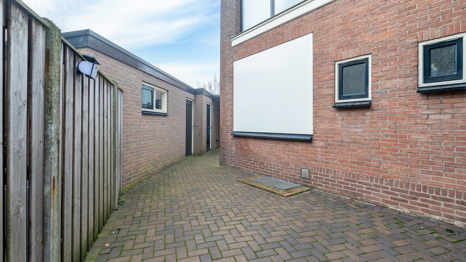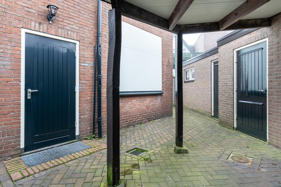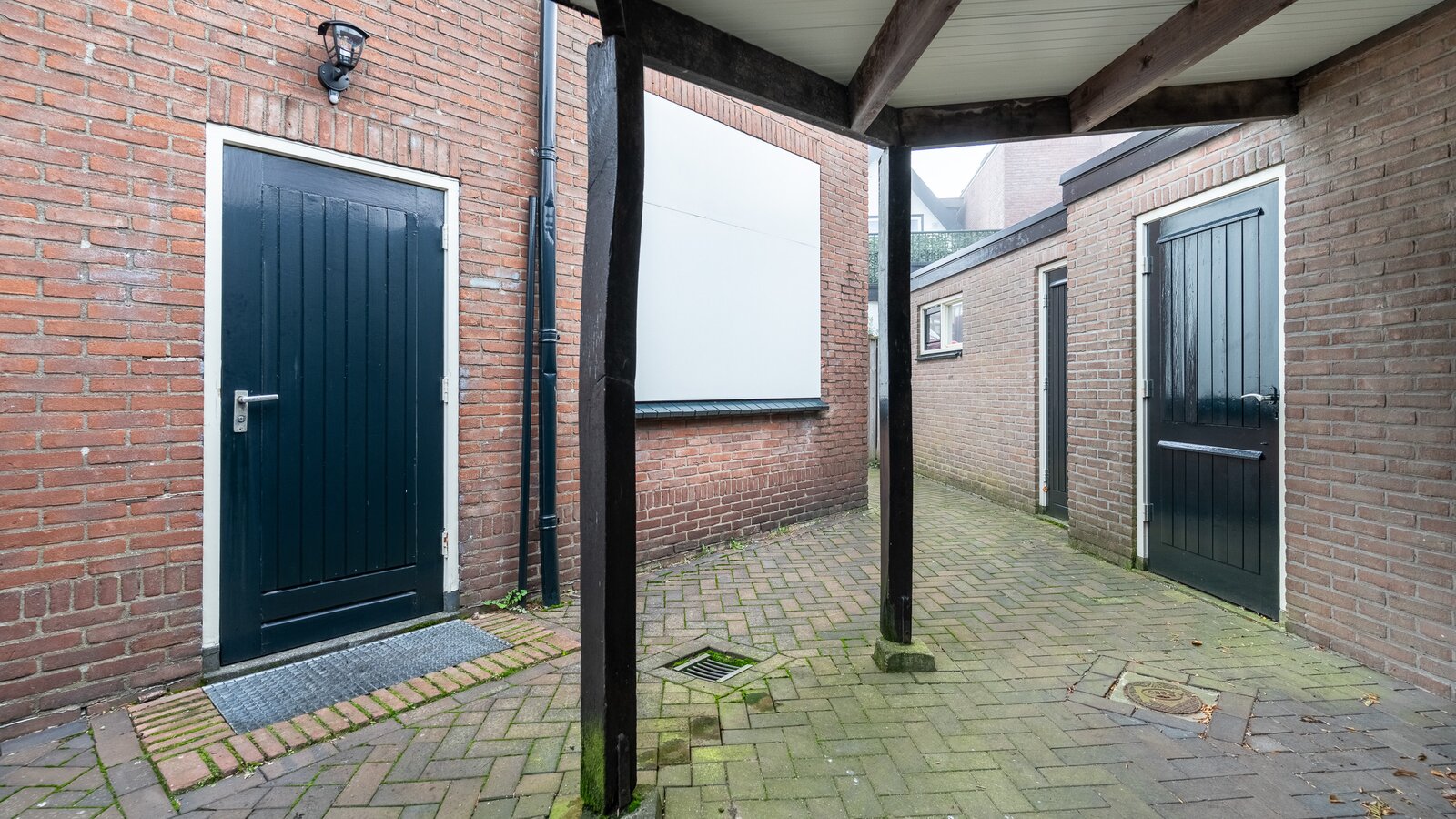 Via het pad naast de woning bereikt u de beschutte binnenplaats met twee schuren – ideaal voor opslag of hobbyruimte. Ook vanuit het magazijn is deze buitenplaats bereikbaar.