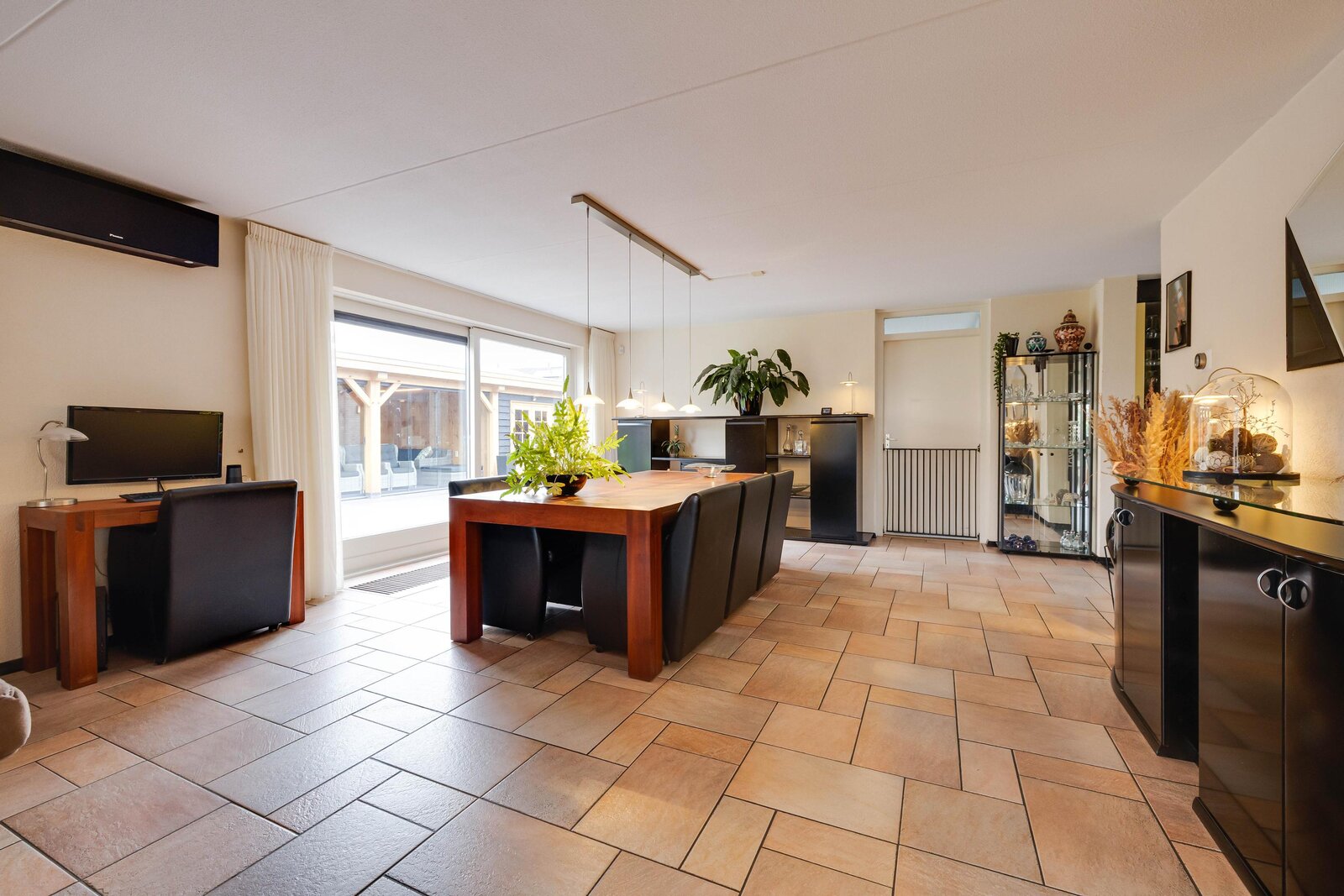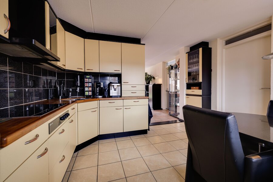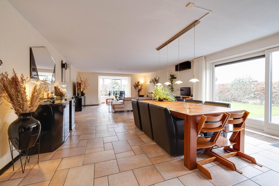 Begane grond: Ruime entree in de hal met toilet, garderobe en bergruimte. Vanuit de hal stapt u de zeer royale, lichte en tuingerichte woonkamer binnen. De woonkamer is voorzien van een sfeervolle erker, een comfortabele airconditioning en een brede schuifpui die direct toegang geeft tot de tuin. De ruime woonkeuken is centraal gepositioneerd en uitgerust met diverse inbouwapparatuur, waaronder een inductiekookplaat, oven, magnetron en koelkast. Vanuit de keuken is er een doorloop naar de praktische bijkeuken, die verrassend genoeg is voorzien van een tweede, complete keukenopstelling. Via de bijkeuken bereikt u binnendoor de ruime garage. Terug in de woonkamer is er tevens toegang tot een multifunctionele extra kamer, ideaal te gebruiken als werkkamer, speelkamer voor de kinderen of als praktijkruimte, eveneens met een eigen schuifpui naar de tuin.