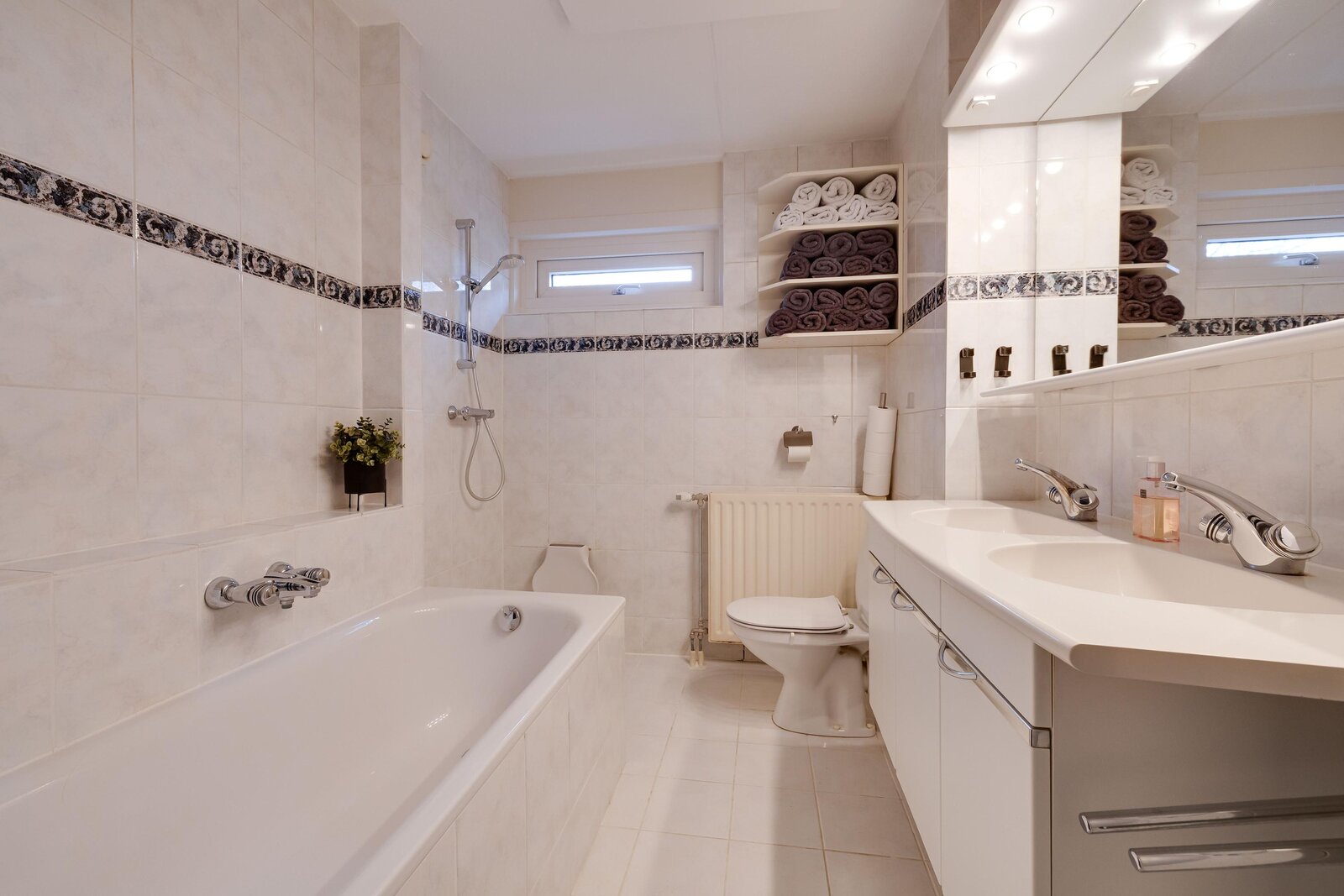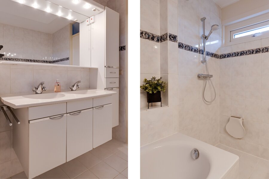 Eerste verdieping: Via de vaste trap bereikt u de ruime overloop. Deze verdieping telt maar liefst vier volwaardige slaapkamers, waarvan de hoofdslaapkamer is uitgerust met airconditioning. De complete badkamer is netjes en voorzien van alle comfort: een inloopdouche, een ligbad, een dubbel wastafelmeubel en een wandcloset.