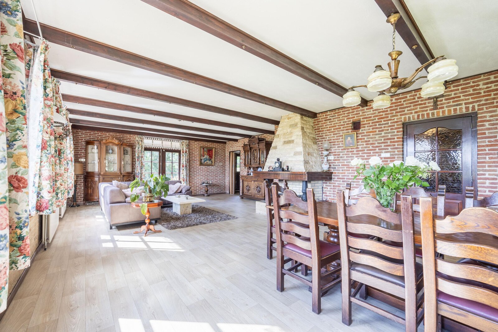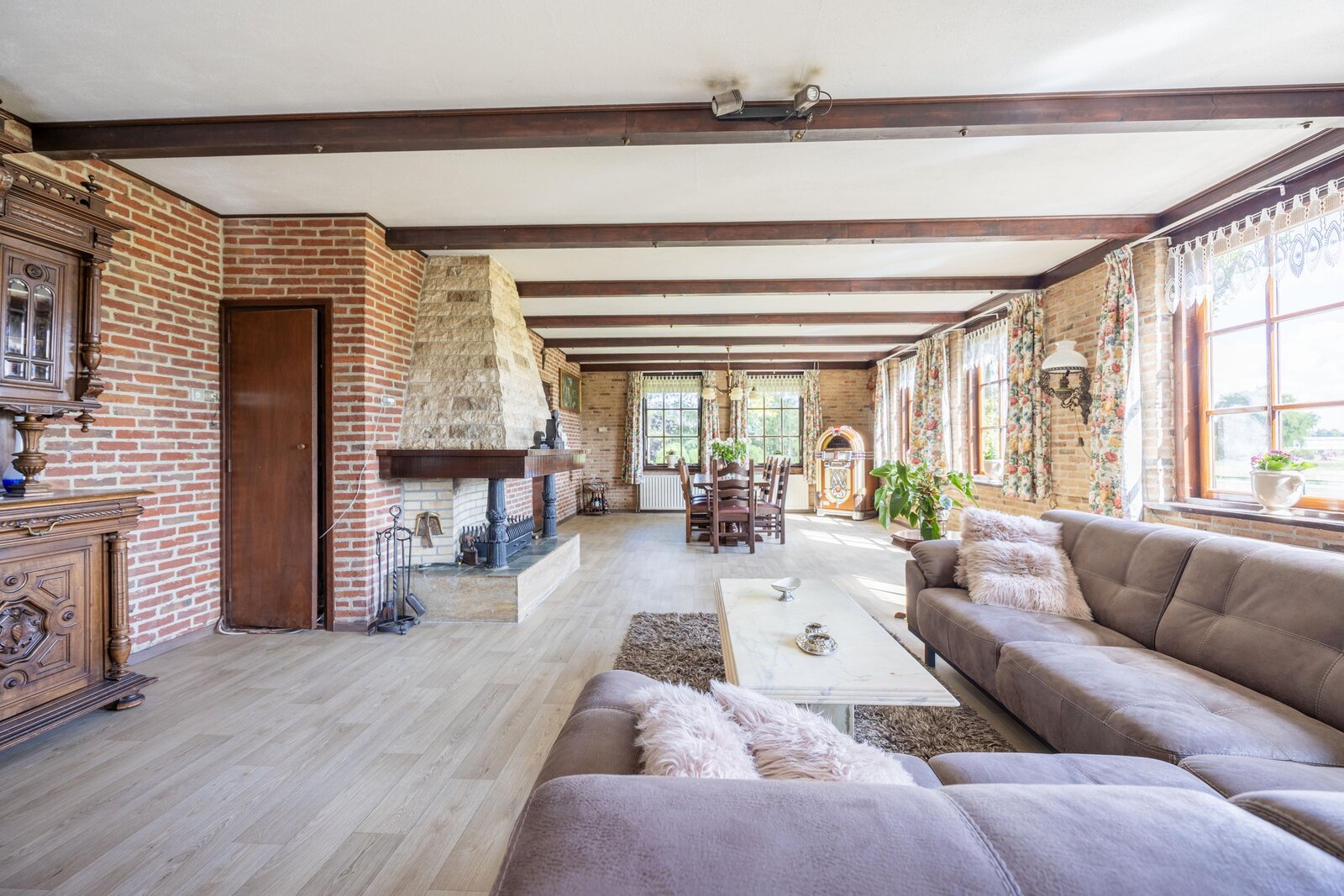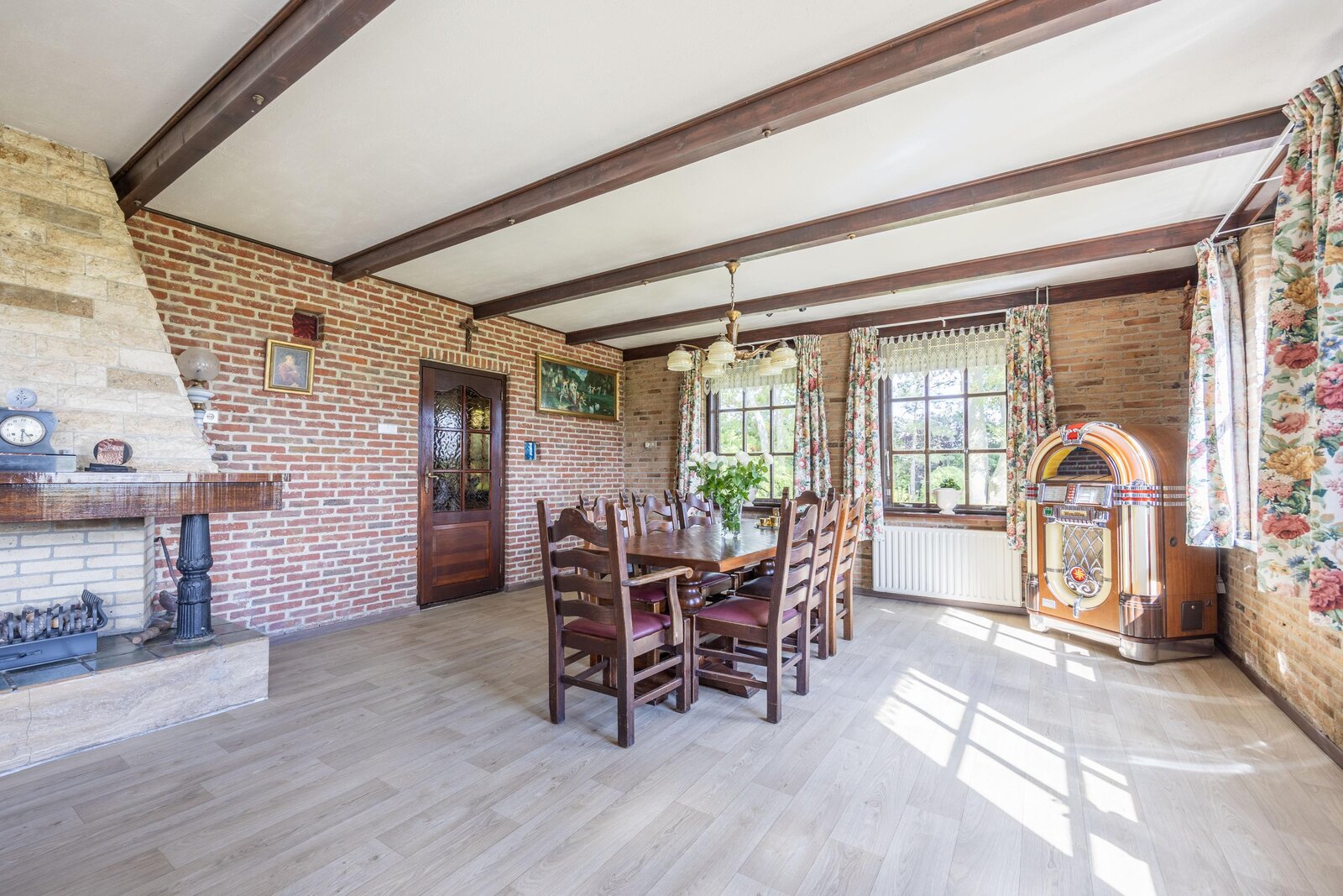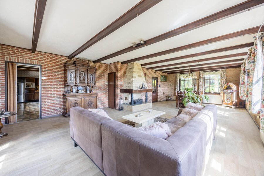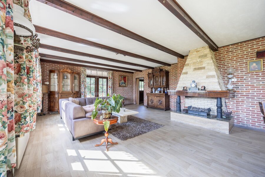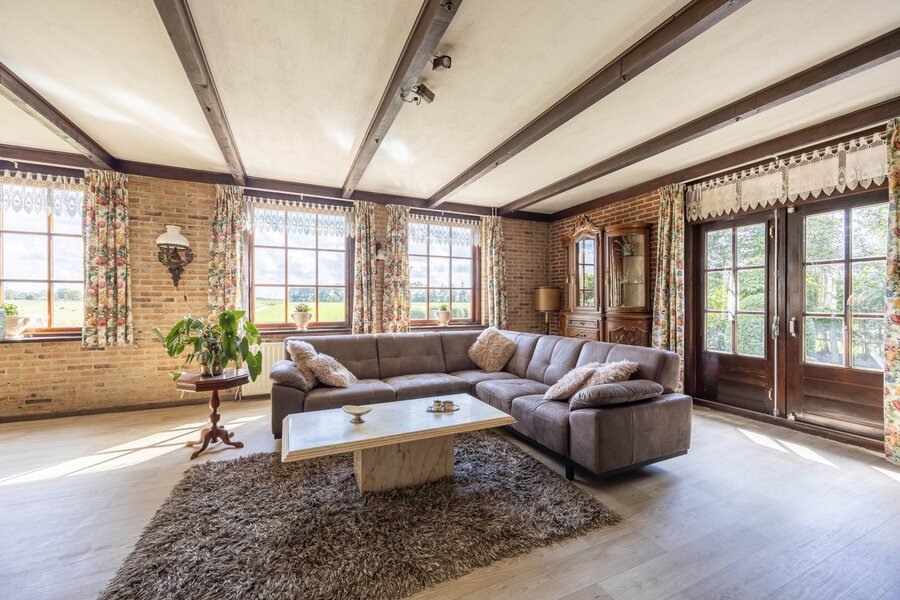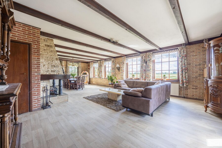 De lichte en royale woonkamer aan de voorzijde van het landhuis heeft grote ramen aan drie zijden en openslaande deuren naar de tuin. Hier geniet u van een prachtig uitzicht: enerzijds de eigen tuin, anderzijds het karakteristieke polderlandschap met slootjes en weilanden. De open haard met schouw vormt het sfeervolle hart van de kamer, precies tussen het zit- en eetgedeelte in.
