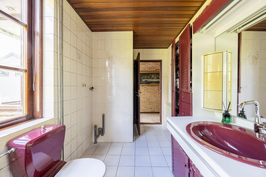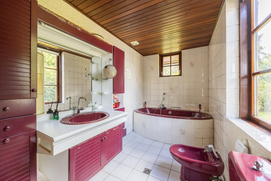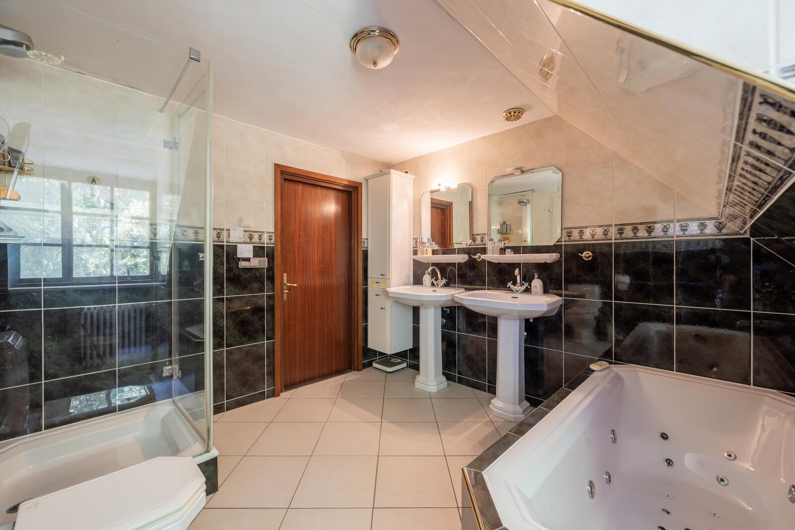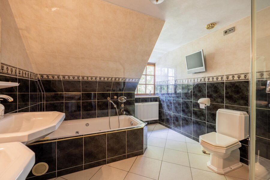 De badkamer is uitgevoerd met vloerverwarming en een groot raam in de dakkapel, en ingericht met whirlpoolbad, aparte douche, toilet, dubbele wastafel en een hoge kast.