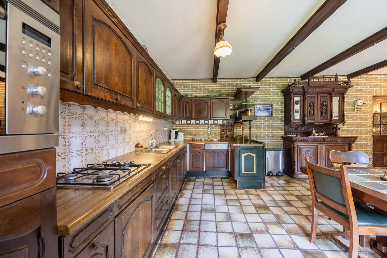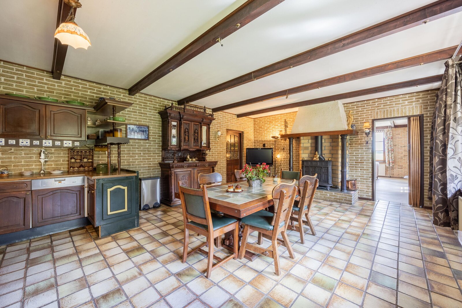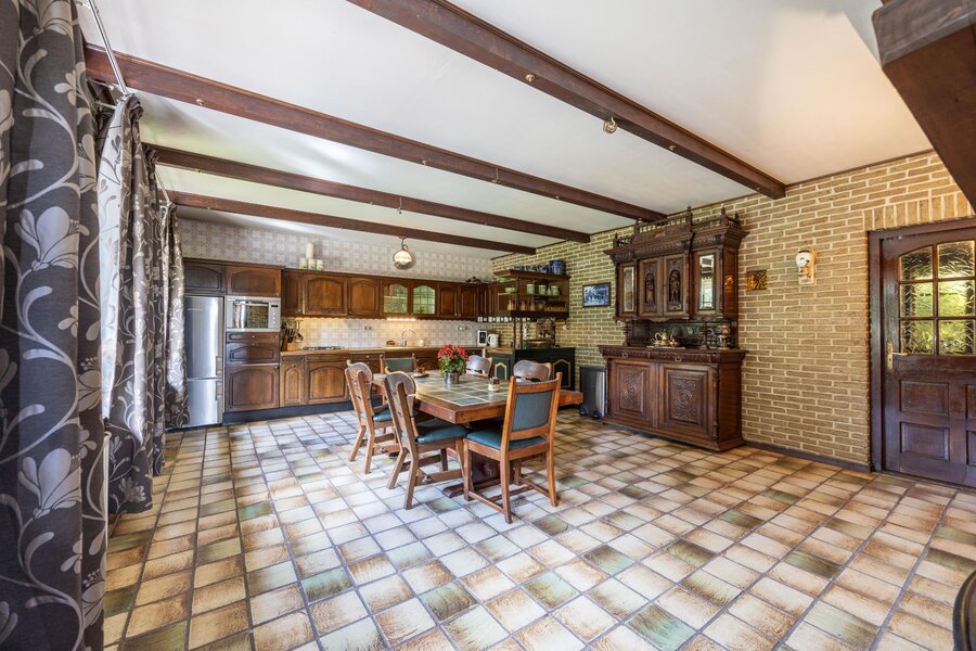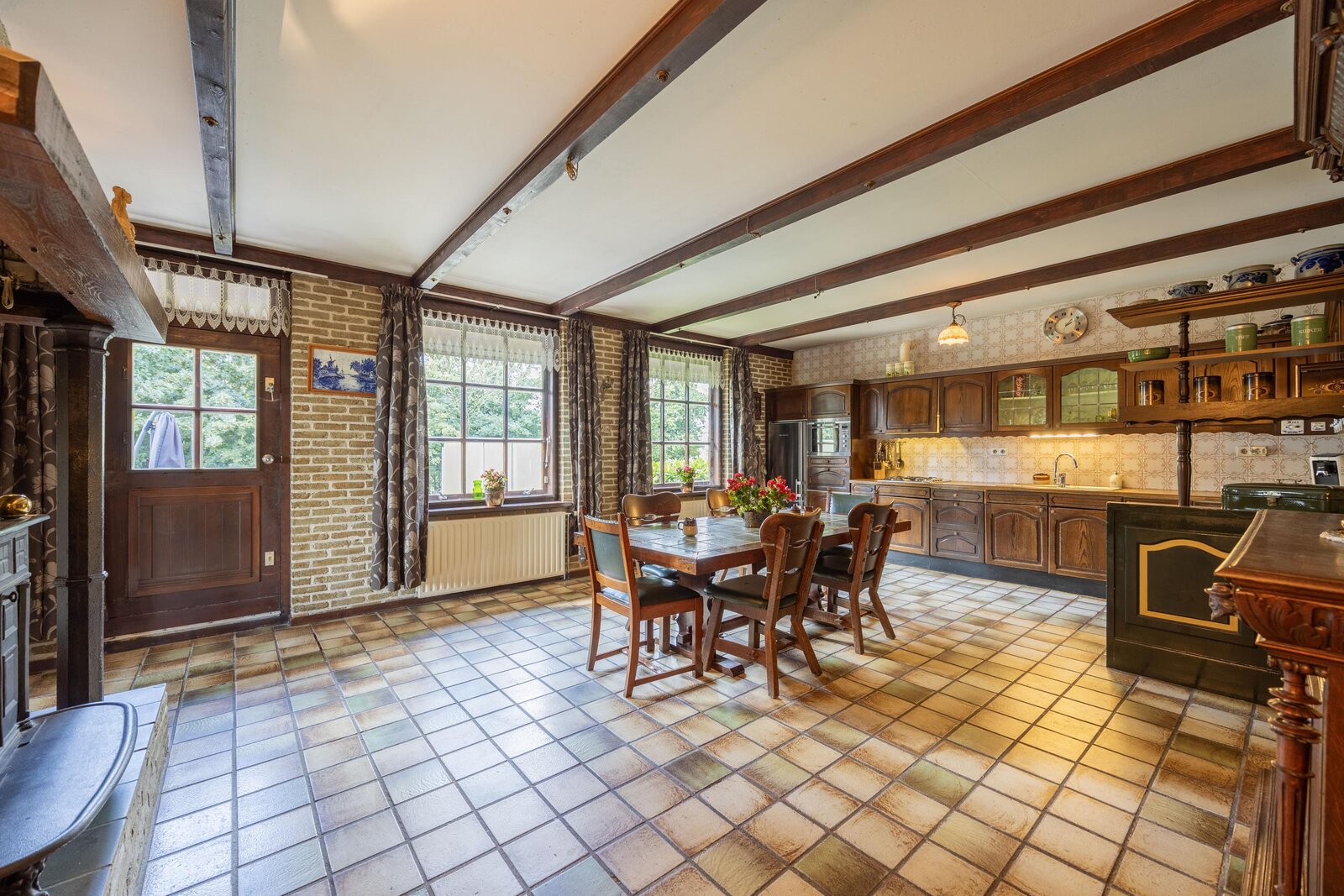 Vanuit zowel de hal als de woonkamer bereikt u de ruime woonkeuken. Ook hier verbinden openslaande deuren de ruimte met het zonnige terras op het zuidwesten. Authentieke details zoals het balkenplafond en ramen met roedeverdeling geven de keuken karakter, terwijl de massief eiken inrichting met inbouwapparatuur compleet wordt gemaakt door de schouw met grote kachel als absolute blikvanger.