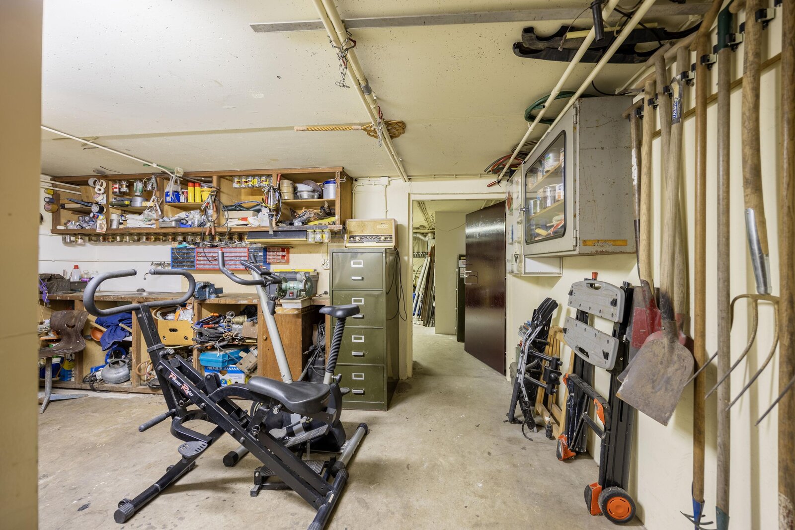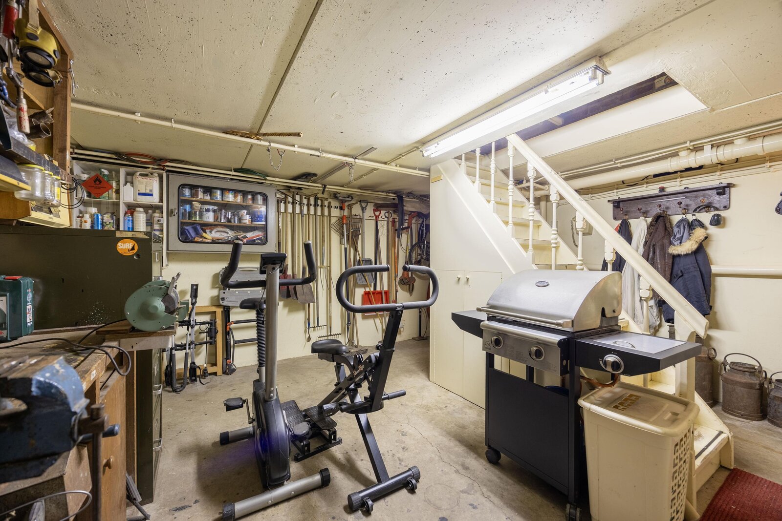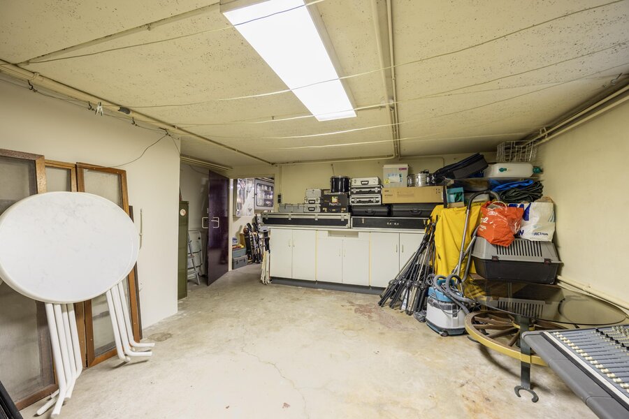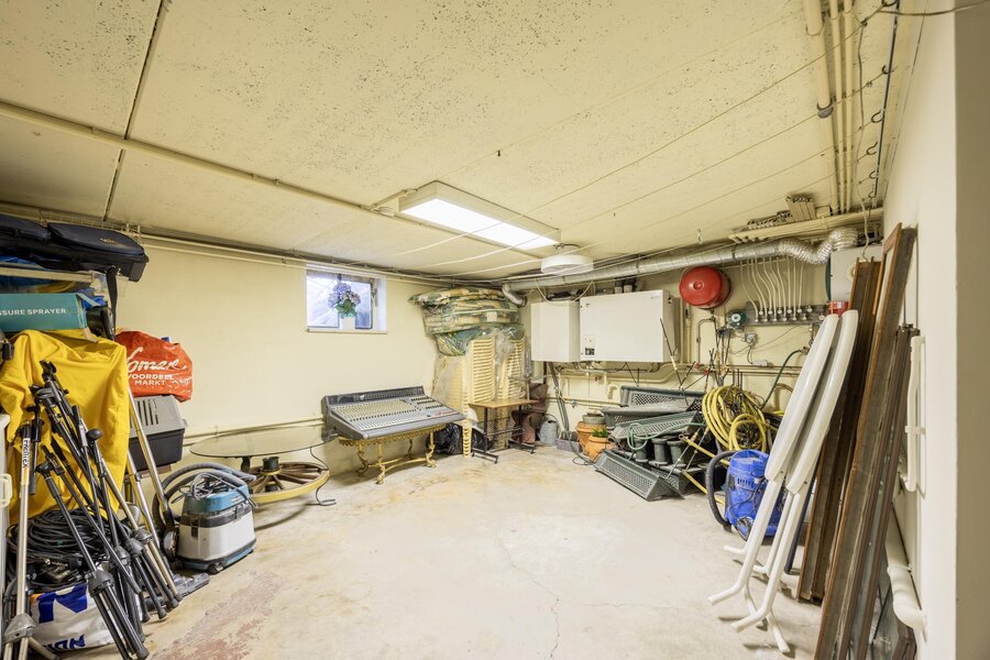 Wat u aan de buitenzijde nauwelijks ziet, is het zeer ruime en multifunctionele souterrain. Vanuit de hal leidt een vaste trap naar een grote ruimte, die momenteel dienstdoet als berging en hobbyruimte. Aan de voorzijde bevindt zich een tweede kelderruimte met de opstelling van de HR-ketel en boiler.