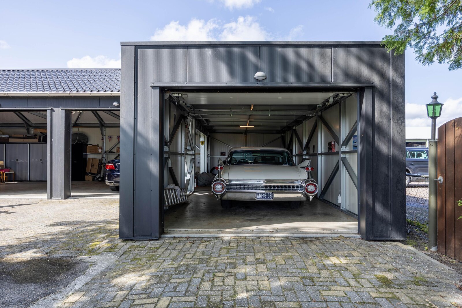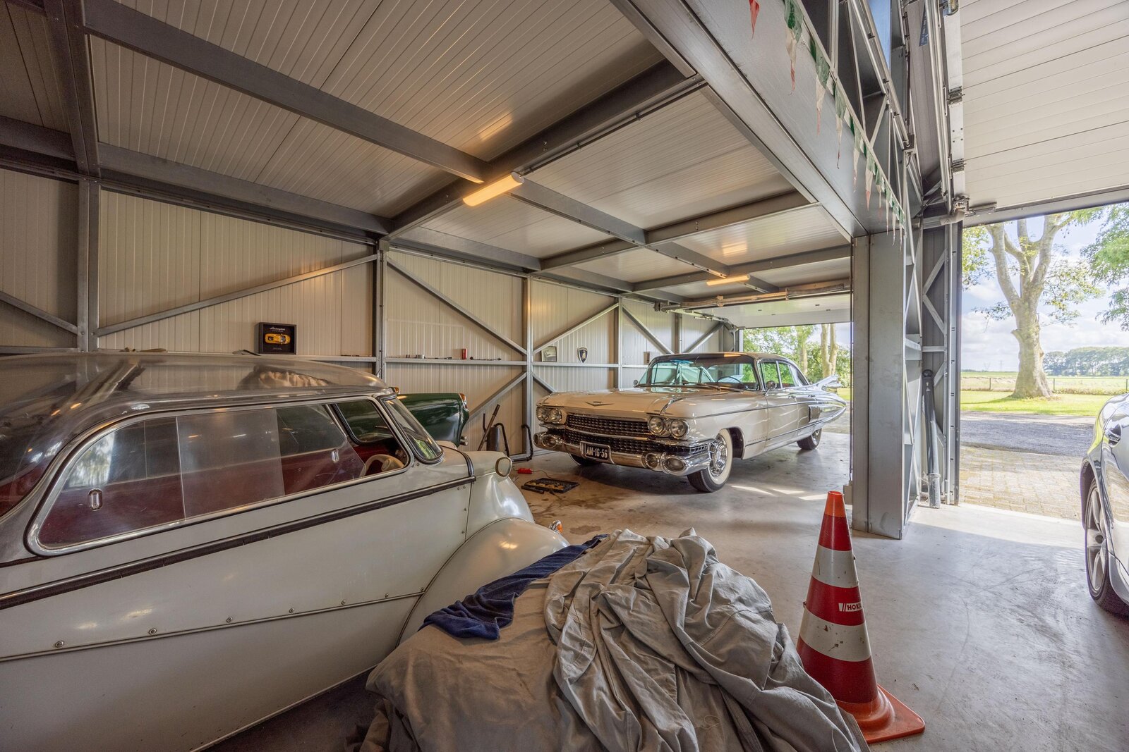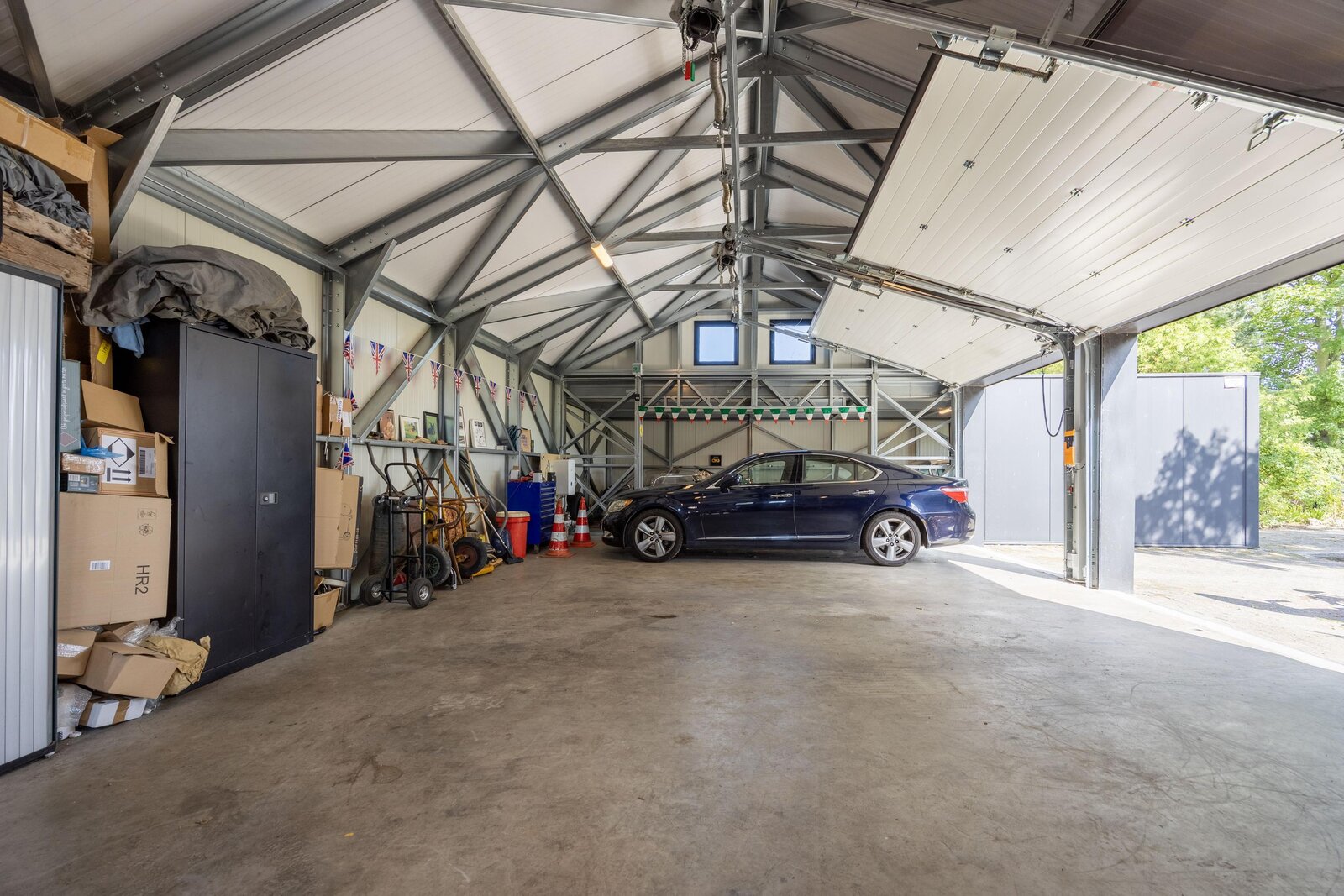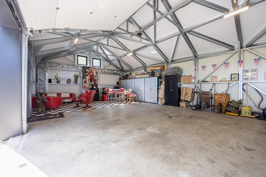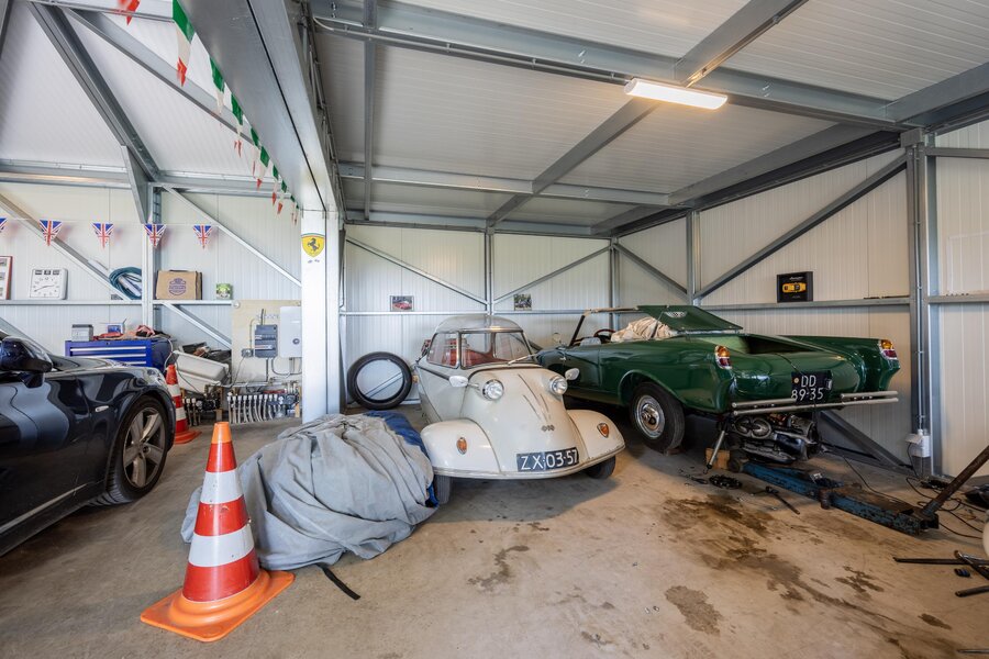 Op het perceel staat een ruime en moderne loods van circa 147 m² BVO, voorzien van drie elektrisch bedienbare sectionaaldeuren en een hoogte van circa 4,60 meter. Via de brede oprijlaan rijdt u moeiteloos naar binnen, ook met een bus met aanhanger of ander groot voertuig. De loods is gebouwd met geïsoleerde sandwichpanelen en voorzien van vloerverwarming en elektra – praktisch en comfortabel, want voertuigen drogen direct op bij binnenkomst.