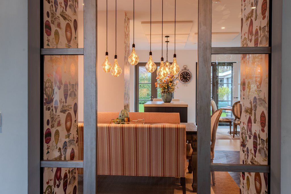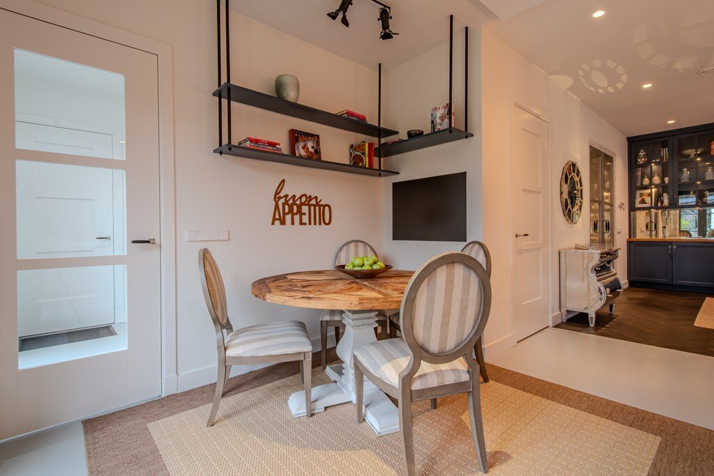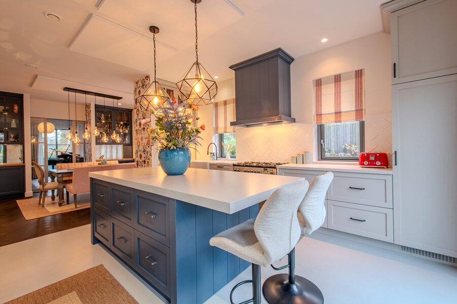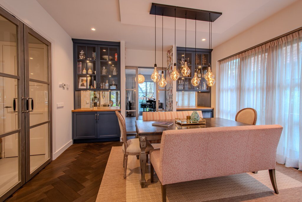 Elegant ingerichte keuken en eetruimte met bar