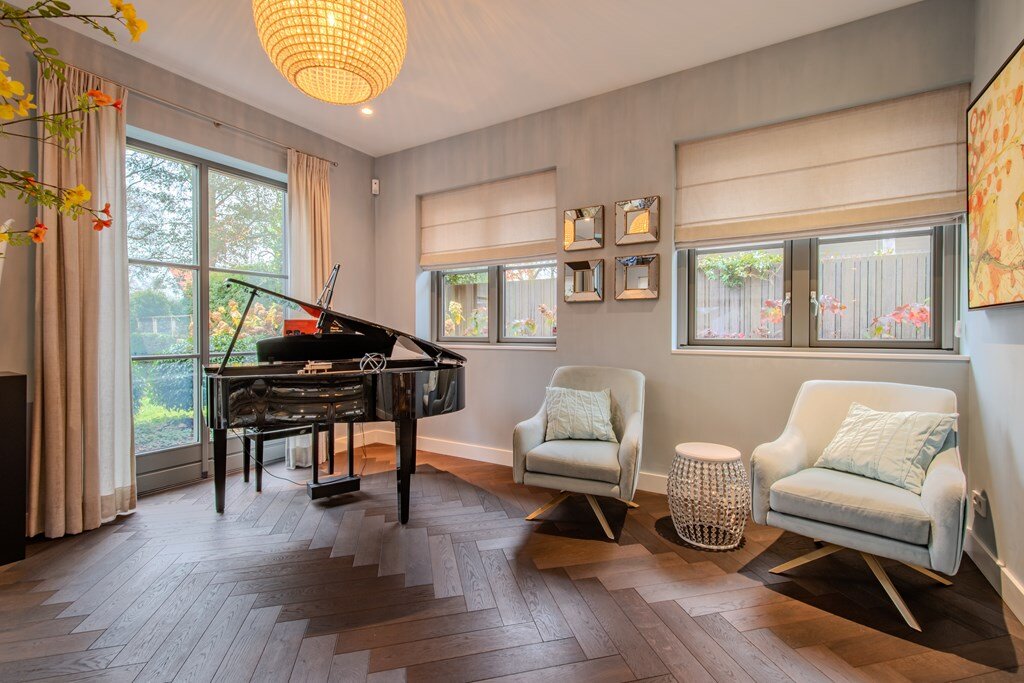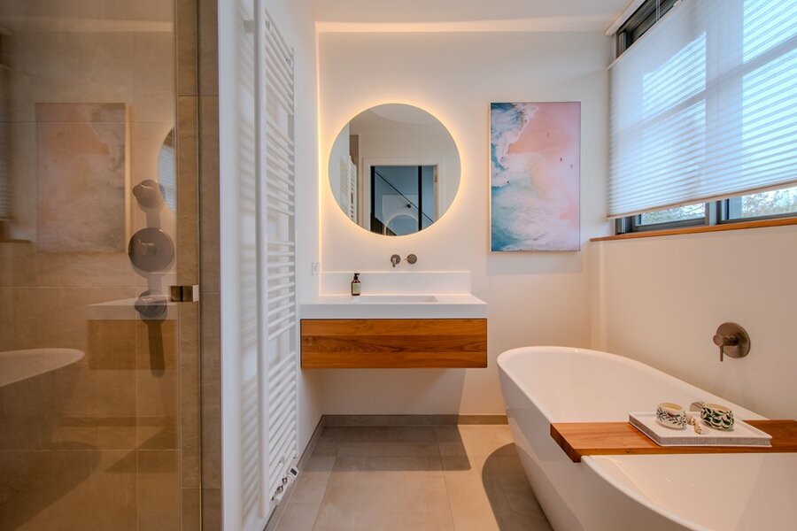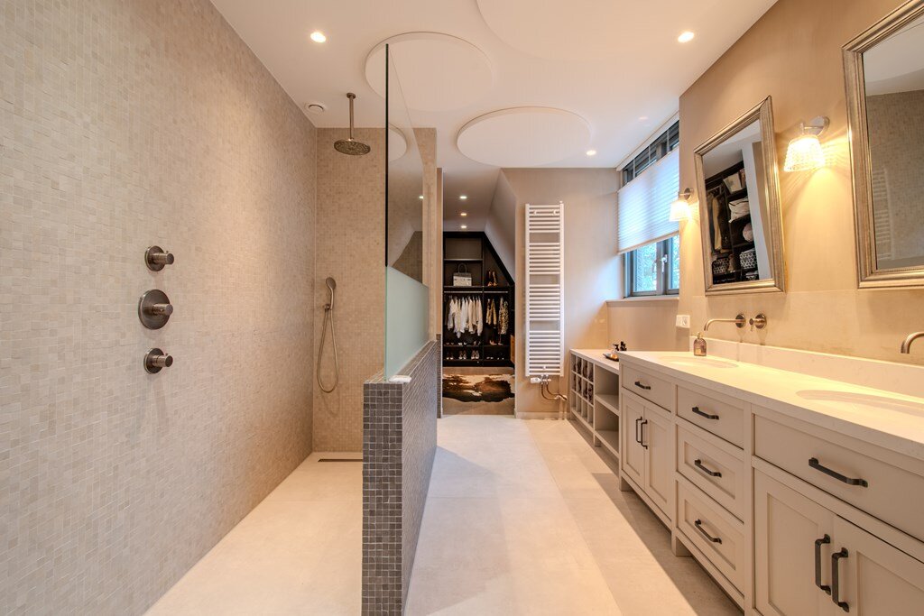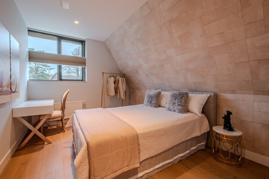 Op de eerste verdieping bevindt zich de hoofd slaapkamer, een ware oase van rust, compleet met en-suite kleedruimte en een luxueuze badkamer. De badkamer beschikt over een vrijstaand ligbad en een ruime inloopdouche, waardoor een privé-spa-ervaring in hotelstijl ontstaat. Twee extra slaapkamers delen een tweede, elegant afgewerkte badkamer met ligbad en inloopdouche.