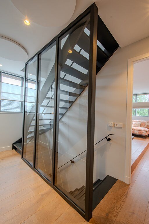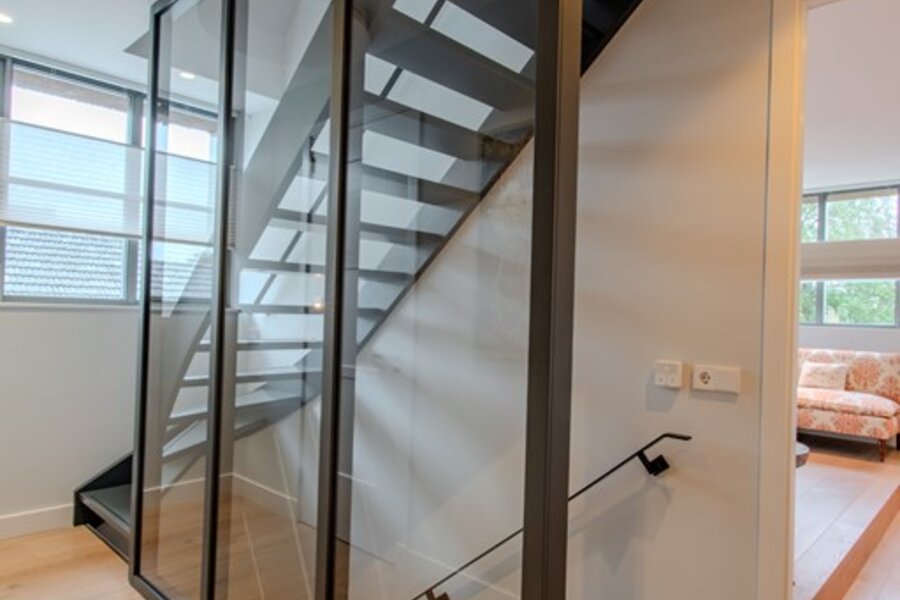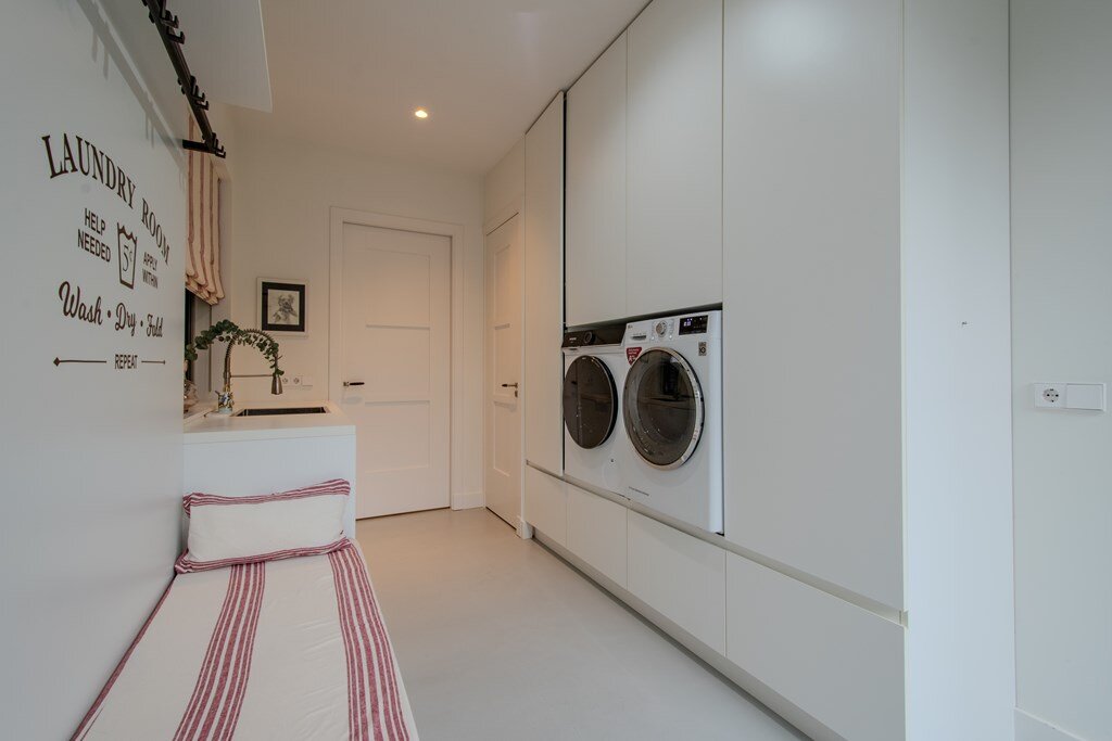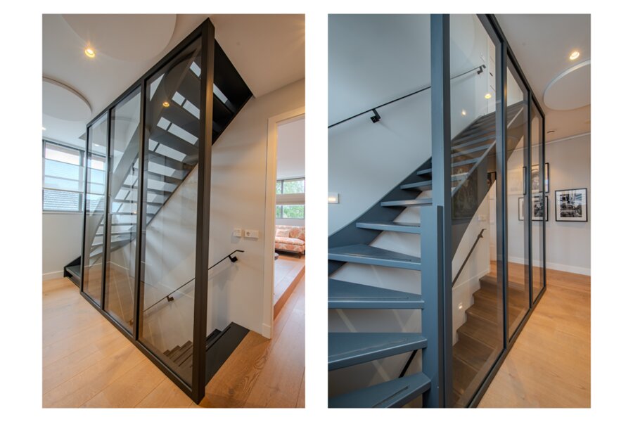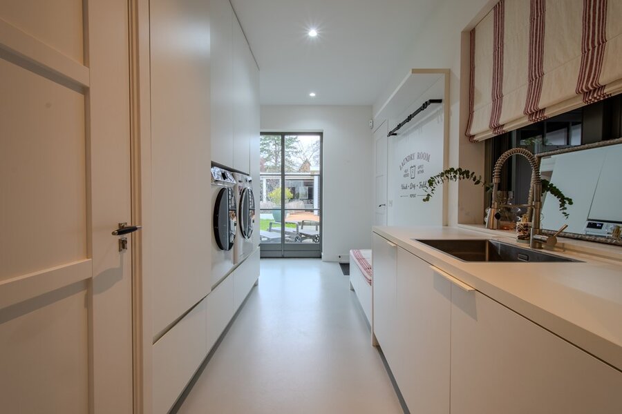 De bijkeuken en wasruimte combineren functionaliteit met comfort. Ze zijn ruim, licht en voorzien van voldoende bergruimte en een praktisch werkblad. De elegante trap vanuit de hal wordt overspoeld met daglicht en is afgewerkt in een verfijnd kleurenpalet, wat direct een gevoel van kwaliteit en verfijning oproept.