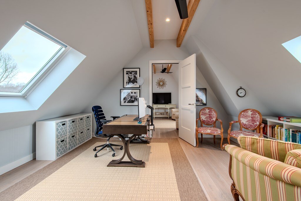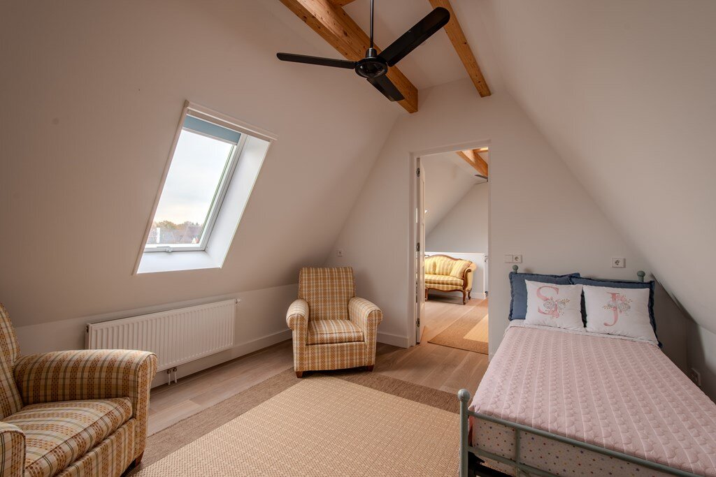 Op de tweede verdieping bevinden zich nog twee slaapkamers met daartussen een centraal gelegen kantoorruimte. Grote ramen zorgen hier voor overvloedig daglicht, waardoor het kantoor een inspirerende en aangename werkplek biedt, perfect voor werk, hobby of gasten.
