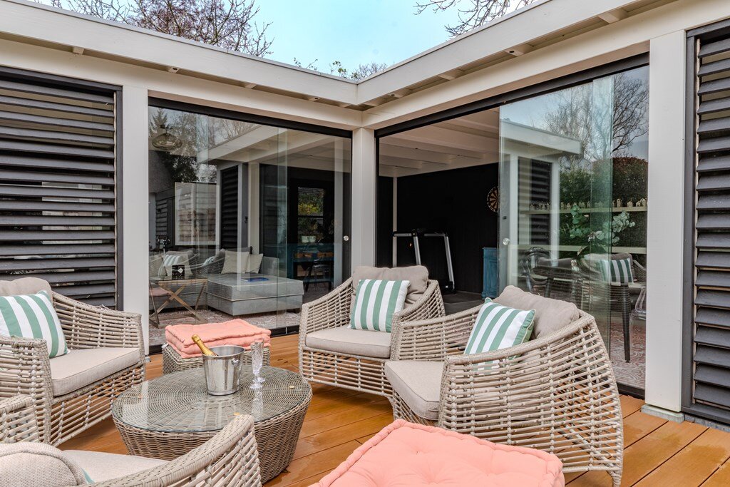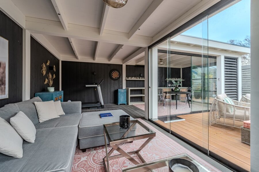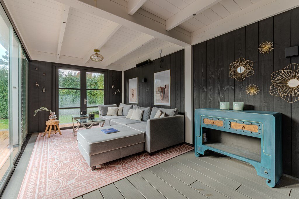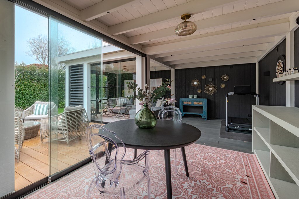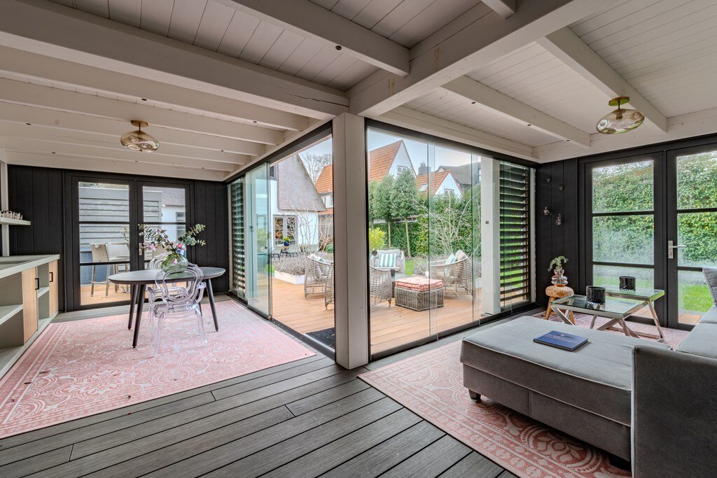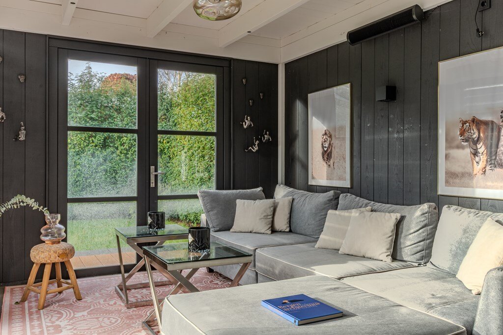 Een bijzondere eyecatcher is het tuinhuis, uitgerust met grote glazen schuifdeuren en verwarmingsapparatuur, waardoor het comfortabel te gebruiken is in alle seizoenen. Of het nu wordt gebruikt voor entertainment, werken of ontspannen, het tuinhuis verlengt de woonruimte op een elegante en naadloze manier naar de tuin.