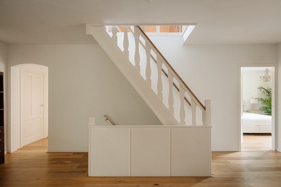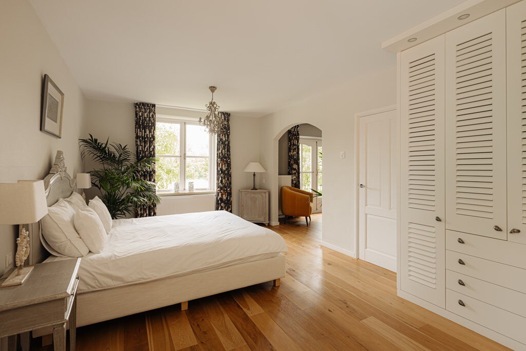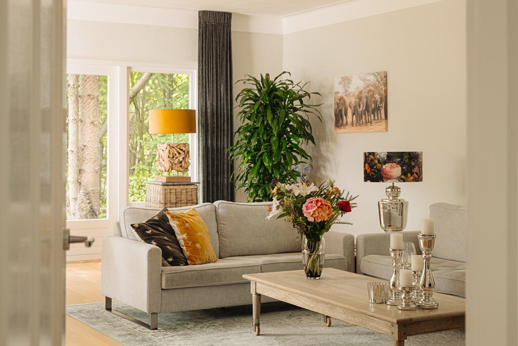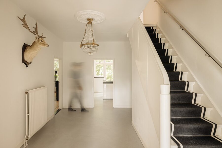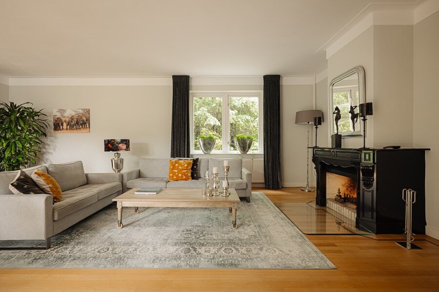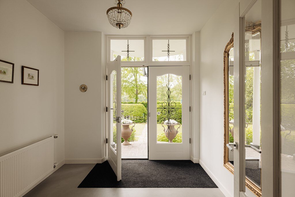 Bij binnenkomst voel je meteen de warme sfeer van het huis. De dubbele openslaande deuren leiden naar de vestibule, waar de fraaie houten trap en de moderne Eurocol stucvloer elkaar mooi aanvullen en zo een harmonieus geheel van klassiek en modern vormen. Elke ruimte is bijzonder verzorgd en afgewerkt, waardoor het huis een luxe én huiselijk gevoel geeft.