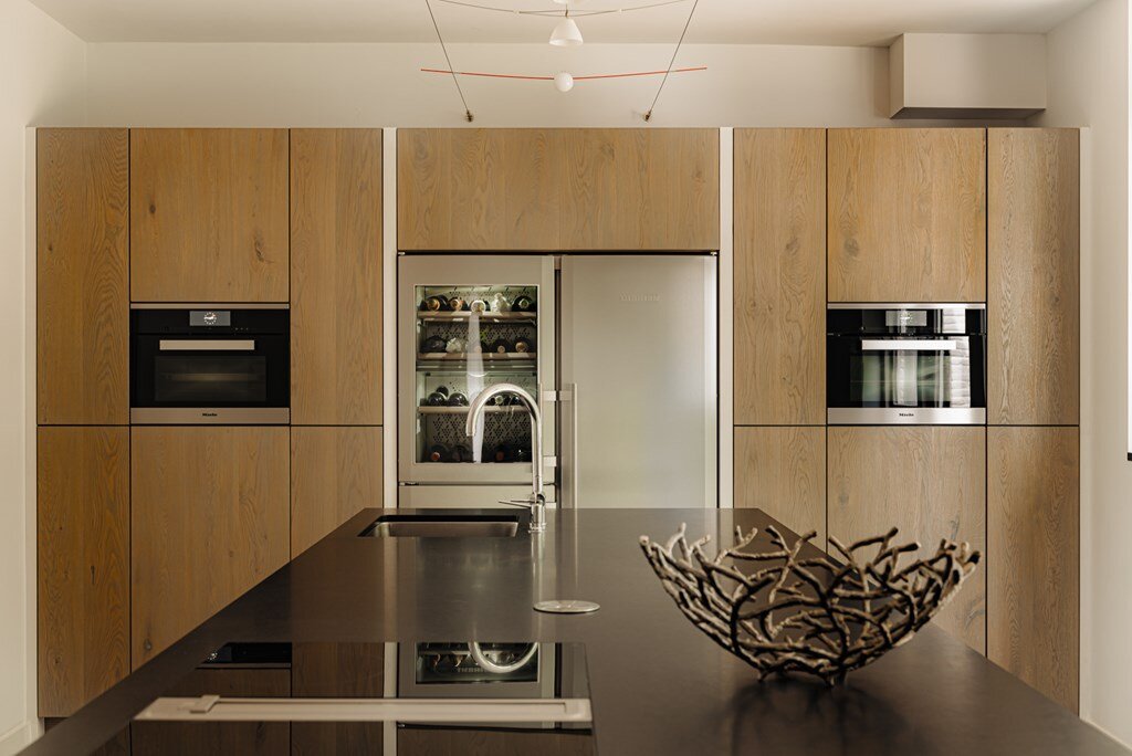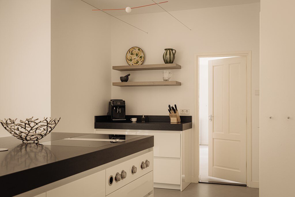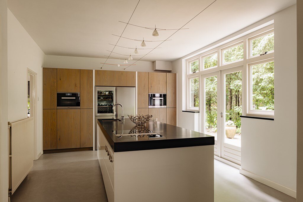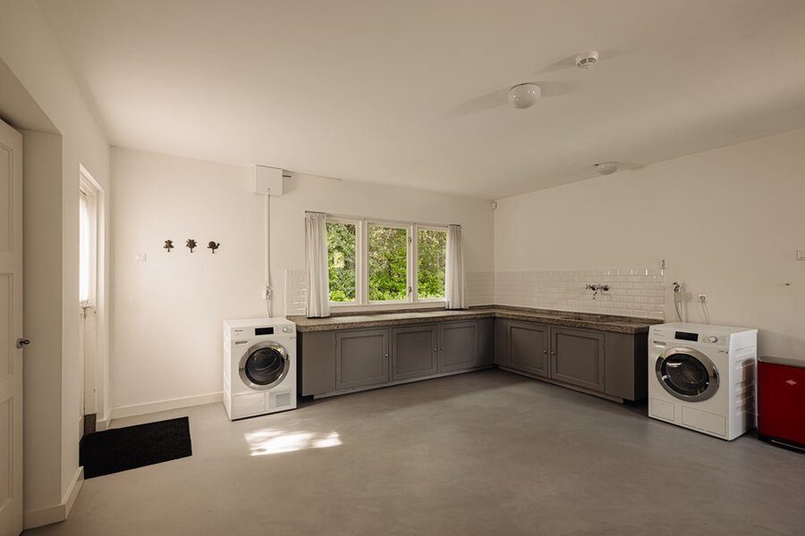 De ruime, moderne keuken is zeer verzorgd en beschikt over een kookeiland en hoogwaardige Miele-apparatuur, inclusief een Liebherr koel/vriescombinatie met wijnklimaatkast en een Bora Professional inductiekookplaat. Openslaande deuren geven zicht op de tuin. Aangrenzend ligt de zee royale bijkeuken, met toegang tot de kelder – ideaal voor een wijncollectie of extra opslag.