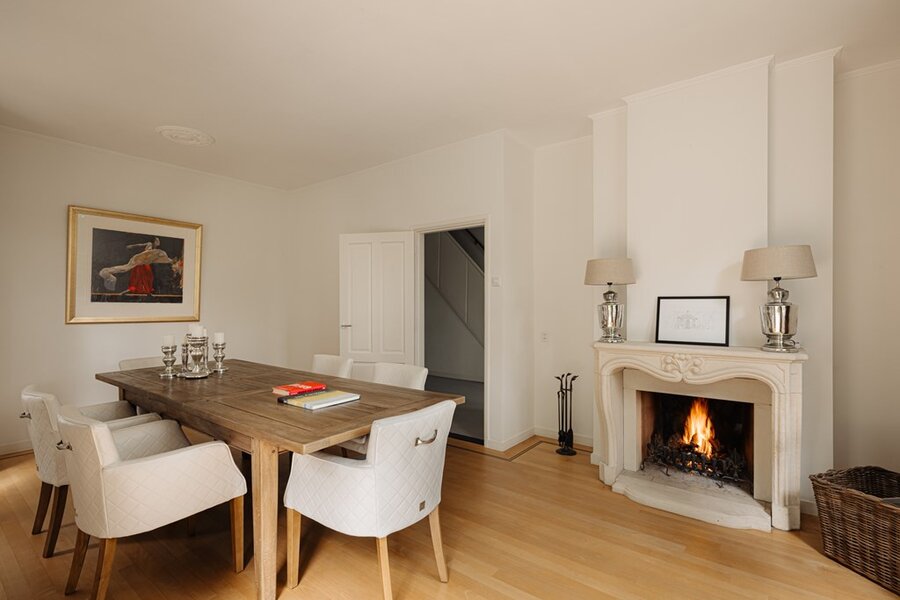 De begane grond biedt verschillende charmante vertrekken. De zit-/werkkamer, woonkamer en eetkamer zijn allen voorzien van een elegante beukenhouten tapisparketvloer. De eetkamer en woonkamer hebben een sfeervolle open haard en bieden direct toegang tot het terras.