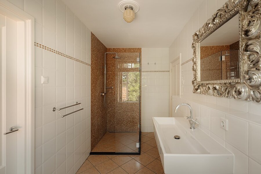 Op de eerste verdieping zijn vijf slaapkamers, waaronder een royale slaapkamer met ensuite badkamer en een balkon met weids uitzicht. Daarnaast is er een tweede badkamer en een apart toilet, alle voorzien van vloerverwarming. De ruime zolder biedt mogelijkheden voor extra slaapkamers, een studio of een gym/wellnessruimte.