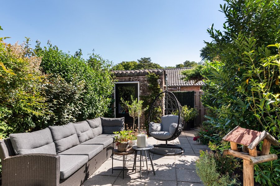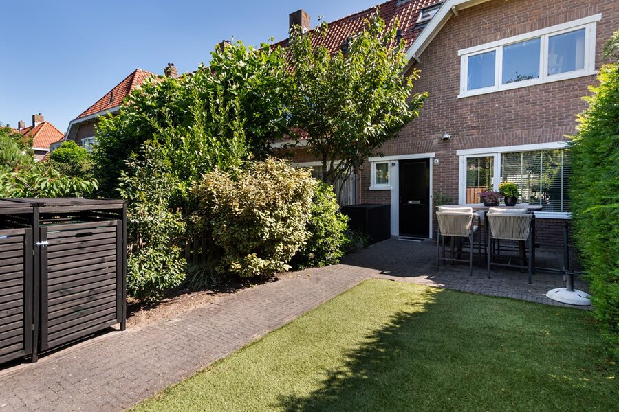 Sfeervolle zonnige afgesloten voortuin (Zuid-West) is strak aangelegd en biedt alle privacy. De knusse achtertuin (Noord-Oost) beschikt over een schuur en heeft een achterom. Ondanks het feit dat de achtertuin grotendeels is betegeld, is deze ook erg groen. In de straat en de nabije omgeving bevindt zich meer dan genoeg openbare parkeergelegenheid.