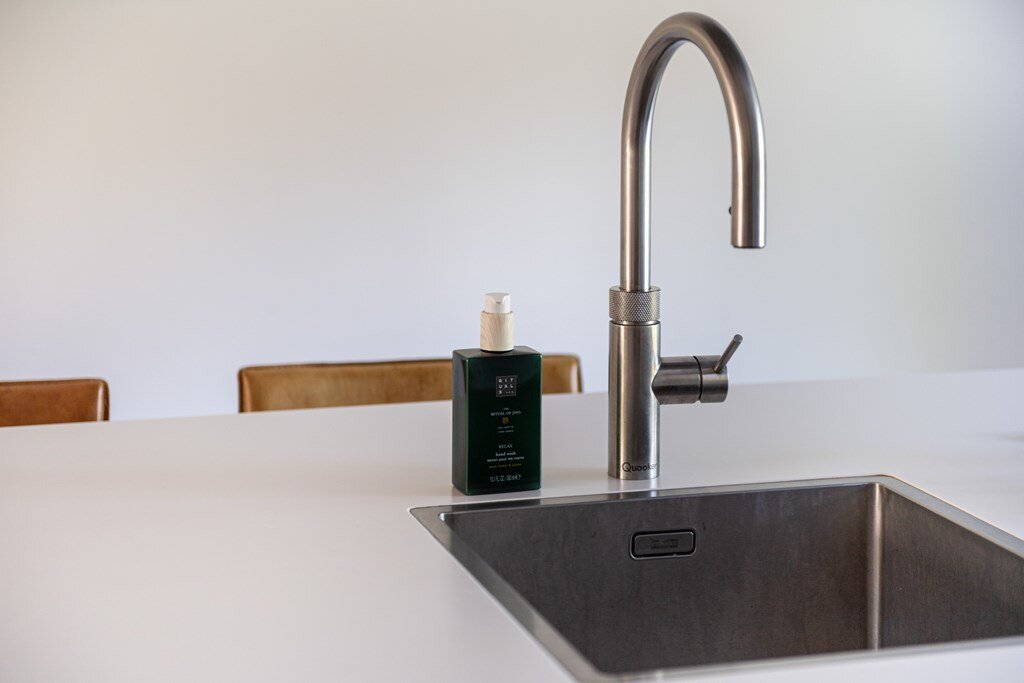 De ruime lichte keuken is aan de voorzijde van de woning gelegen, deze is modern, voorzien van alle gemakken en een mooi eiland (kook en nat). Vanzelfsprekend is de keuken voorzien van de nodige inbouwapparatuur, zoals een 4-pits gastoestel met additionele wokbrander, afzuigkap, combi-oven/magnetron, koelkast, vriezer en Quooker. Al kokend is er een mooi zicht op de zonnige voortuin.