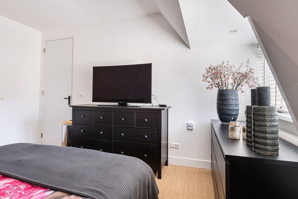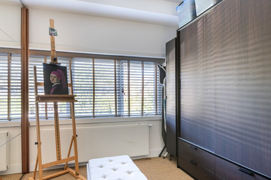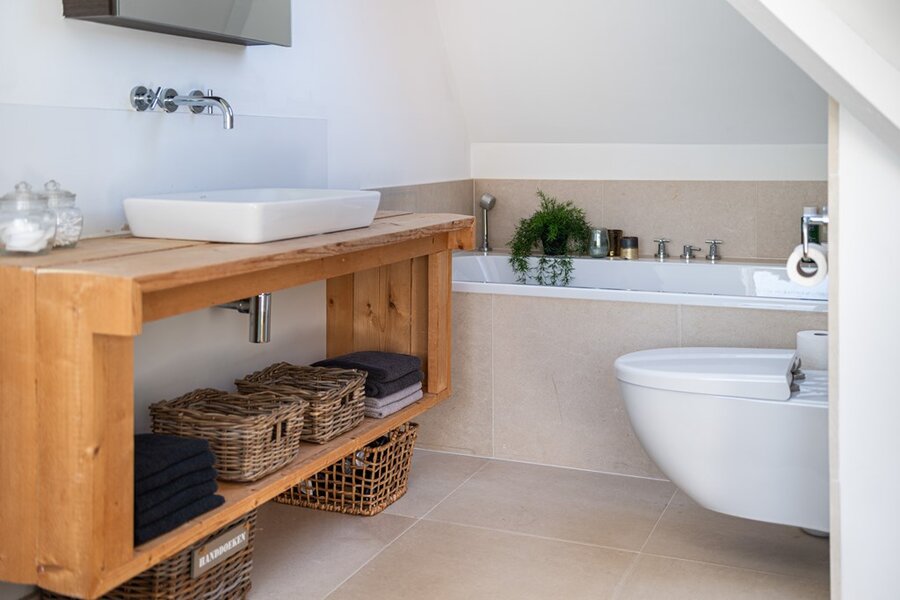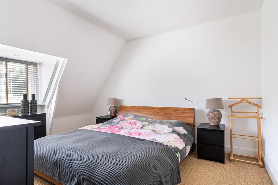 Lichte overloop (door een Velux dakraam) en deze biedt toegang tot de wasruimte met opbergruimte, waar ook de cv-ketel is gesitueerd. Het betreft een Remeha CV-ketel van 2011. Verder op deze verdieping een riante slaapkamer met badkamer "ensuite". Op deze kamer is er lichtinval van beide kanten door meerdere Velux-ramen (drie stuks). De badkamer is voorzien van een ligbad, hangend toilet en wastafelmeubel. Ook hier is het bad weer in een knusse nis geplaatst wat het geheel erg mooi maakt. Het tegelwerk, de gestucte wand- en plafondafwerking en de "sisal" vloerafwerking is ook op deze verdieping consequent doorgevoerd.
