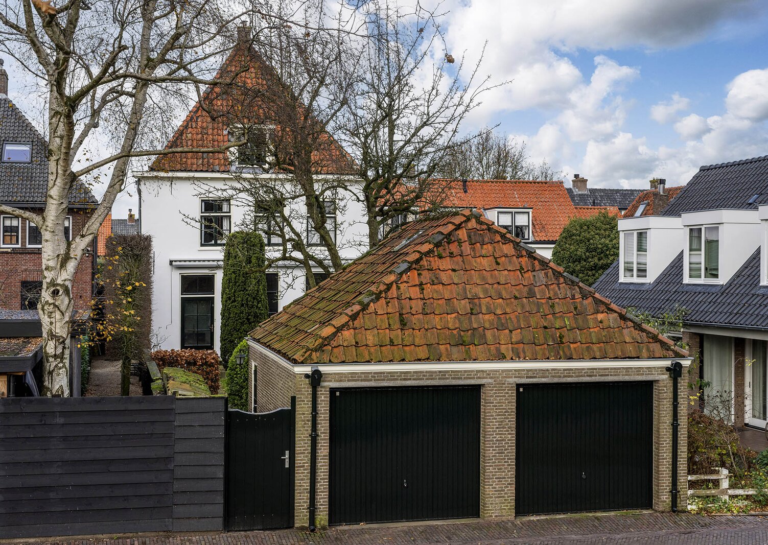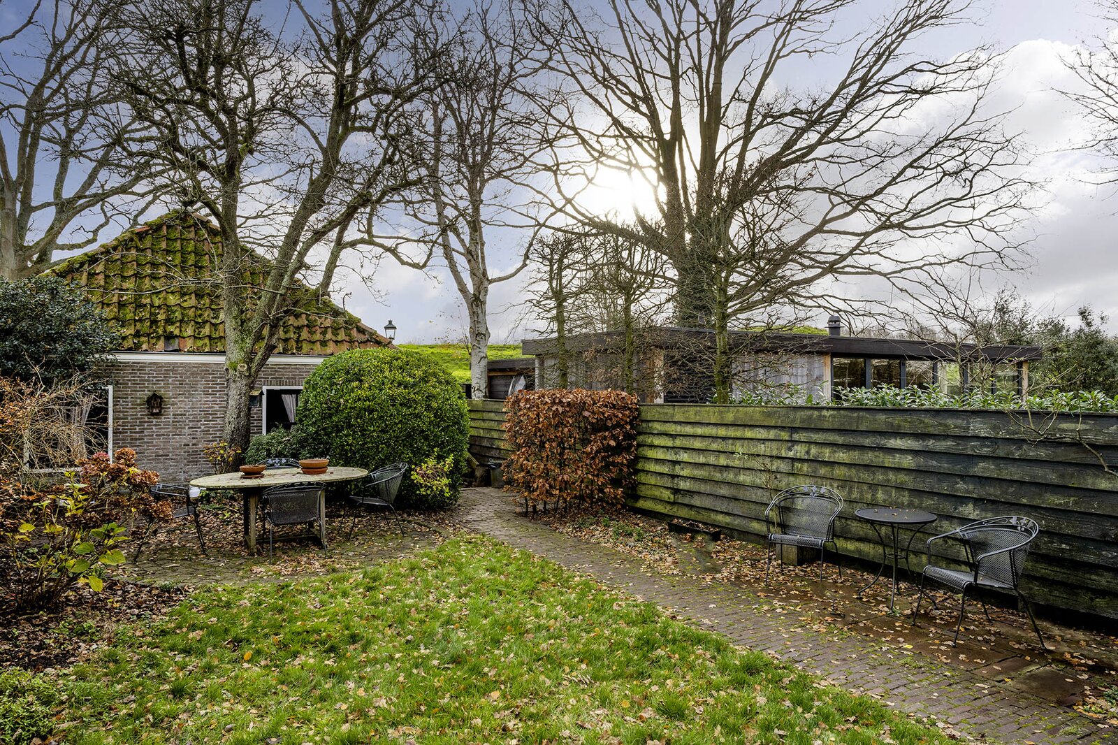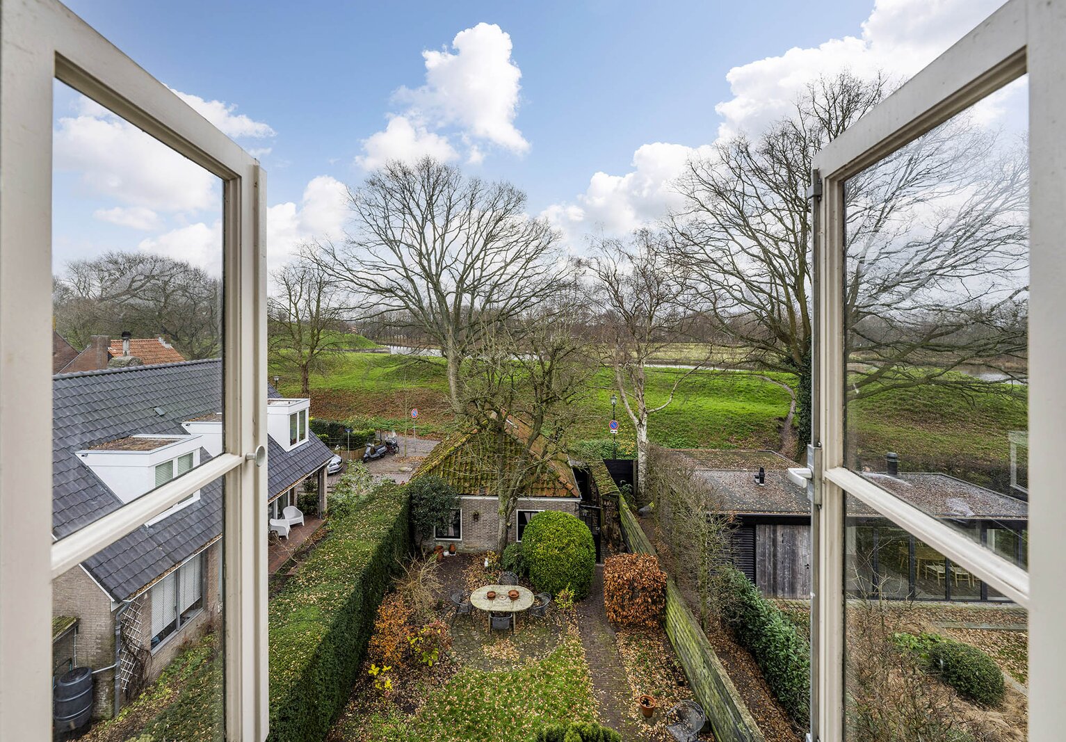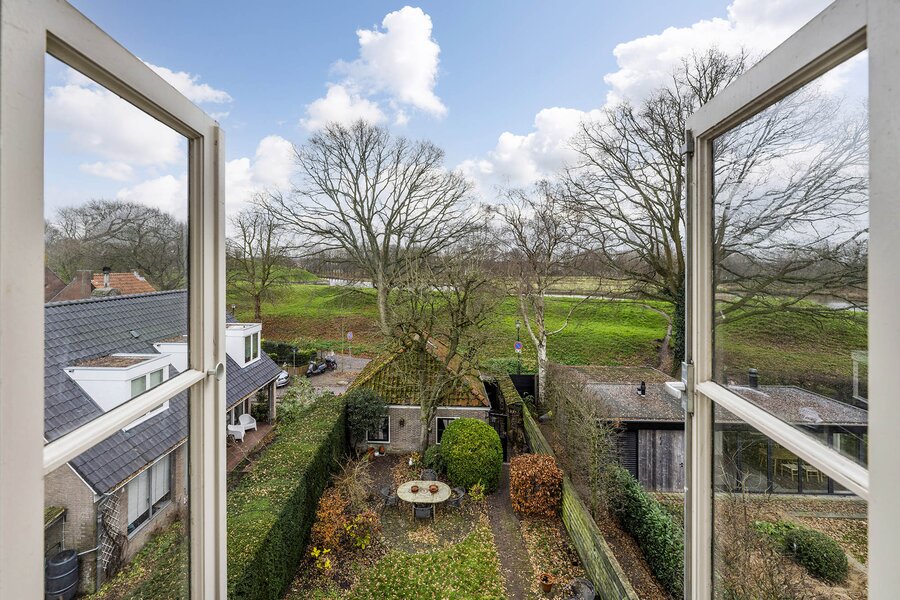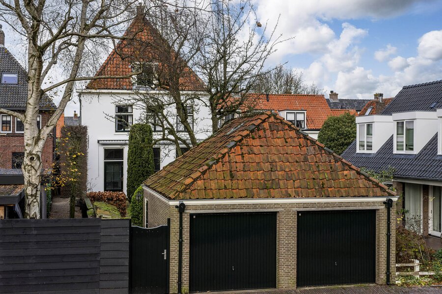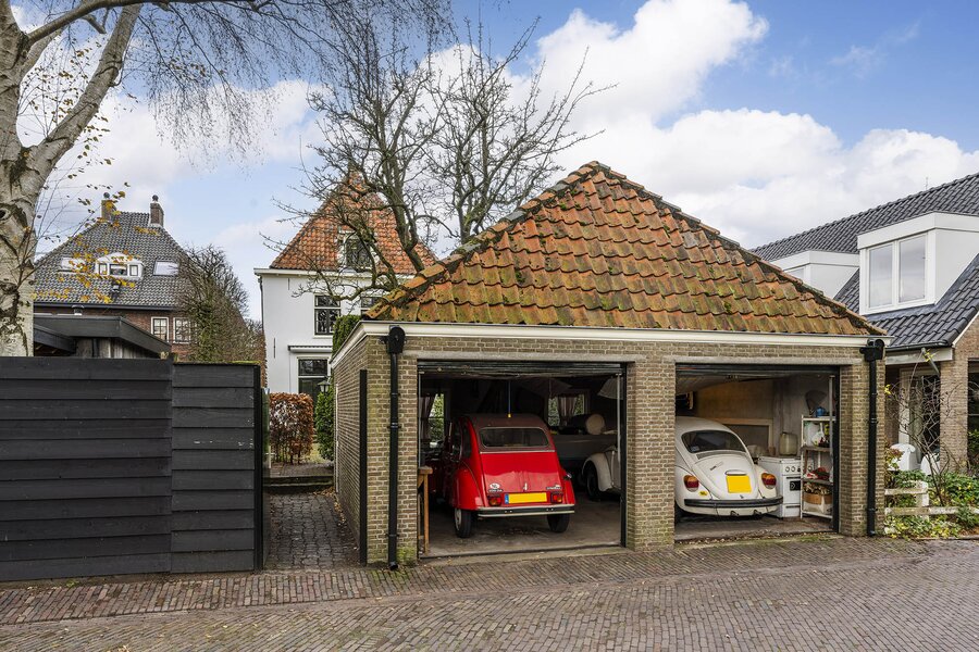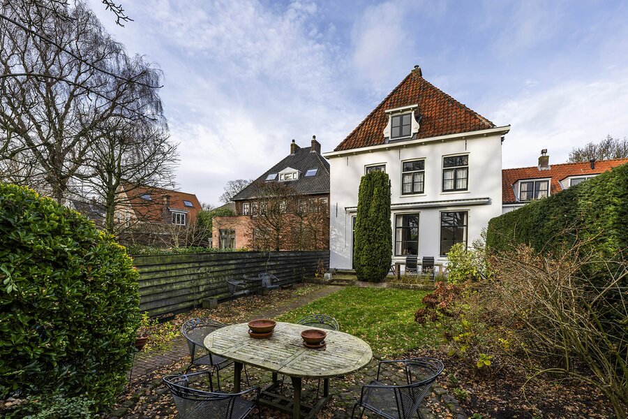 Vanuit de keuken loopt u zo de achtertuin in met vele gezellige zitmogelijkheden. Met haar 23 meter diepte en circa 9 meter breedte is dit werkelijk uniek voor de Vesting te noemen. De ochtend-, middag- en avondzon ervaart u hier allemaal. Extra bijzonder is dat u geen directe achterburen heeft, alleen de vestingwallen en bomenpartijen. Achterin de tuin treft u de uitgang naar de straat en de rand van de vestingwallen. Medio jaren 70 is de huidige dubbele garage geplaatst met een handige bergvliering. Hier staan op dit moment 2 klassieke auto’s, maar dient daarnaast nog als berging, het is allemaal groot genoeg. Het komt niet vaak voor dat u een auto op eigen terrein kunt plaatsen, laat staan 2 overdekt.