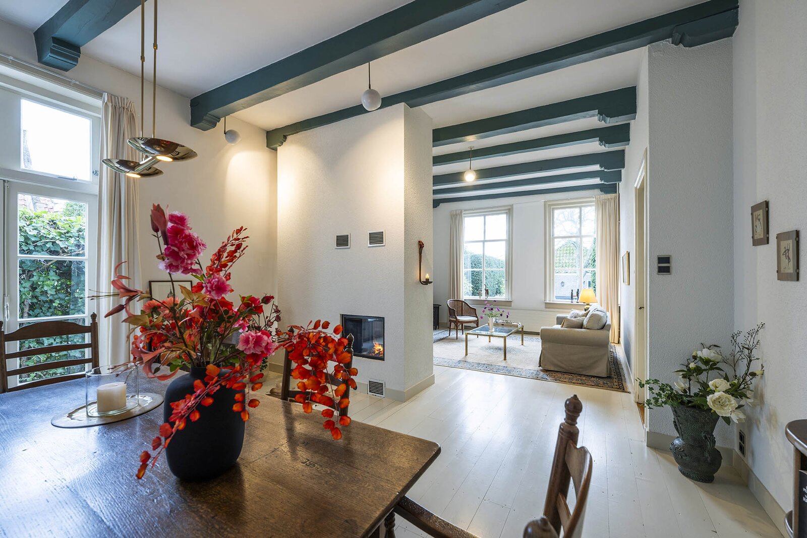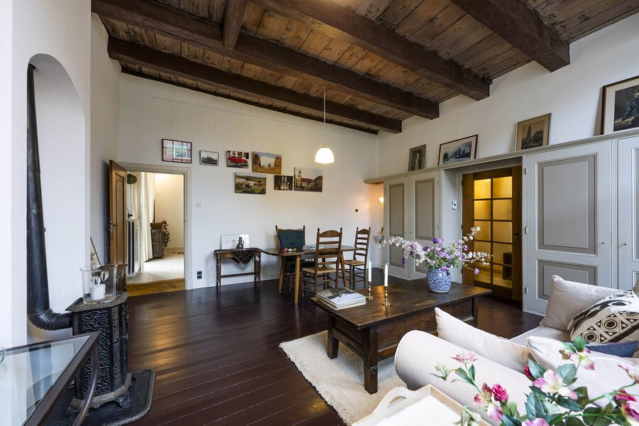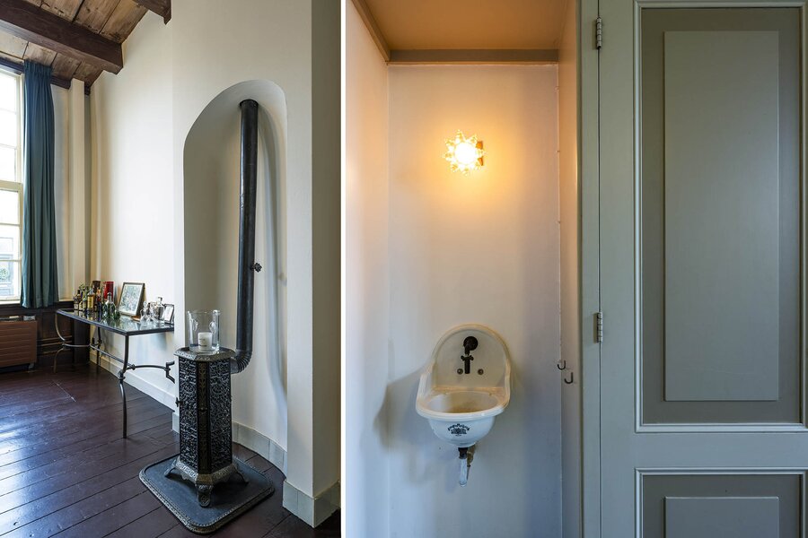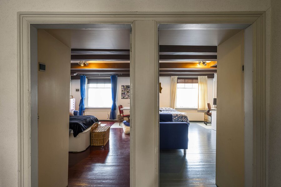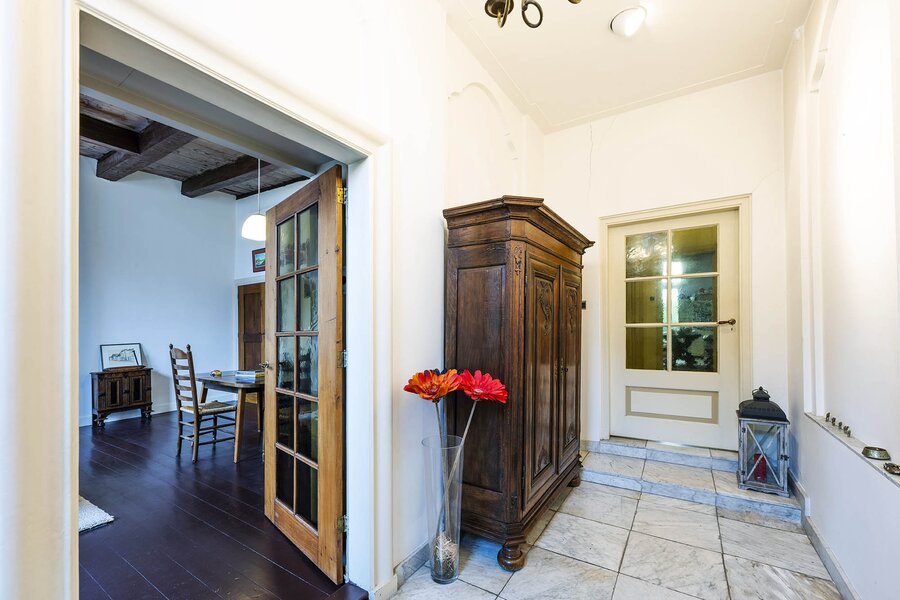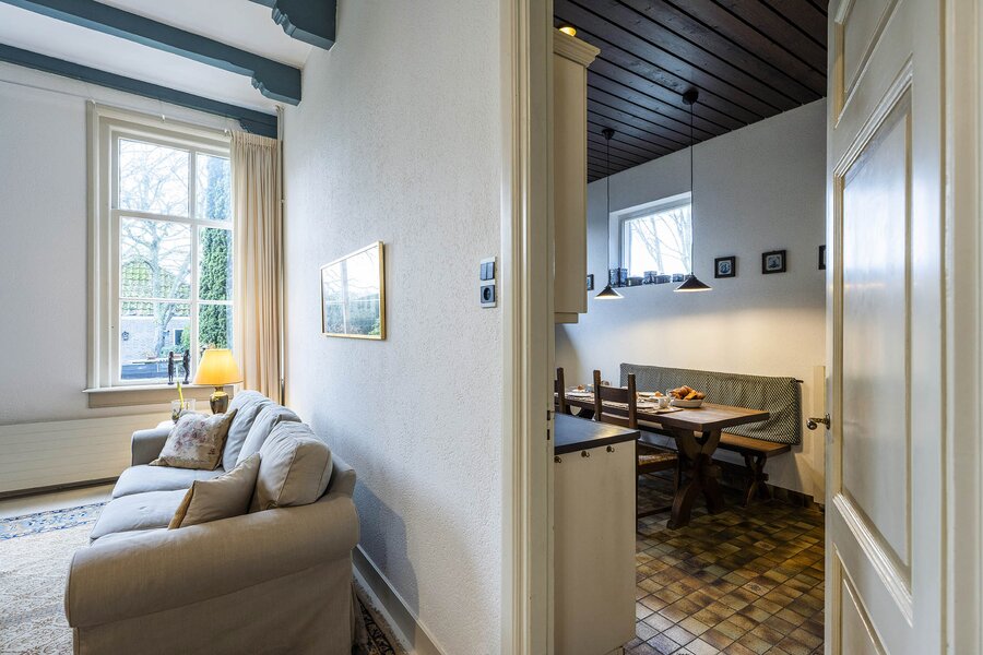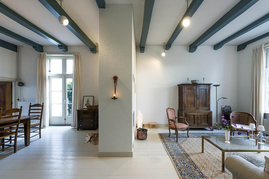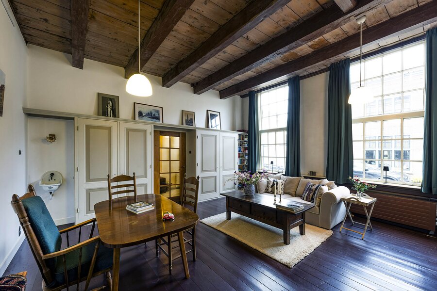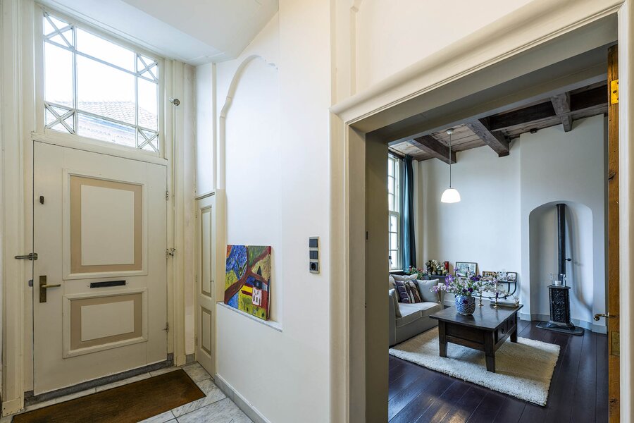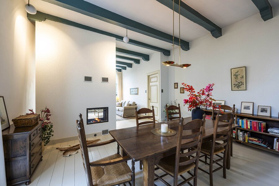 Vanaf de prachtig glimmende voordeur komt u binnen in een grote hal met robuuste marmeren tegels, een antieke kroonluchter en een geornamenteerd plafond. Van hieruit kunt u naar achter lopen richting de keuken of de voorkamer, de zogenaamde ‘herenkamer’, betreden. Hier ervaart u de woning direct in volle glorie, rijk aan elementen kenmerkend voor de VOC-tijd. Zo ziet u het handgemaakte balkenplafond, deels nog het originele getrokken glas in de kozijnen, een authentiek wastafeltje en een antieke kolenkachel. Vanuit deze herenkamer kunt u de eet- en woonkamer betreden. Deze ruimte is voorzien van vloerisolatie. Het eetgedeelte heeft openslaande zijdeuren en een heerlijke doorkijk houthaard naar het woongedeelte. Het woongedeelte biedt een ultiem wooncomfort met zicht op de achtertuin door de grote en hoge raampartijen.