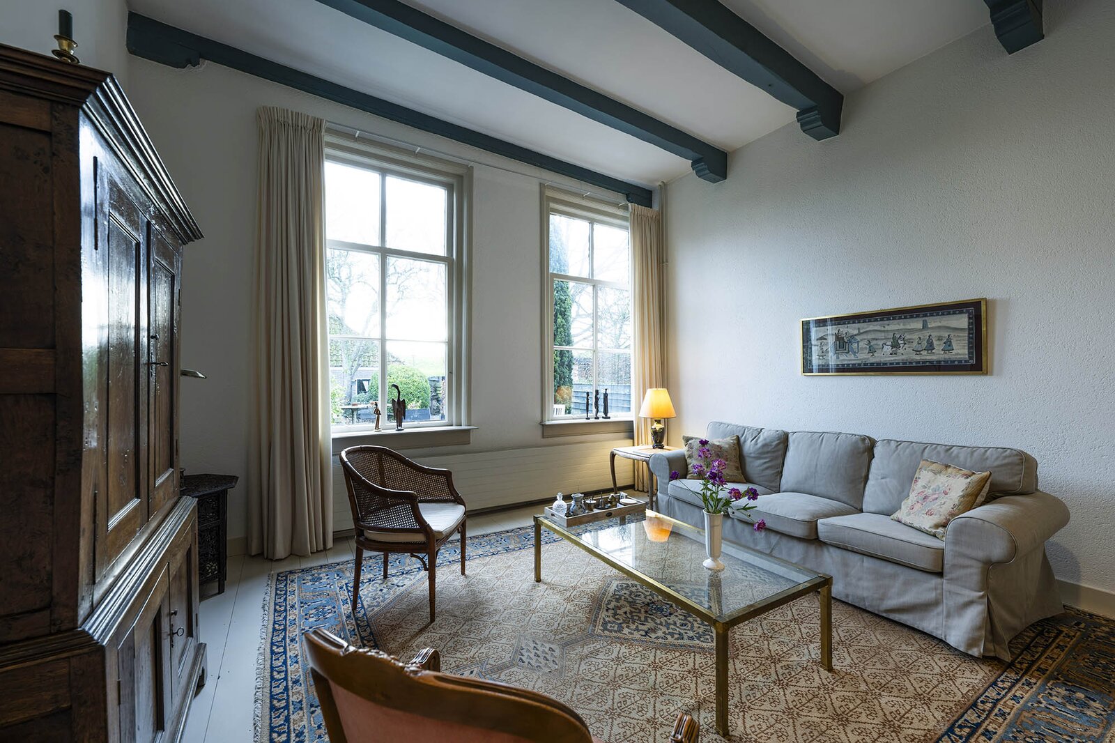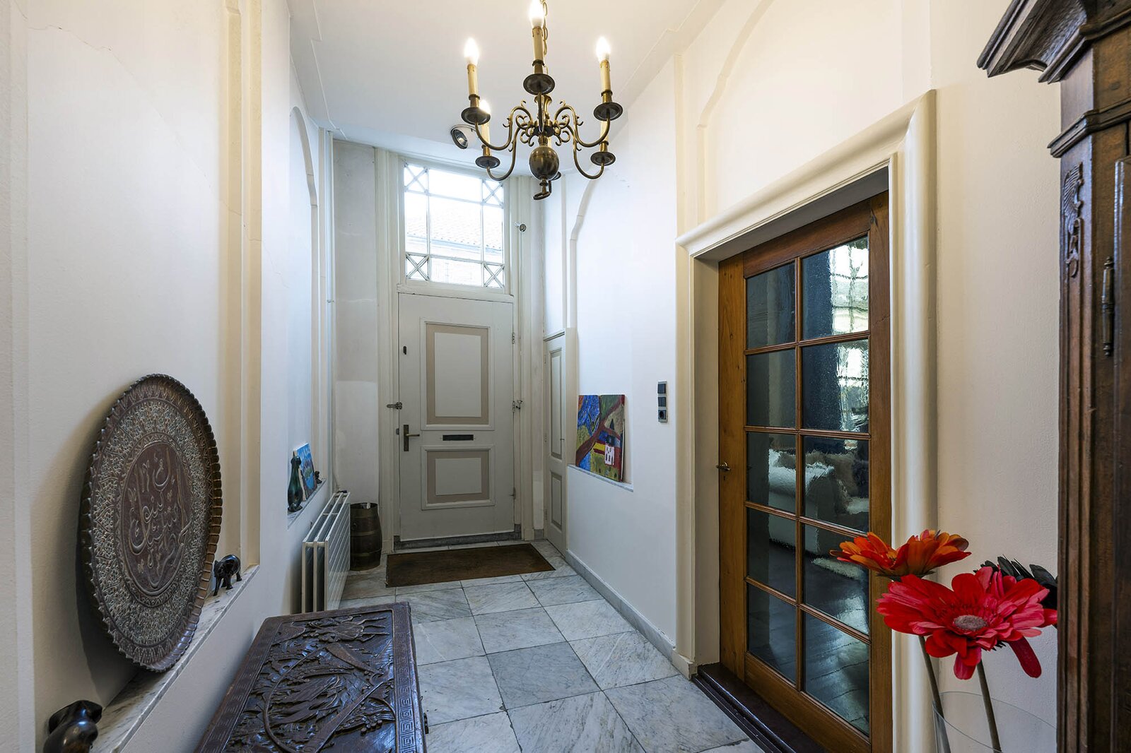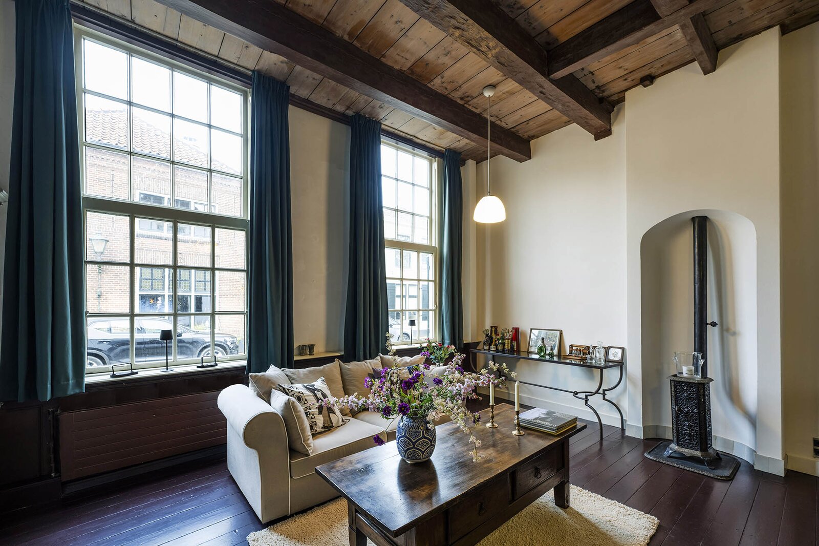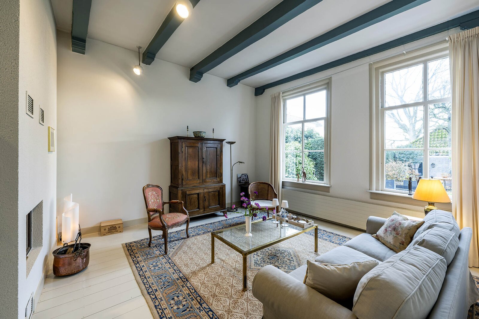 Vanaf de prachtig glimmende voordeur komt u binnen in een grote hal met robuuste marmeren tegels, een antieke kroonluchter en een geornamenteerd plafond. Van hieruit kunt u naar achter lopen richting de keuken of de voorkamer, de zogenaamde ‘herenkamer’, betreden. Hier ervaart u de woning direct in volle glorie, rijk aan elementen kenmerkend voor de VOC-tijd. Zo ziet u het handgemaakte balkenplafond, deels nog het originele getrokken glas in de kozijnen, een authentiek wastafeltje en een antieke kolenkachel. Vanuit deze herenkamer kunt u de eet- en woonkamer betreden. Deze ruimte is voorzien van vloerisolatie. Het eetgedeelte heeft openslaande zijdeuren en een heerlijke doorkijk houthaard naar het woongedeelte. Het woongedeelte biedt een ultiem wooncomfort met zicht op de achtertuin door de grote en hoge raampartijen.