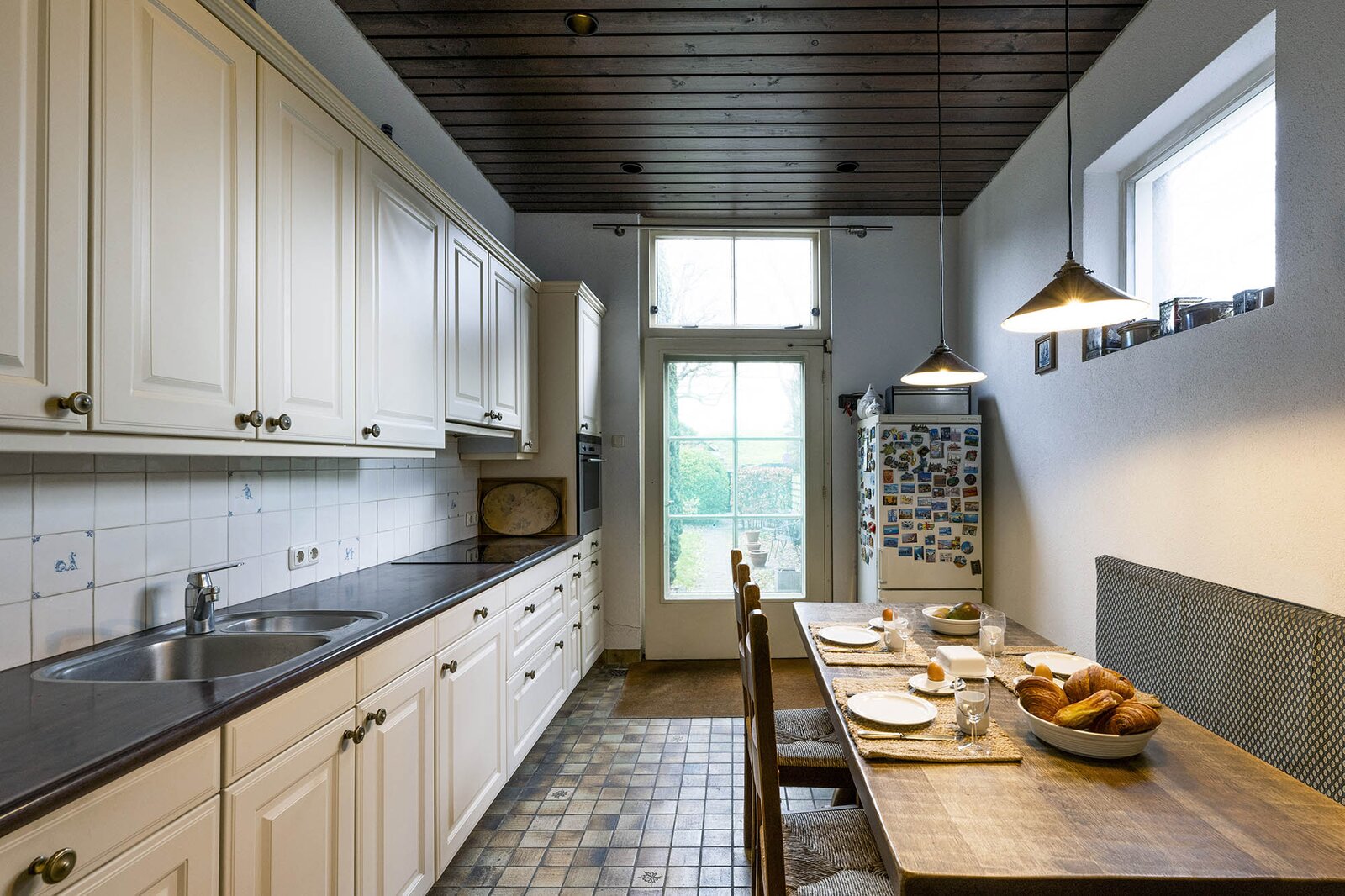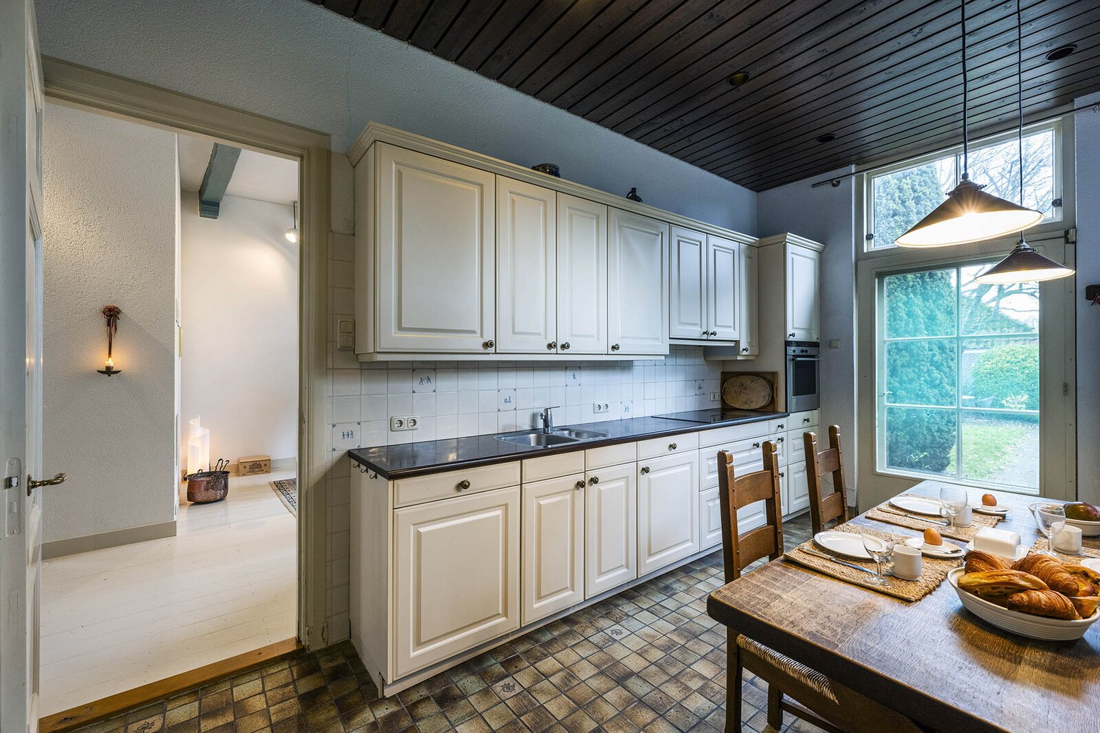 De ruime keuken is voorzien van diverse inbouwapparatuur. Er is tevens een gezellige eettafel aanwezig. Teruglopende naar de voordeur komt u in een tussenhal met toegang tot het moderne toilet met fonteintje, de kelder (hierover later meer) en de trapopgang naar de etages.
