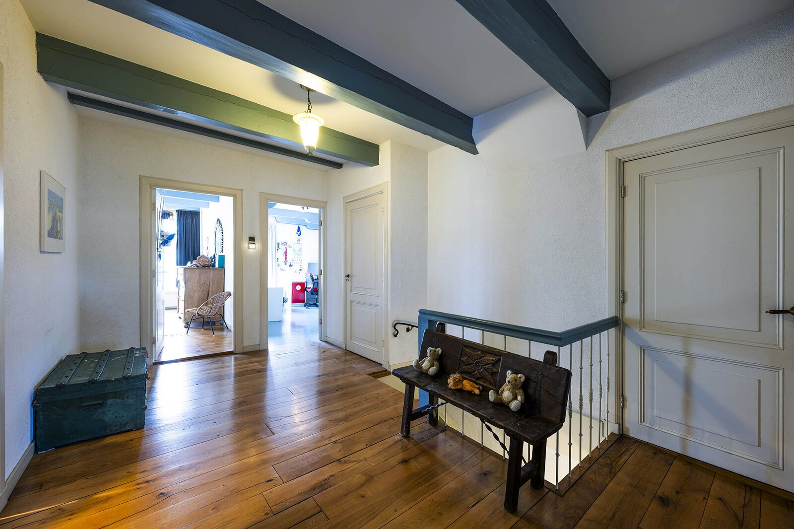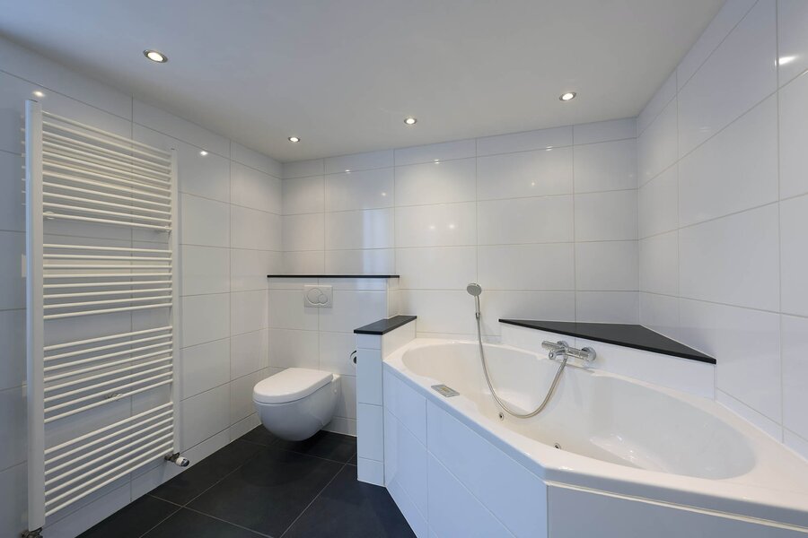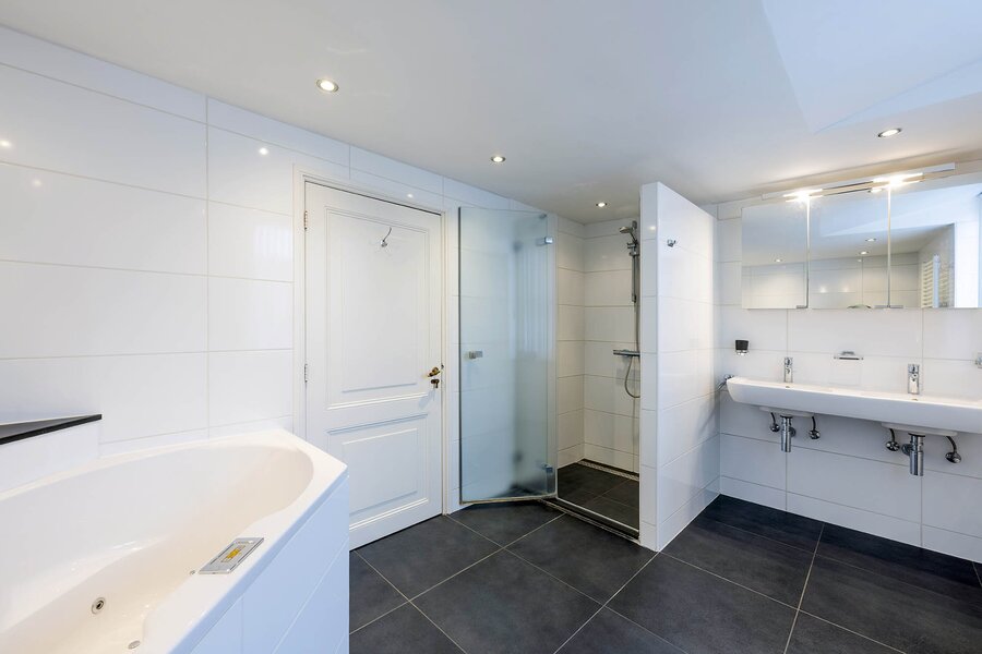 Terug in de woning. Op de eerste etage bevinden zich 4 grote slaapkamers, alle voorzien van balkenplafonds, houten vloeren en vaste kasten. Op de overloop bevindt zich nog een grote inloopkast en er is tevens toegang tot de ruime moderne badkamer die is uitgerust met een jacuzzi, een tweede toilet, dubbele wastafel, een inloopdouche en comfortabele vloerverwarming.