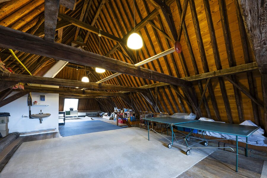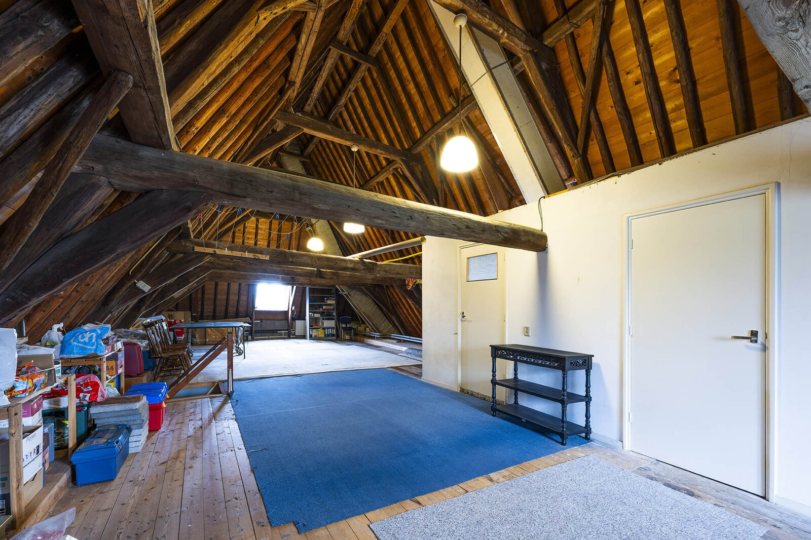 Een deur naar een tussenhal met extra bergruimte brengt u naar de etage waar zich de multifunctionele ruimte c.q. zolder bevindt. Hier zult u versteld staan. U komt hier boven en ziet de 5 meter 80 hoge sporenkap in volle glorie, prachtige planken, houten dakbeschot (met isolatie) en de dikke balken. Op deze etage (86m2) bevinden zich nu de wasruimte en de 2e badkamer die is voorzien van een douche, een wastafel en het derde toilet. Daarnaast is er nog een ruimte waar de cv-ketel (bouwjaar 2025) en de gasboiler zich bevinden.