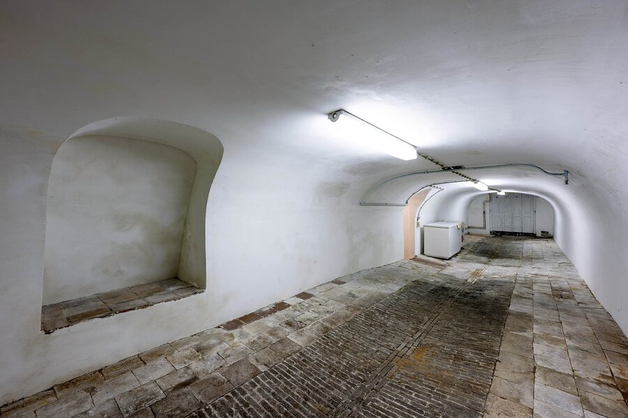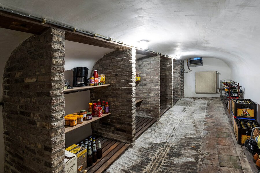Terug naar de begane grond. Vanuit de tussenhal dalen wij via gemetselde treden af naar de gewelfde boogkelders. Allereerst komt u in de ruim bemeten wijn- en provisiekelder. Vervolgens komt u via een kleine gang in de grote kelder. Deze kelder heeft een waterput en een eigen toegang naar de straat aan de voorzijde.