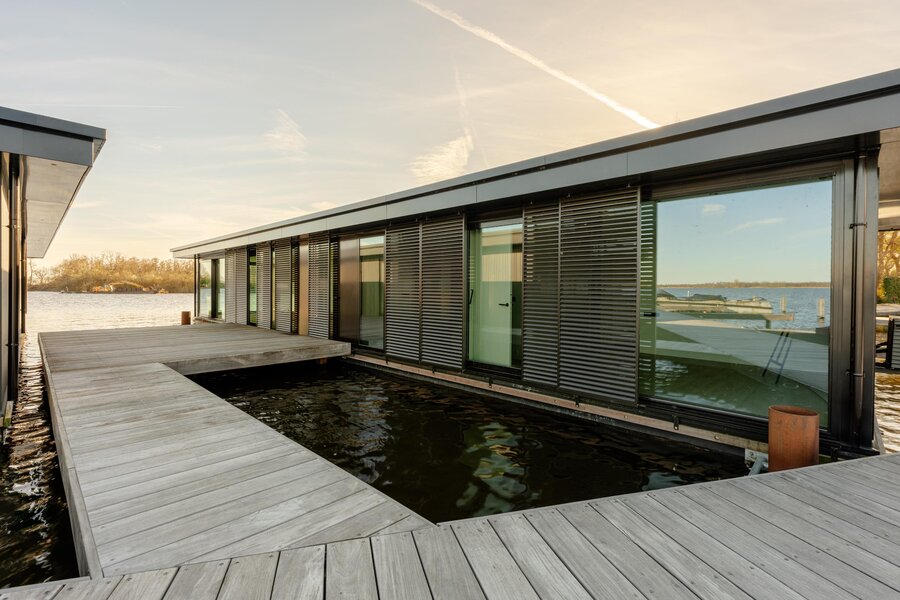Deze unieke waterwoning combineert een vooruitstrevend ontwerp met een serene ligging aan het