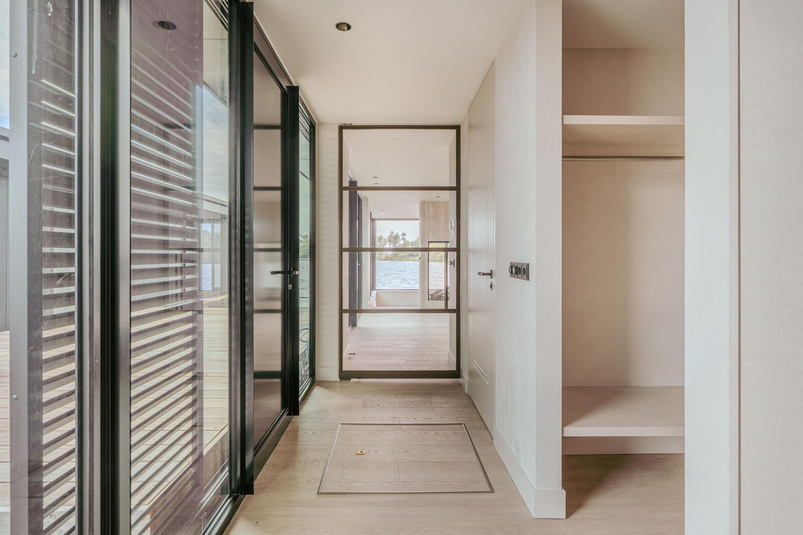 Upon entering through the spacious entrance, you immediately experience the high-quality finishes of this luxurious water villa. The entrance provides access to a technical room, which houses a heat pump and facilities for a washing machine and dryer, as well as a separate toilet.