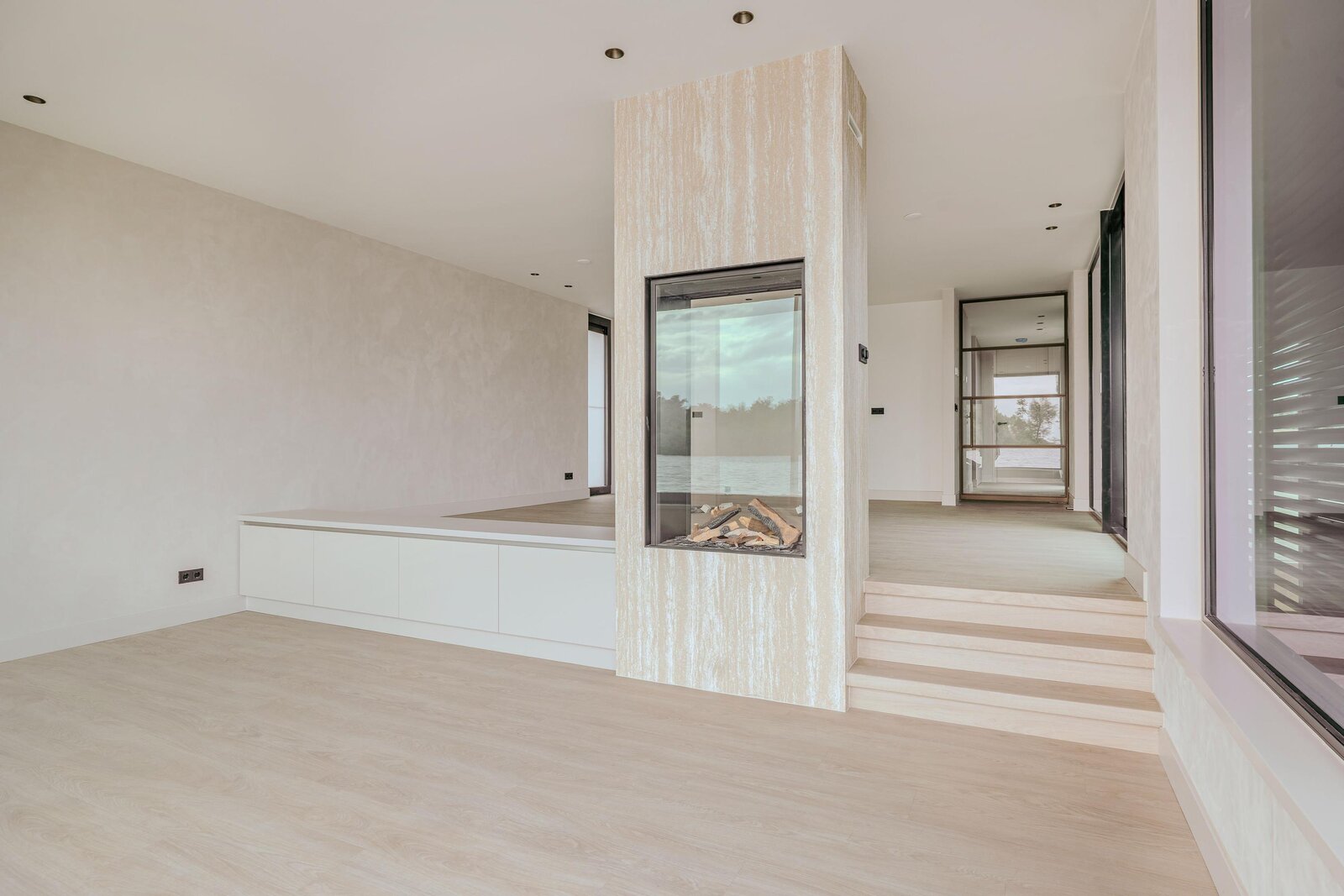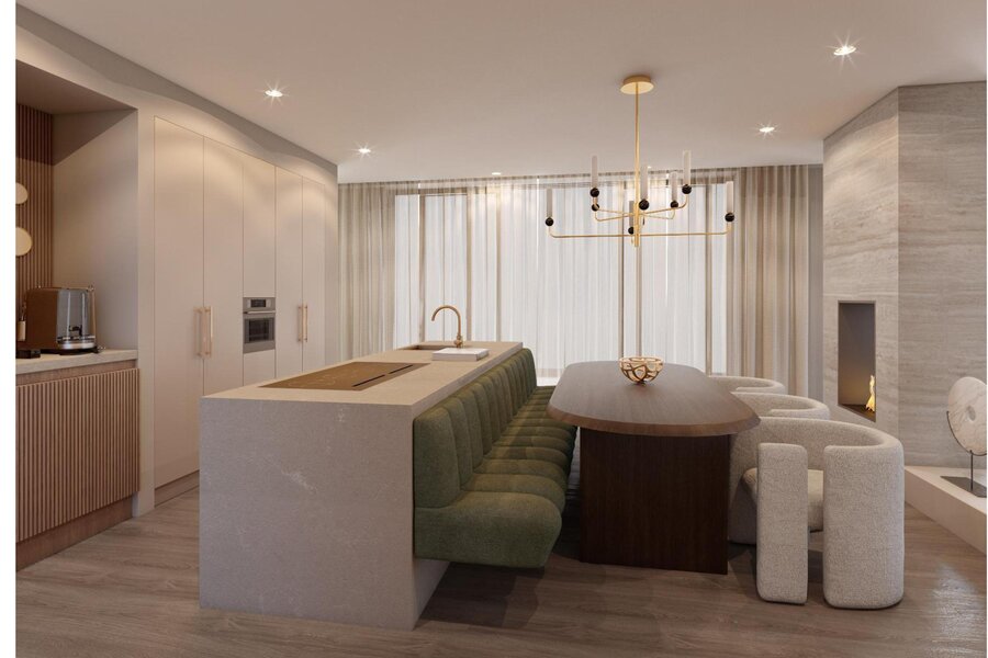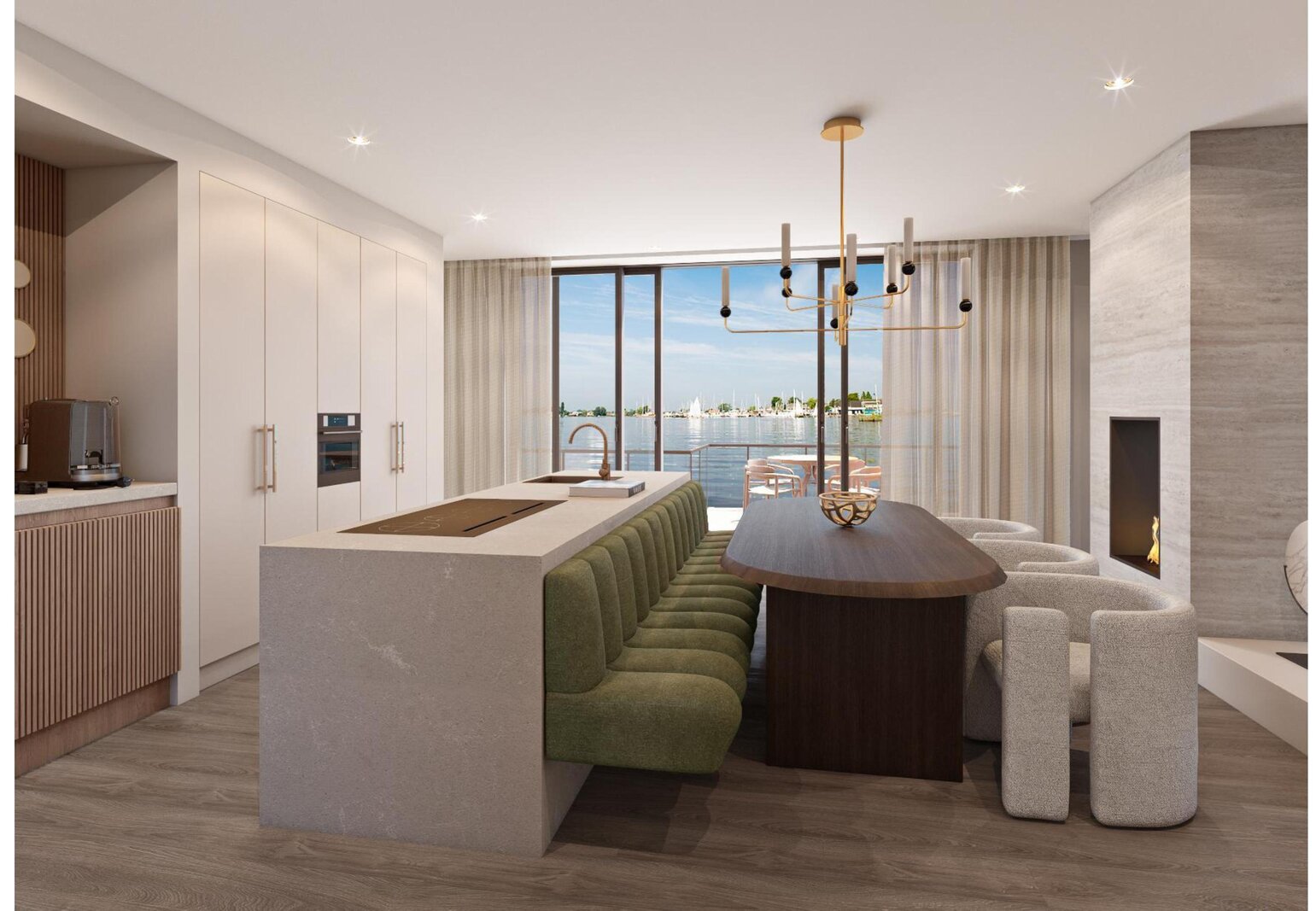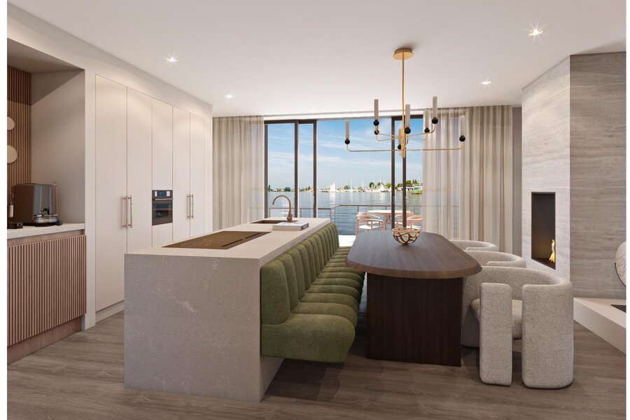 Vanuit de keuken leiden grote schuifdeuren naar een terras van circa 23 m². Hier kunt u genieten van een adembenemend uitzicht over het water en de schoonheid van de zonsopgang. De keuken en de verlaagde woonkamer worden op elegante wijze verbonden door een sfeervolle doorkijk-gashaard. Vanuit de keuken heeft u uitzicht op de