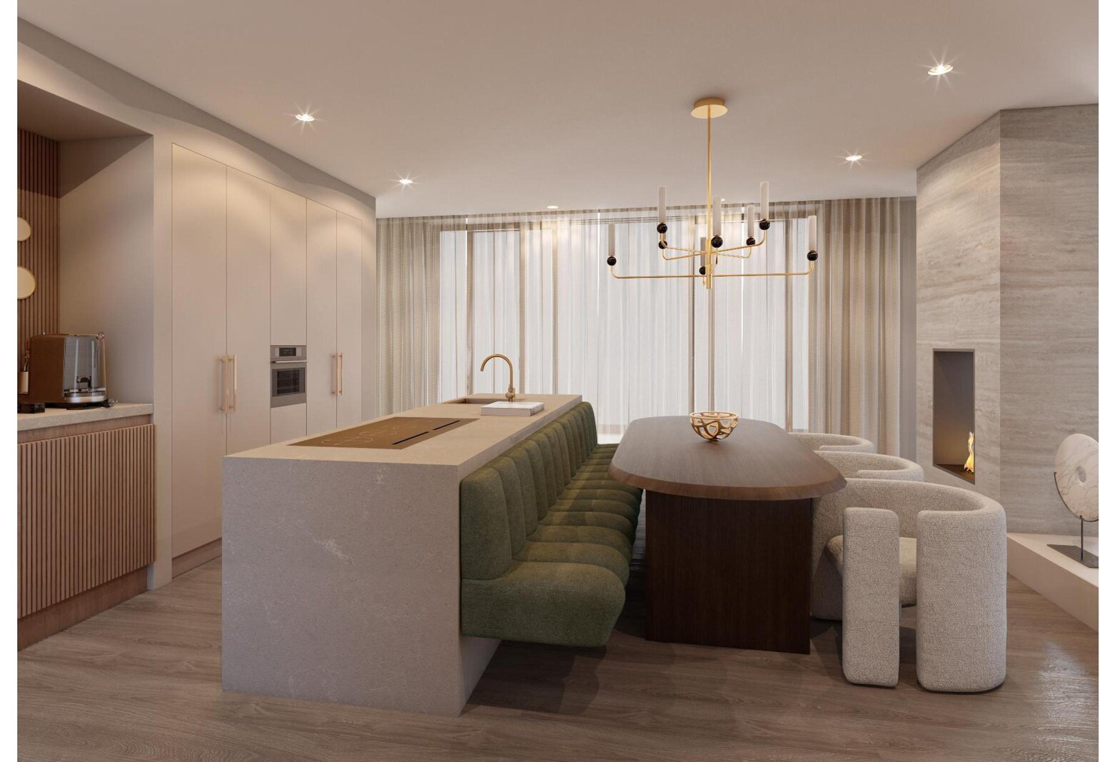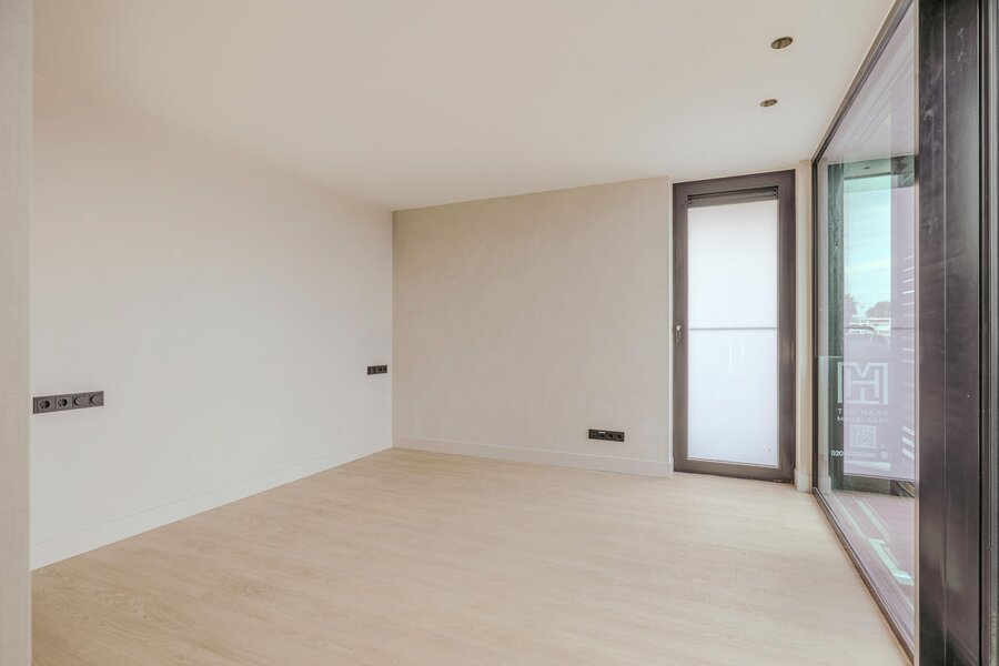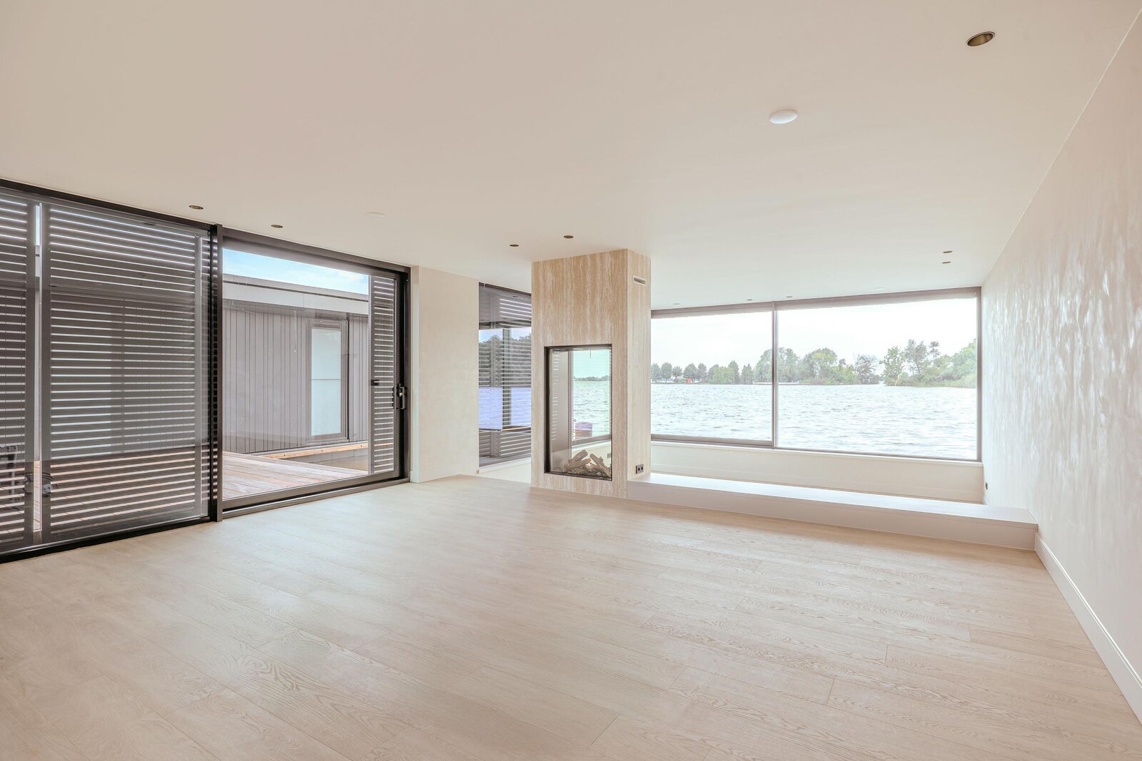 Vanuit de keuken leiden grote schuifdeuren naar een terras van circa 23 m². Hier kunt u genieten van een adembenemend uitzicht over het water en de schoonheid van de zonsopgang. De keuken en de verlaagde woonkamer worden op elegante wijze verbonden door een sfeervolle doorkijk-gashaard. Vanuit de keuken heeft u uitzicht op de