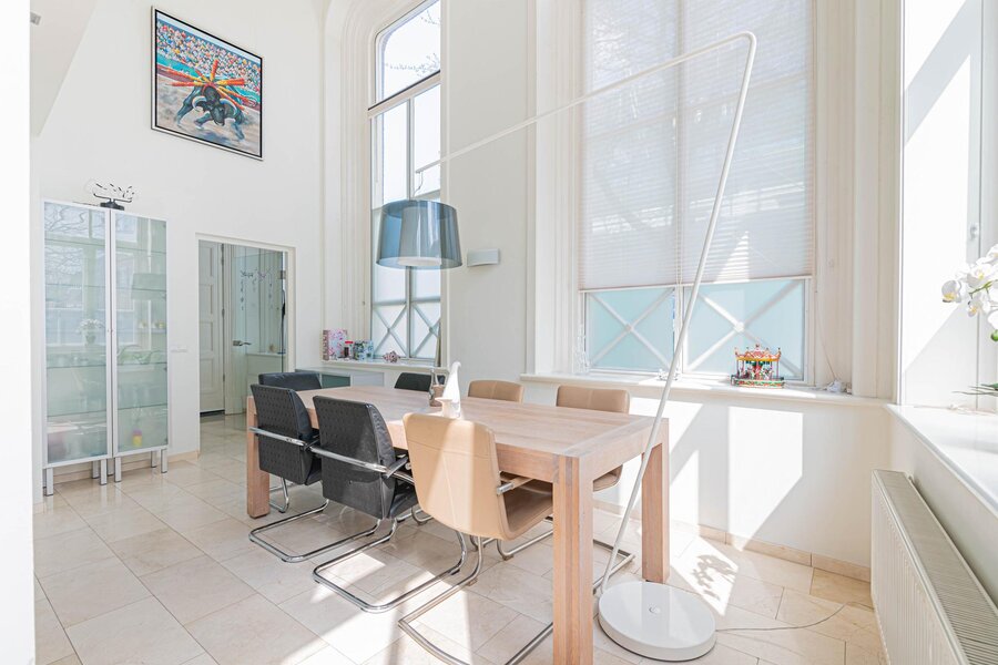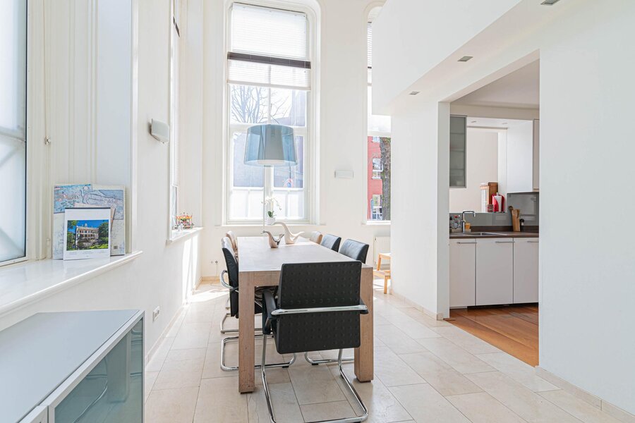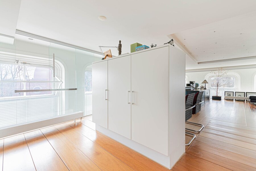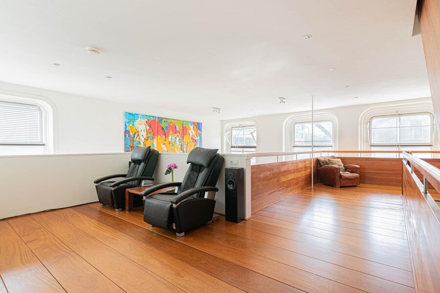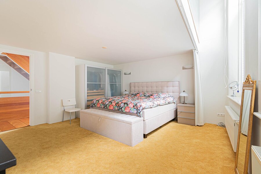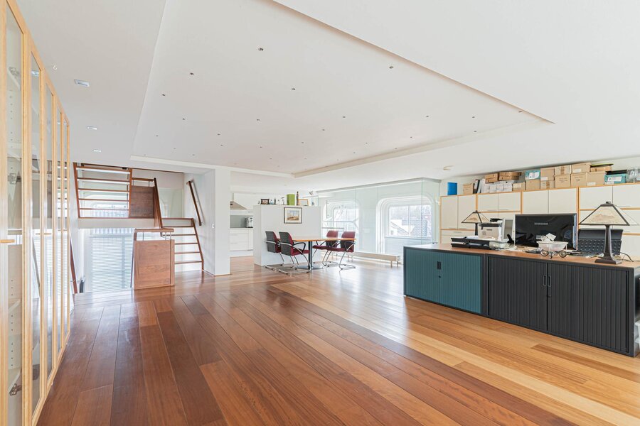 De klassieke hoge raampartijen en speelse indeling met mezzanines maken dit een prachtige, lichte woning. Op de bovenste verdieping bevindt zich een loggia (met jacuzzi en sauna) vanwaar u een prachtig panoramisch uitzicht heeft over de binnenstad. Bij de woning horen drie parkeerplaatsen op het gemeenschappelijke binnenterrein en een inpandige berging.