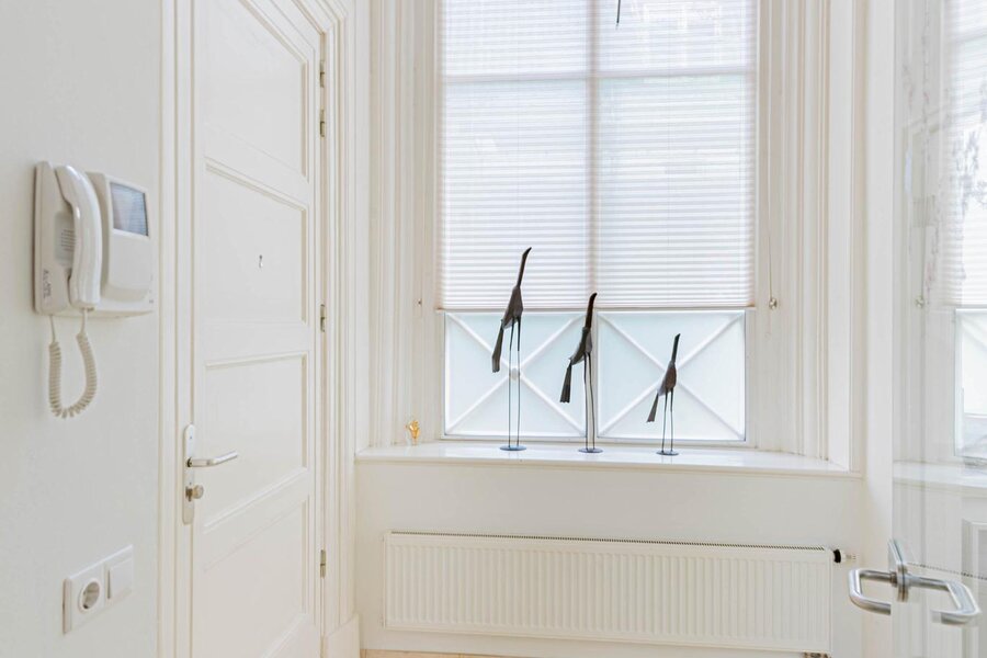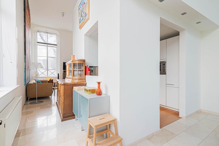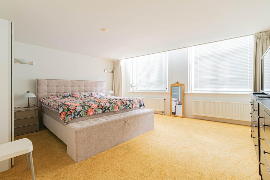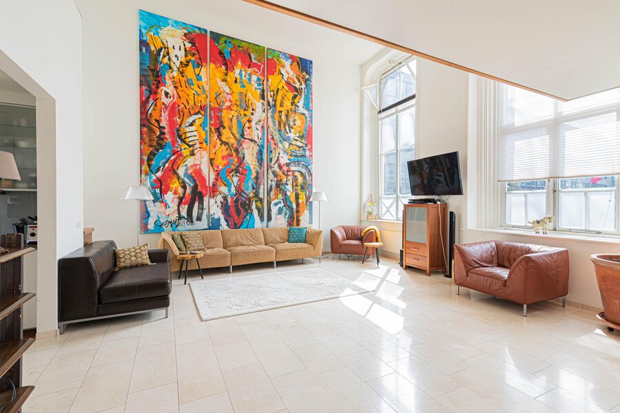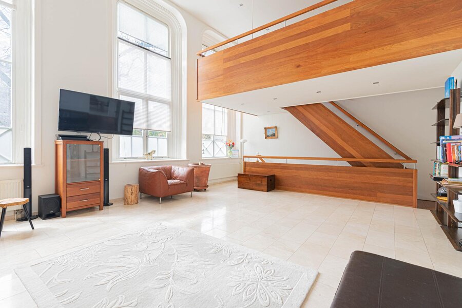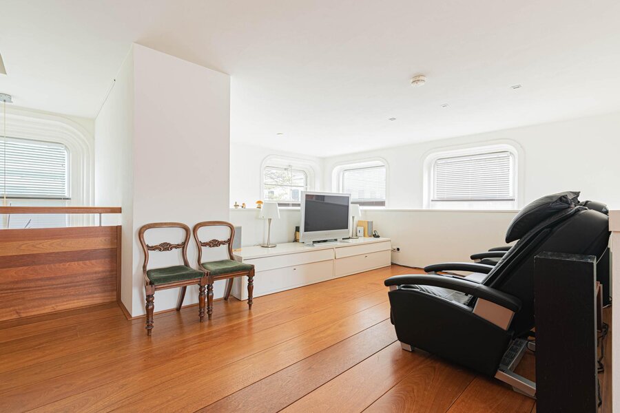 De klassieke hoge raampartijen en speelse indeling met mezzanines maken dit een prachtige, lichte woning. Op de bovenste verdieping bevindt zich een loggia (met jacuzzi en sauna) vanwaar u een prachtig panoramisch uitzicht heeft over de binnenstad. Bij de woning horen drie parkeerplaatsen op het gemeenschappelijke binnenterrein en een inpandige berging.