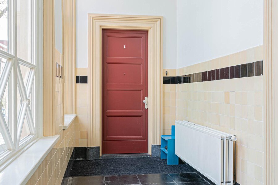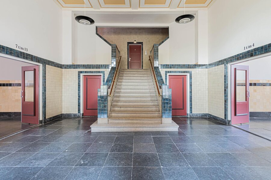 Centrale hal met video-intercom en brievenbussen. Een lange gang aan uw rechterzijde leidt naar voordeur van de woning.