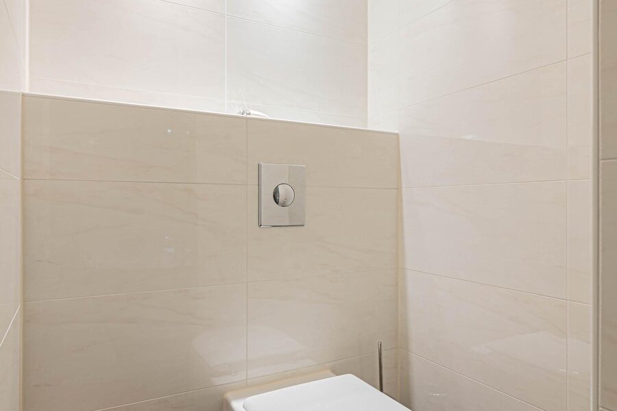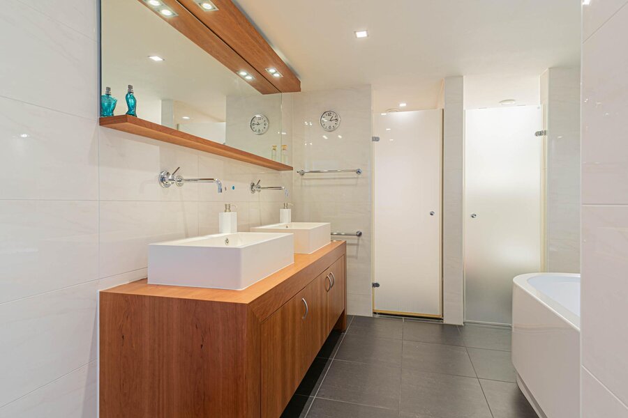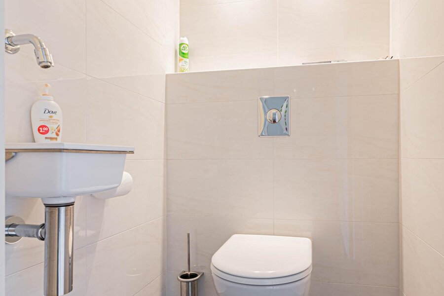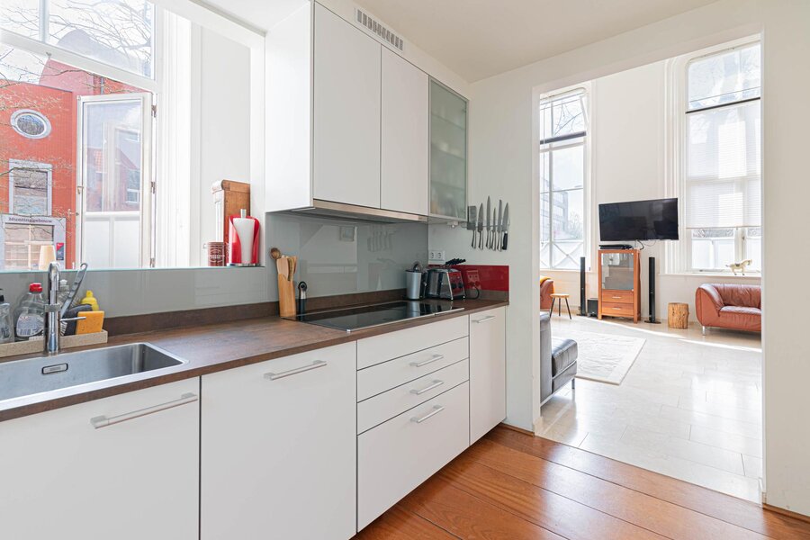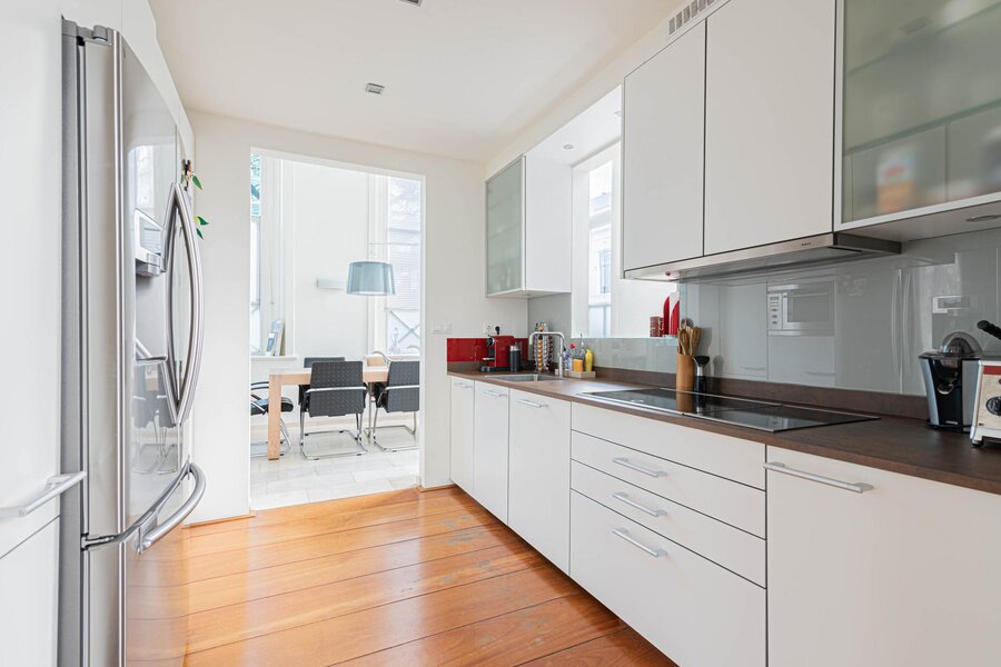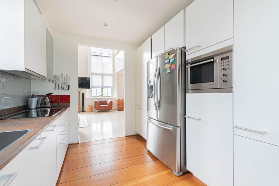 Tussen de woon- en eetkamer bevindt zich een moderne keuken, uitgerust met een inductie- én keramische kookplaat, combimagnetron, Amerikaanse koelkast en vaatwasser.