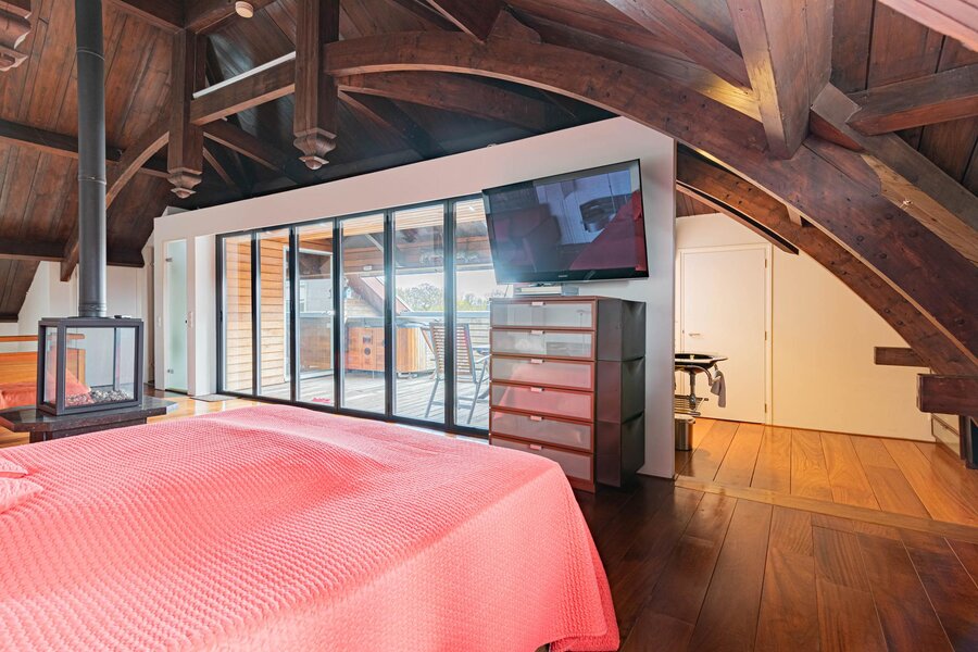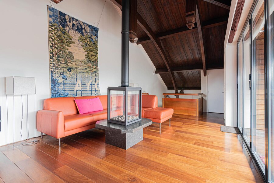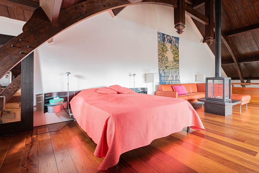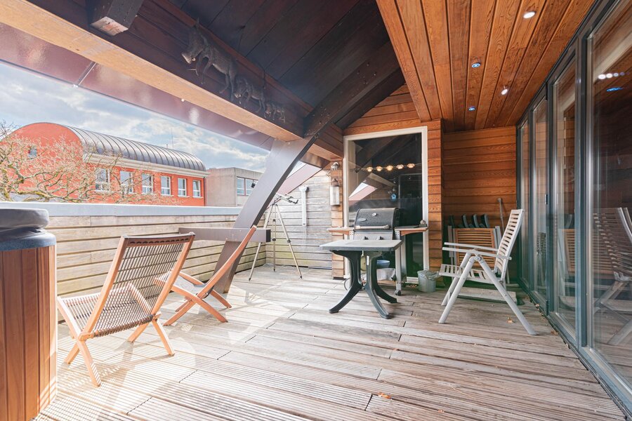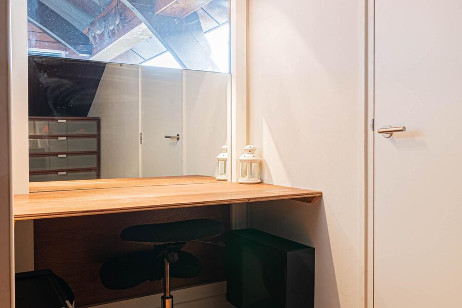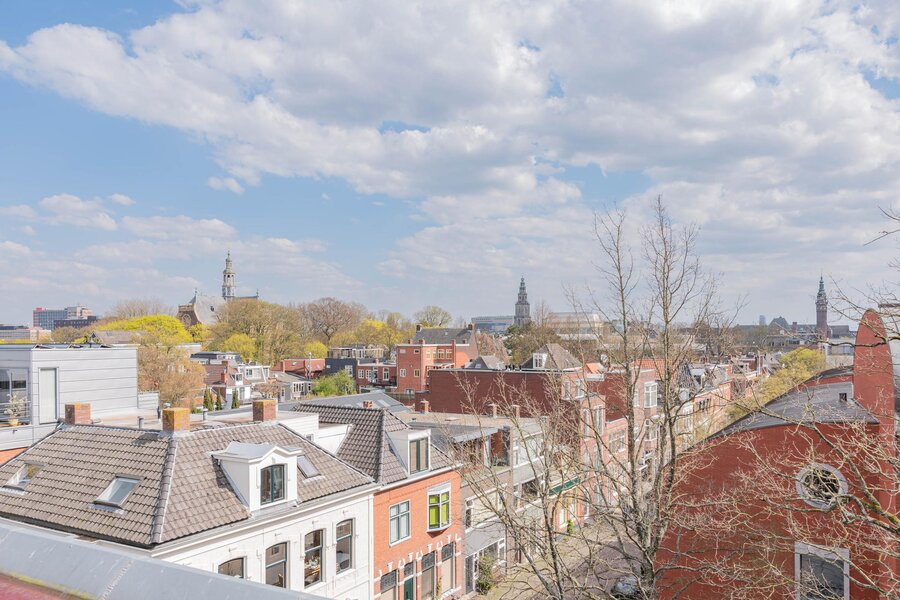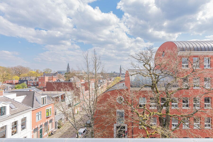 De bovenste verdieping is ingericht als studio met een ruime zithoek met design gashaard, slaapplek, wastafel en toegang tot een technische ruimte en berging. Blikvanger is hier de prachtige houten dakconstructie. Vanaf de loggia / het overdekte terras op het zuiden heeft u een weids uitzicht over de binnenstad en alle Groninger torens. De harmonica-pui kan in zijn geheel geopend worden waardoor je in de zomer overdekt buiten kan slapen.