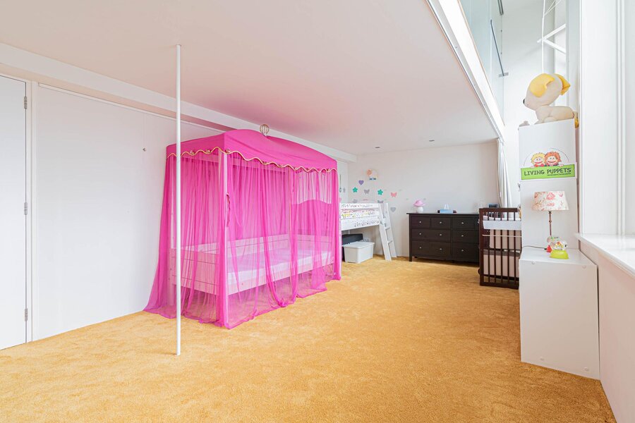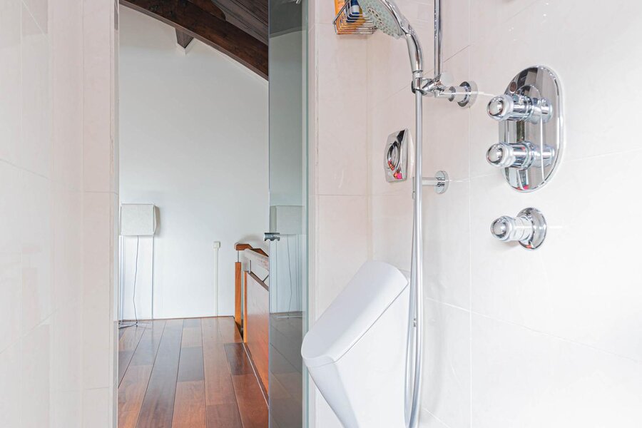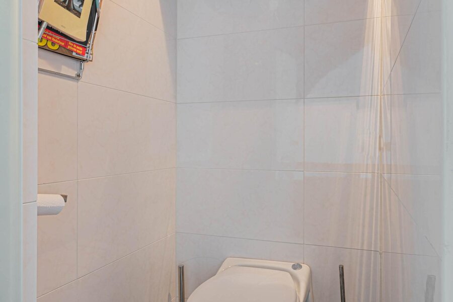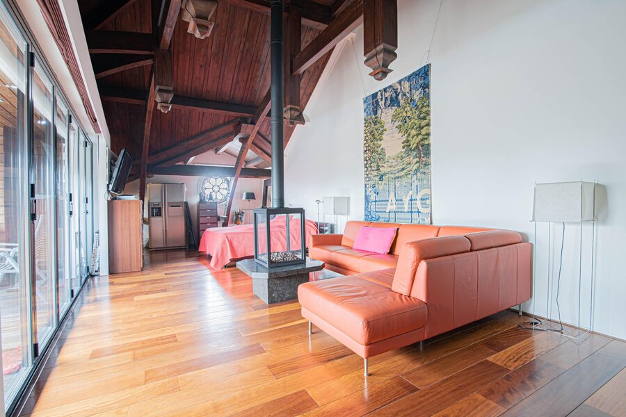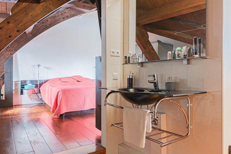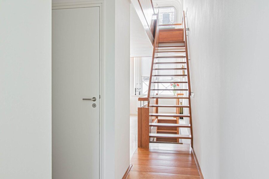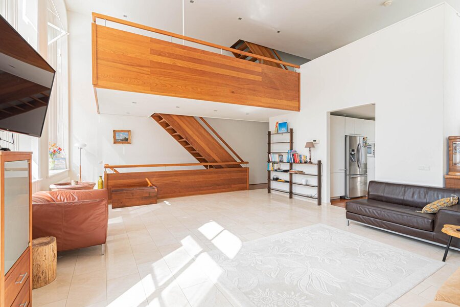 De bovenste verdieping is ingericht als studio met een ruime zithoek met design gashaard, slaapplek, wastafel en toegang tot een technische ruimte en berging. Blikvanger is hier de prachtige houten dakconstructie. Vanaf de loggia / het overdekte terras op het zuiden heeft u een weids uitzicht over de binnenstad en alle Groninger torens. De harmonica-pui kan in zijn geheel geopend worden waardoor je in de zomer overdekt buiten kan slapen.
