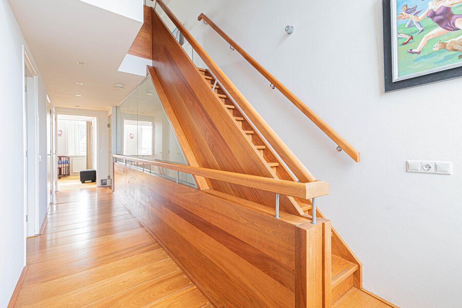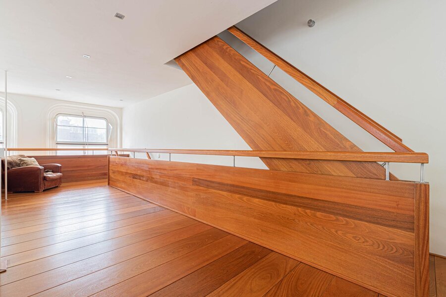 Een trappartij van hoogwaardig Braziliaans hardhout biedt toegang tot de mezzanine, die dienst kan doen als werk- of speelplek of tv-kamer. Ook de hier aanwezige massagefauteuils en tv blijven achter.