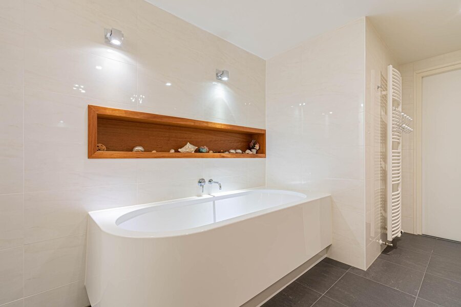 De eerste verdieping bestaat uit een lange overloop die toegang biedt tot twee riante slaapkamers, een toilet en de ruime badkamer. De badkamer beschikt over een ligbad, douchecabine, toilet, dubbel wastafelmeubel en vloerverwarming.