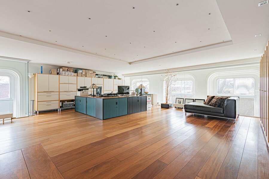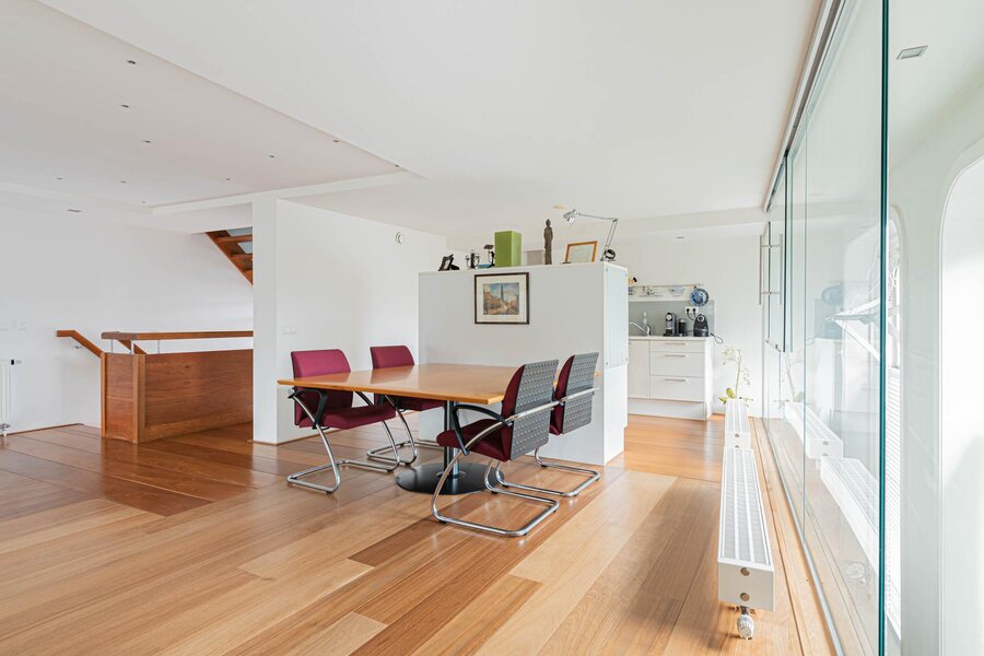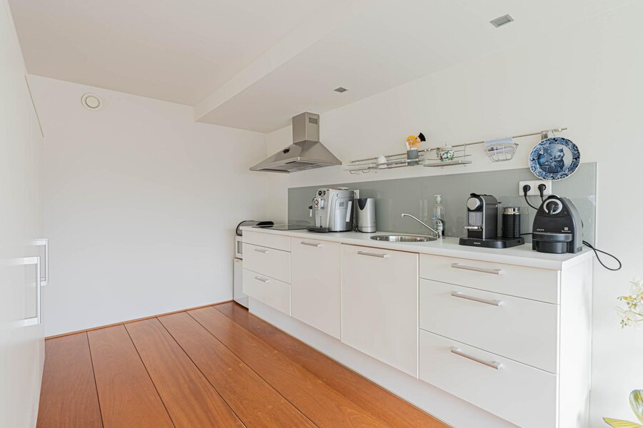Deze grote open ruimte is nu ingericht als kantoor en beschikt over een eigen keuken met inductiekookplaat, afzuigkap, magnetron, koelkast en vaatwasser.