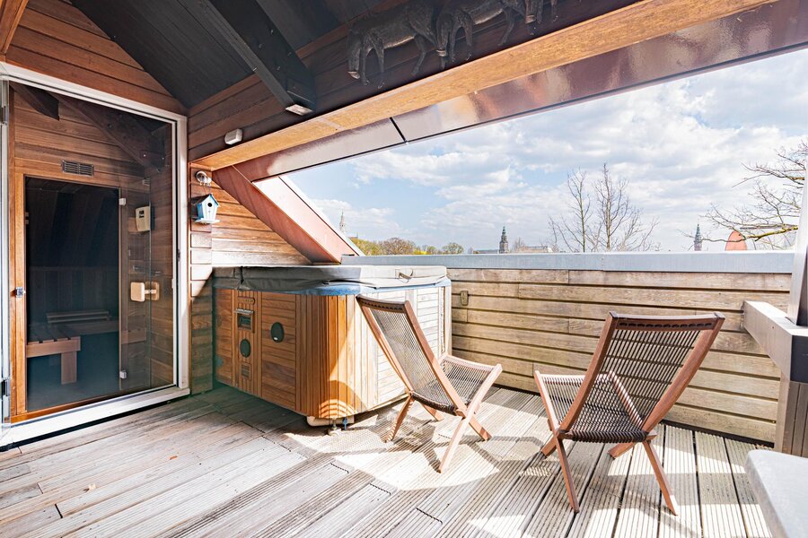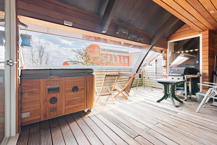* Overdekt dakterras op het zuiden met jacuzzi, sauna en weids uitzicht;