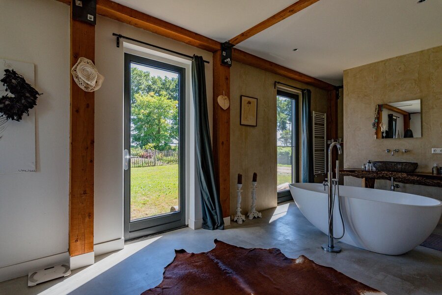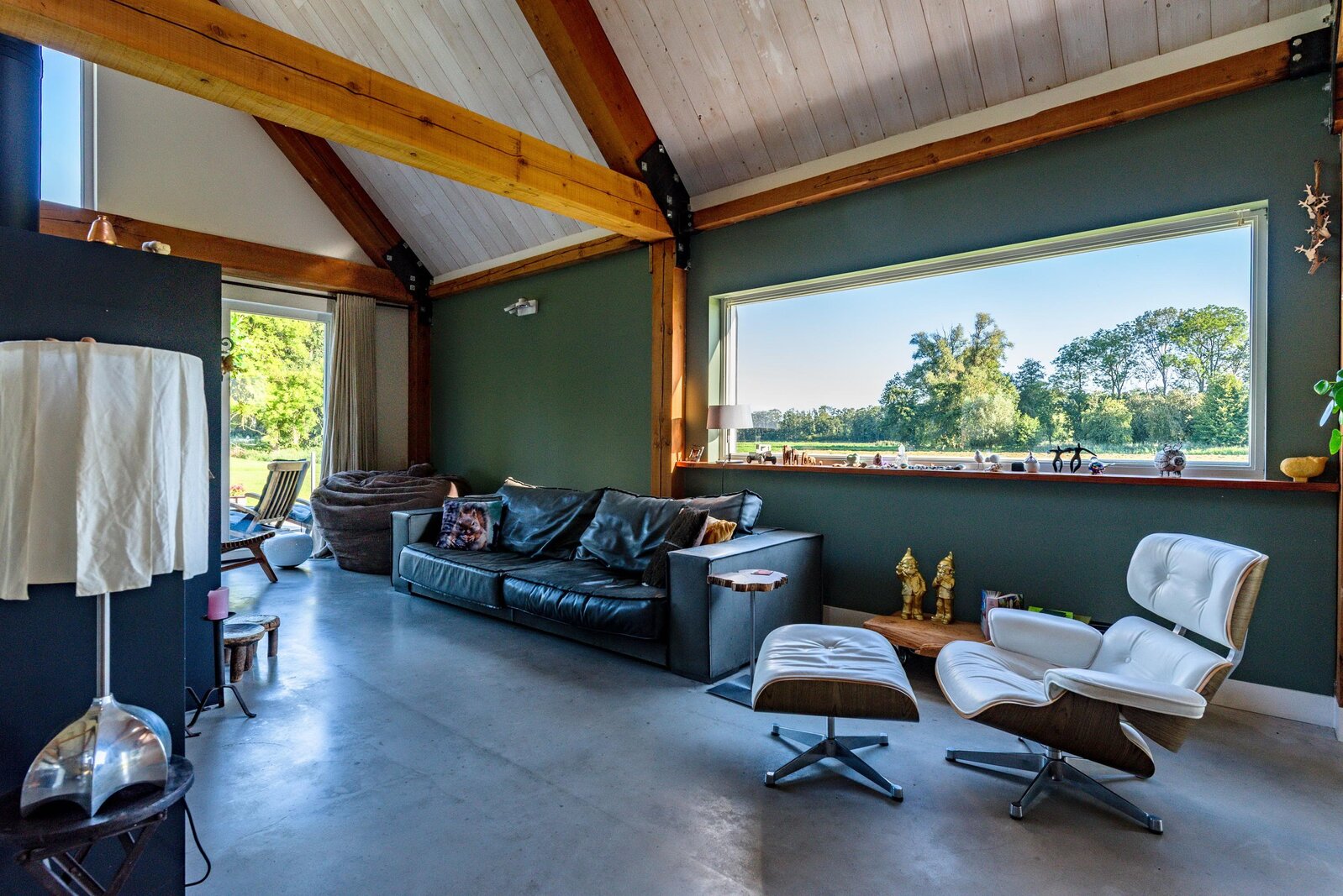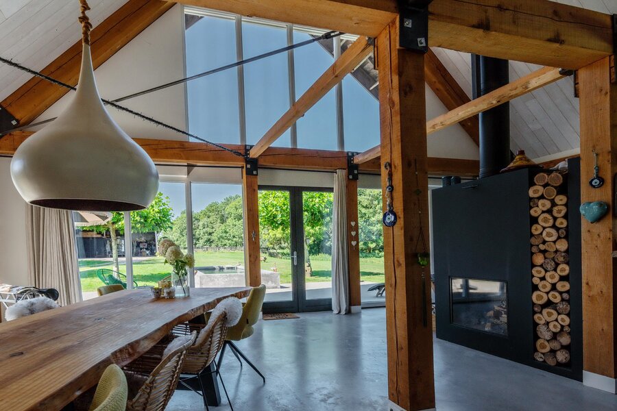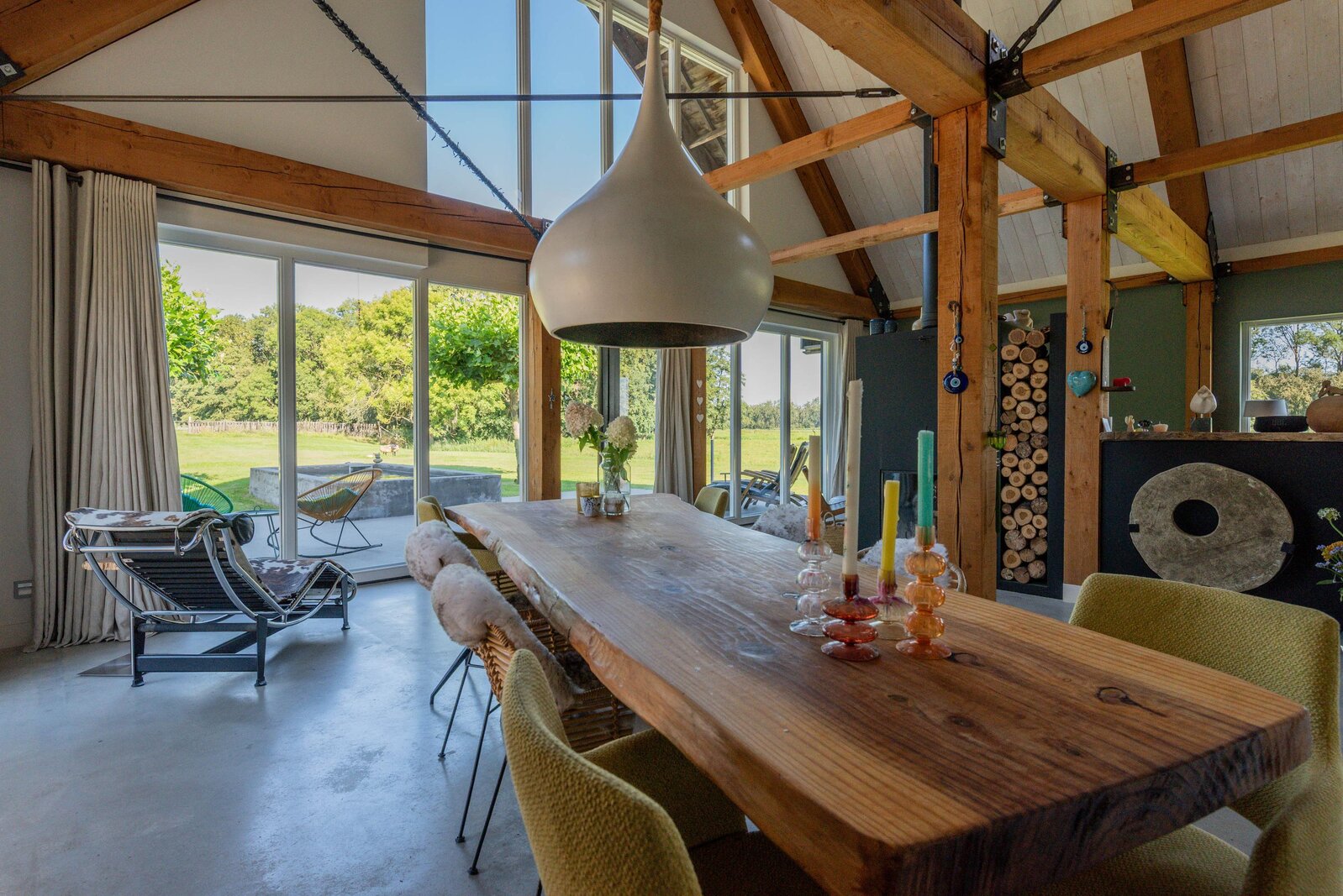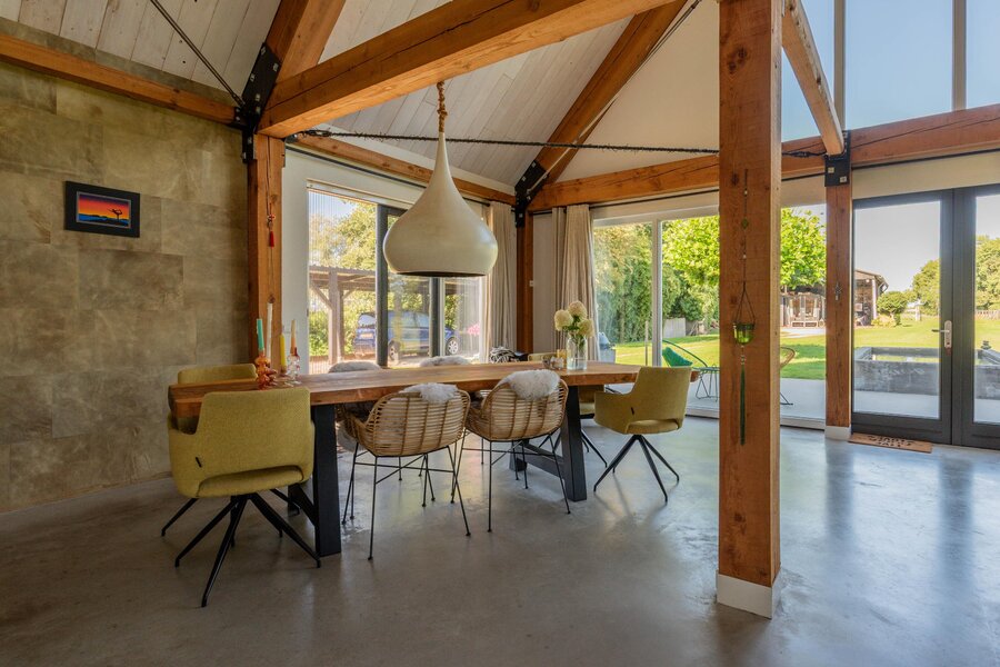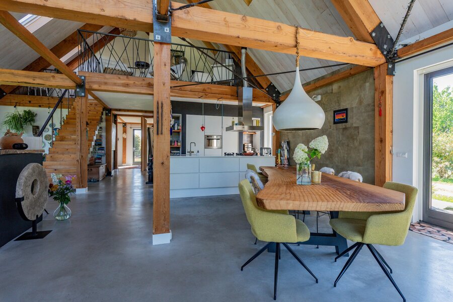 Door het gebruik van de robuuste spanten en natuurlijke materialen ademt de woning de sfeer uit van een woonboerderij. De betonnen vloer is voorzien van comfortabele lage temperatuur vloerverwarming