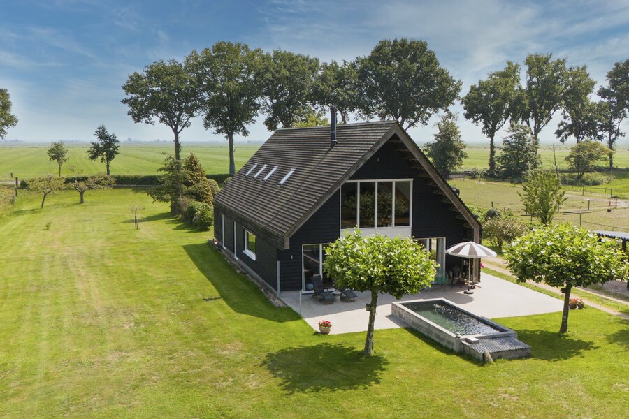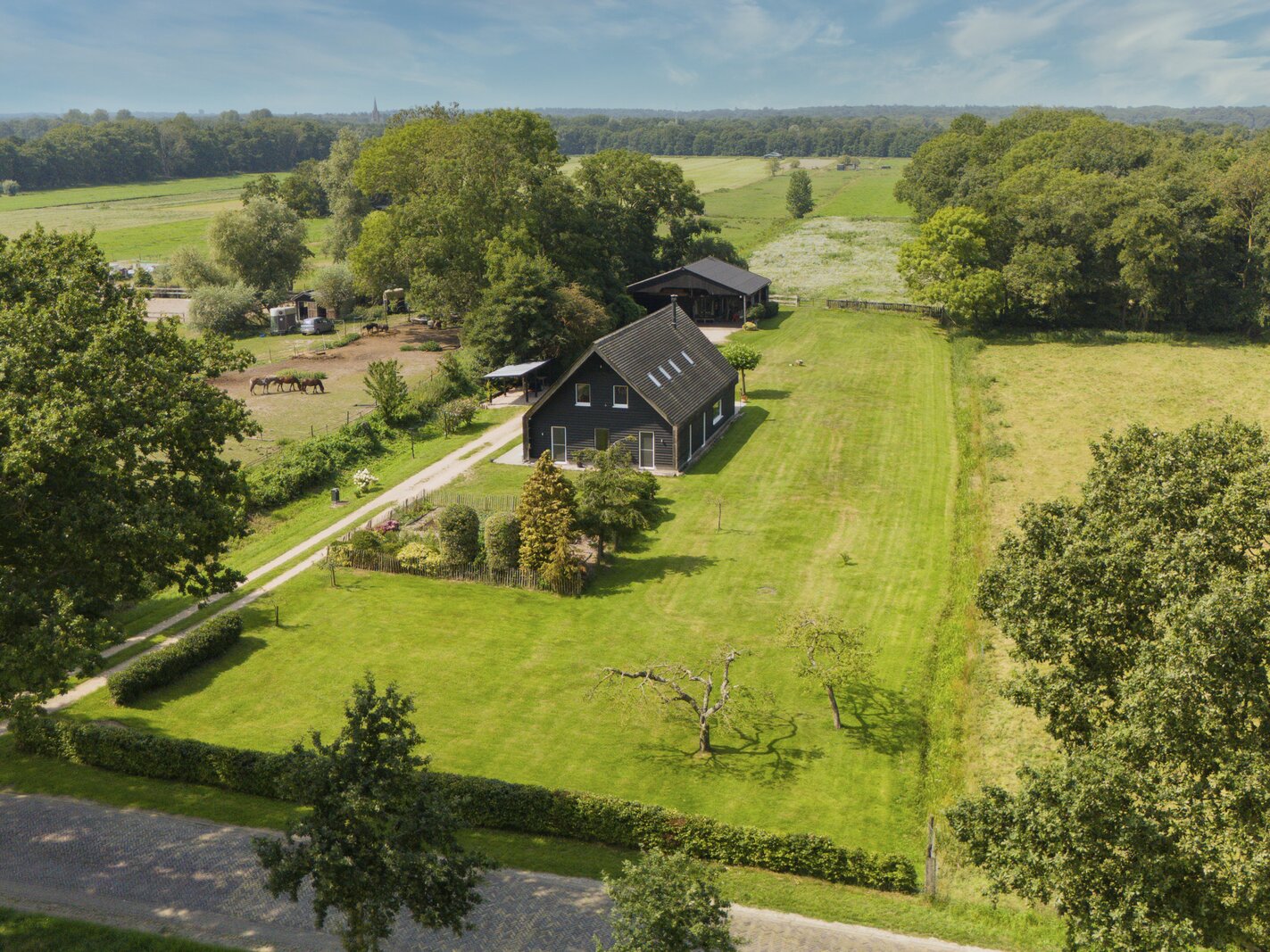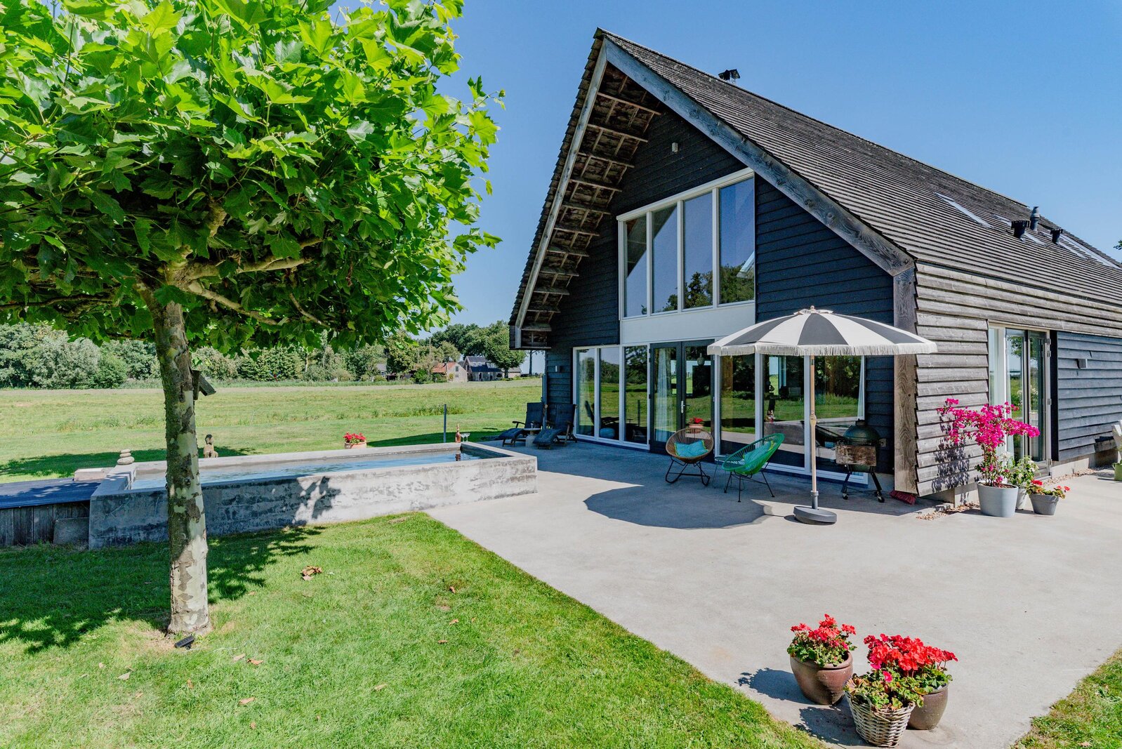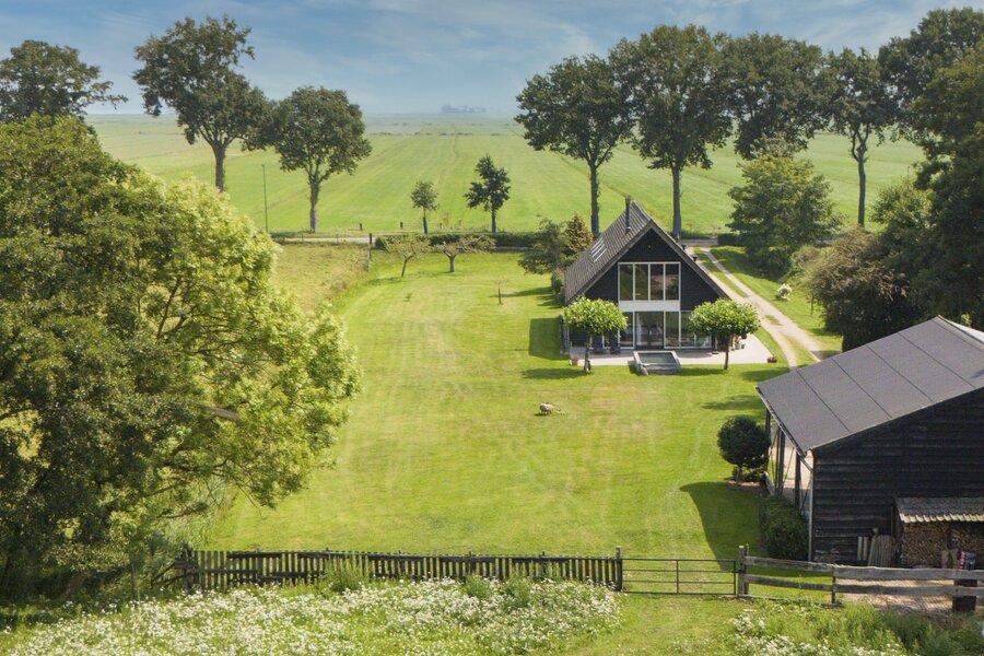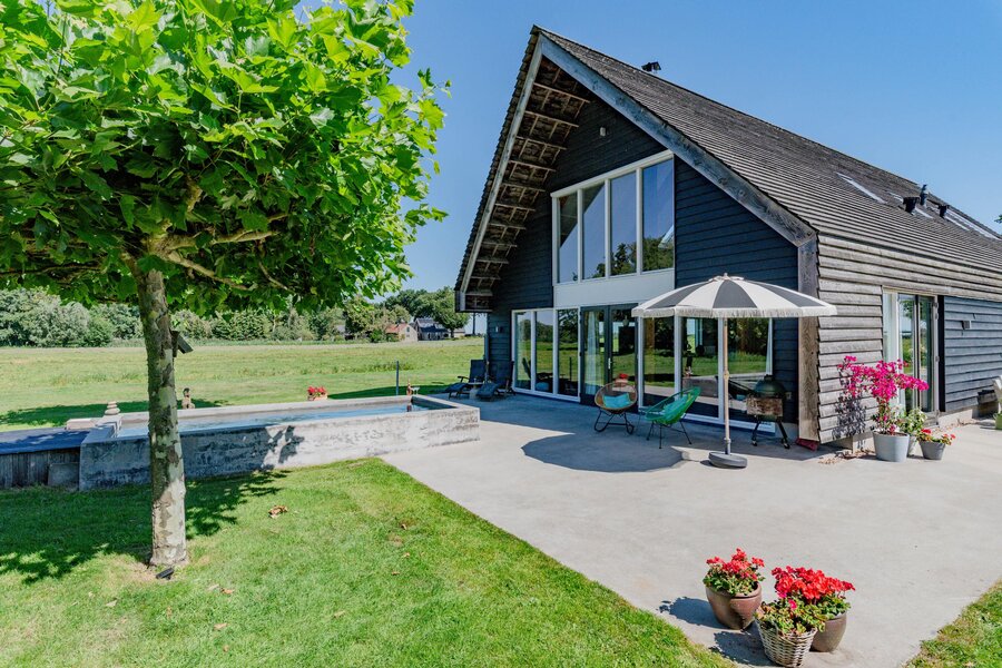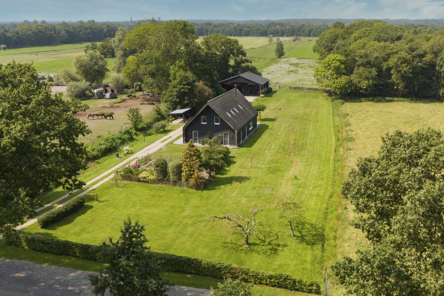 Door het gebruik van de robuuste spanten en natuurlijke materialen ademt de woning de sfeer uit van een woonboerderij. De betonnen vloer is voorzien van comfortabele lage temperatuur vloerverwarming