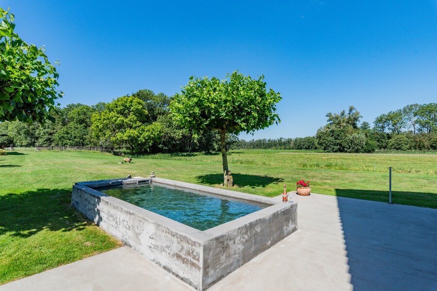 De verzorgde tuin rondom bestaat uit weiland met aan de achterzijde een drinkpoel voor paarden, een moestuin, diverse terrassen, zwembad (5x3) en een carport.