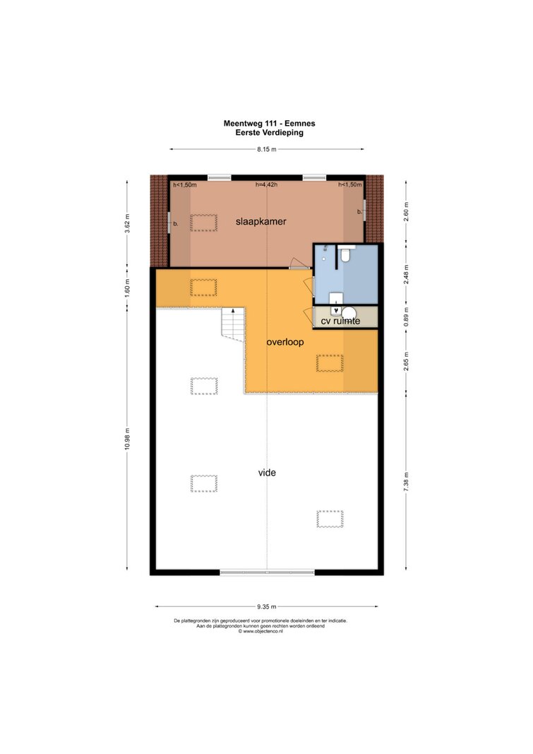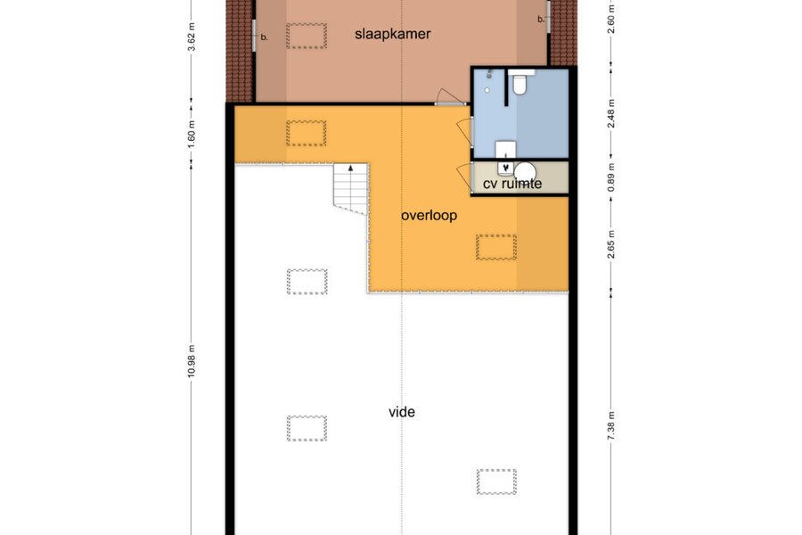 De woning heeft thans twee slaapkamers, er is voldoende ruimte om op een eenvoudige wijze nog twee slaapkamers te realiseren met het behoudt van de doorkijk naar de begane grond.