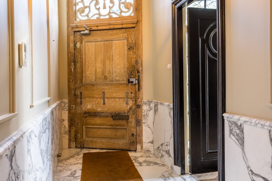 Vanaf de straatzijde leidt een fraaie bordestrap naar de hoofdentree van dit huis. Bij binnenkomst in de imposante hal, wordt u direct verrast door het prachtige marmer; zowel de vloer als de wanden zijn uitgevoerd in wit marmer. Door de fraaie hoogte komen de kroonluchters perfect tot hun recht.