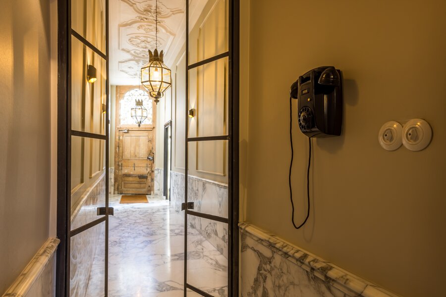 From the street, a charming staircase leads to the main entrance of the house. Upon entering the impressive hallway, you are immediately struck by the beautiful marble; both the floor and walls are crafted in white marble. The high ceilings perfectly showcase the elegant chandeliers.